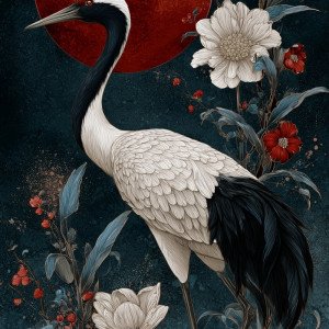 Иллюстрация японского журавля, красной луны и белых цветов в тёмно-синей и светло-чёрной палитре.