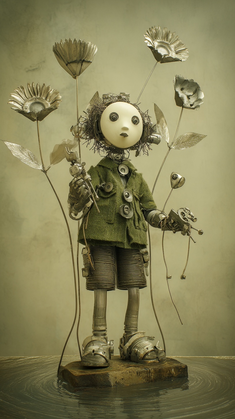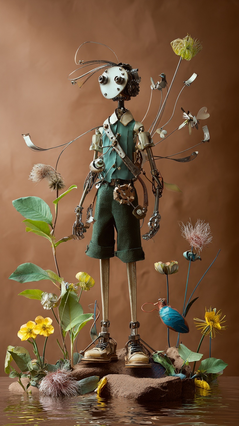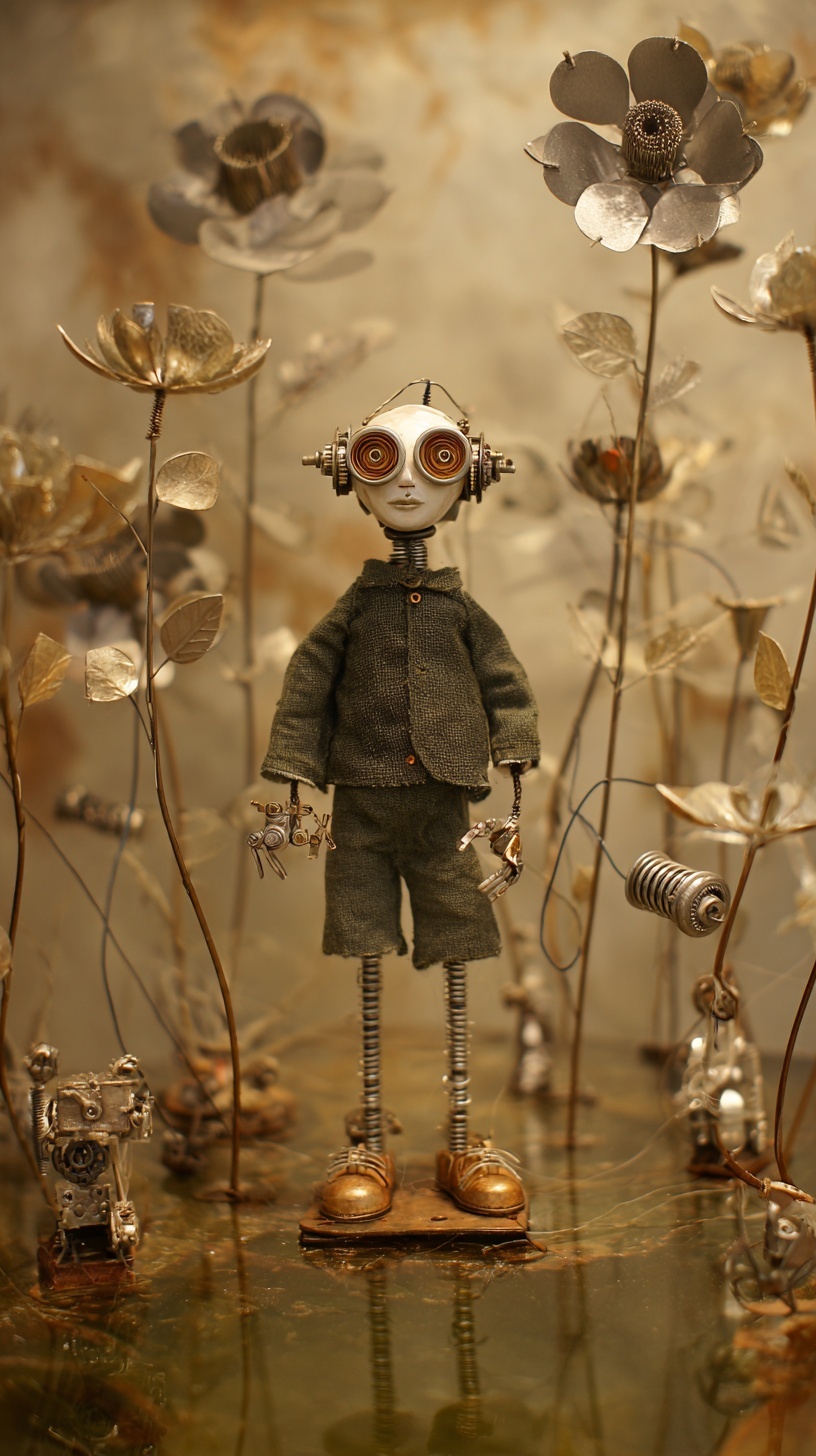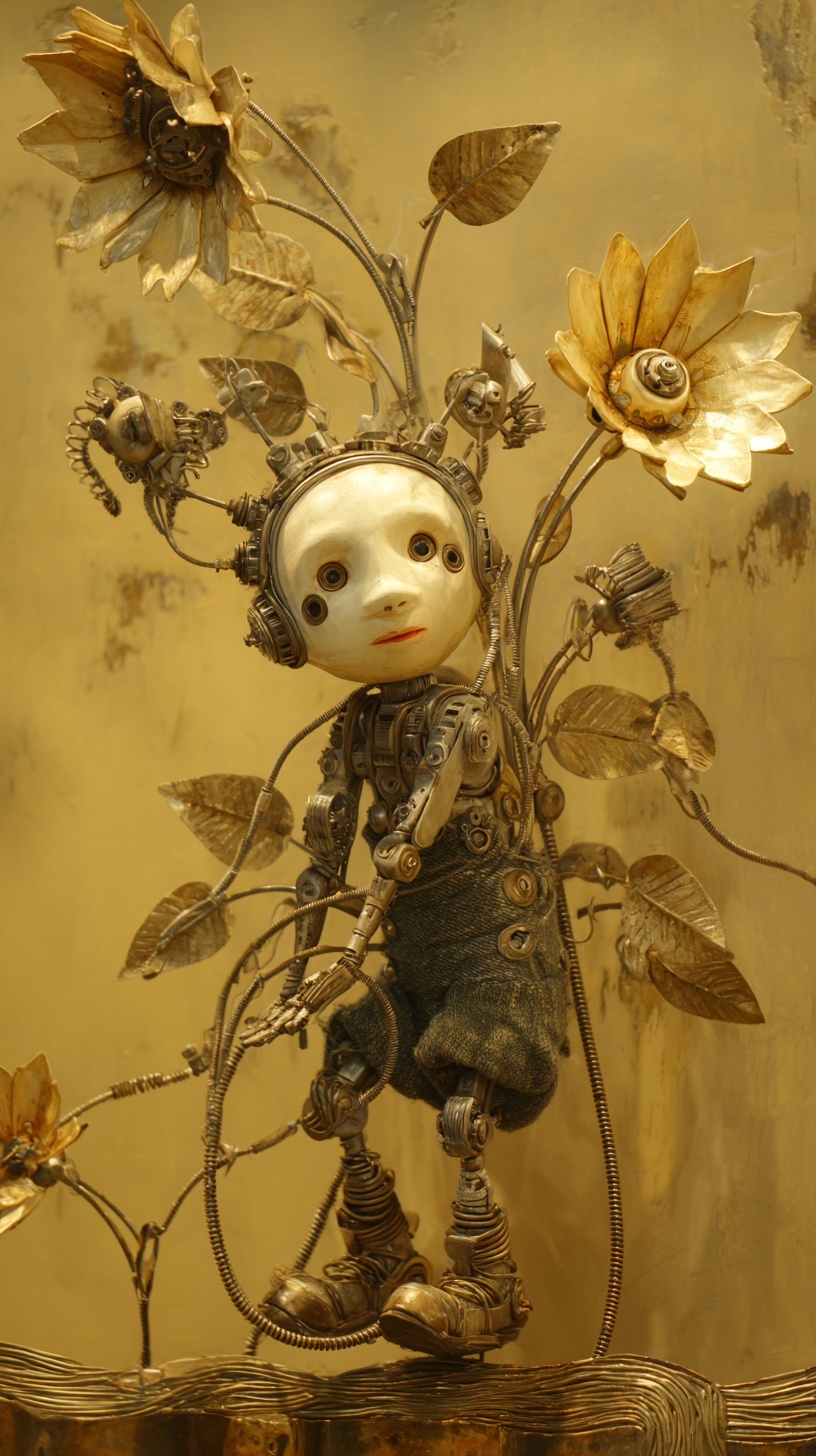 Мальчик-игрушка с лицом-маской, сделанный из различных механизмов и шестерёнок, в деревянной обуви и тканной одежде.