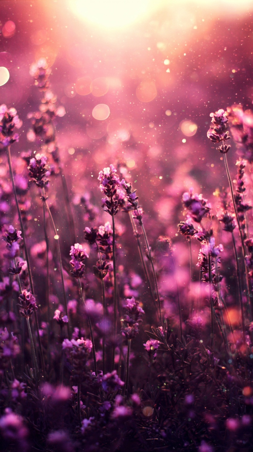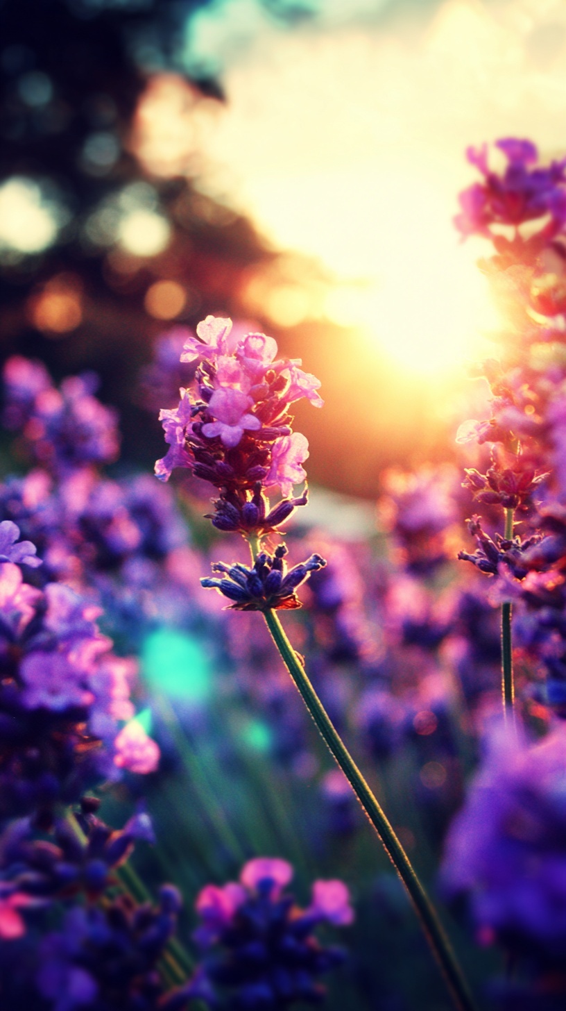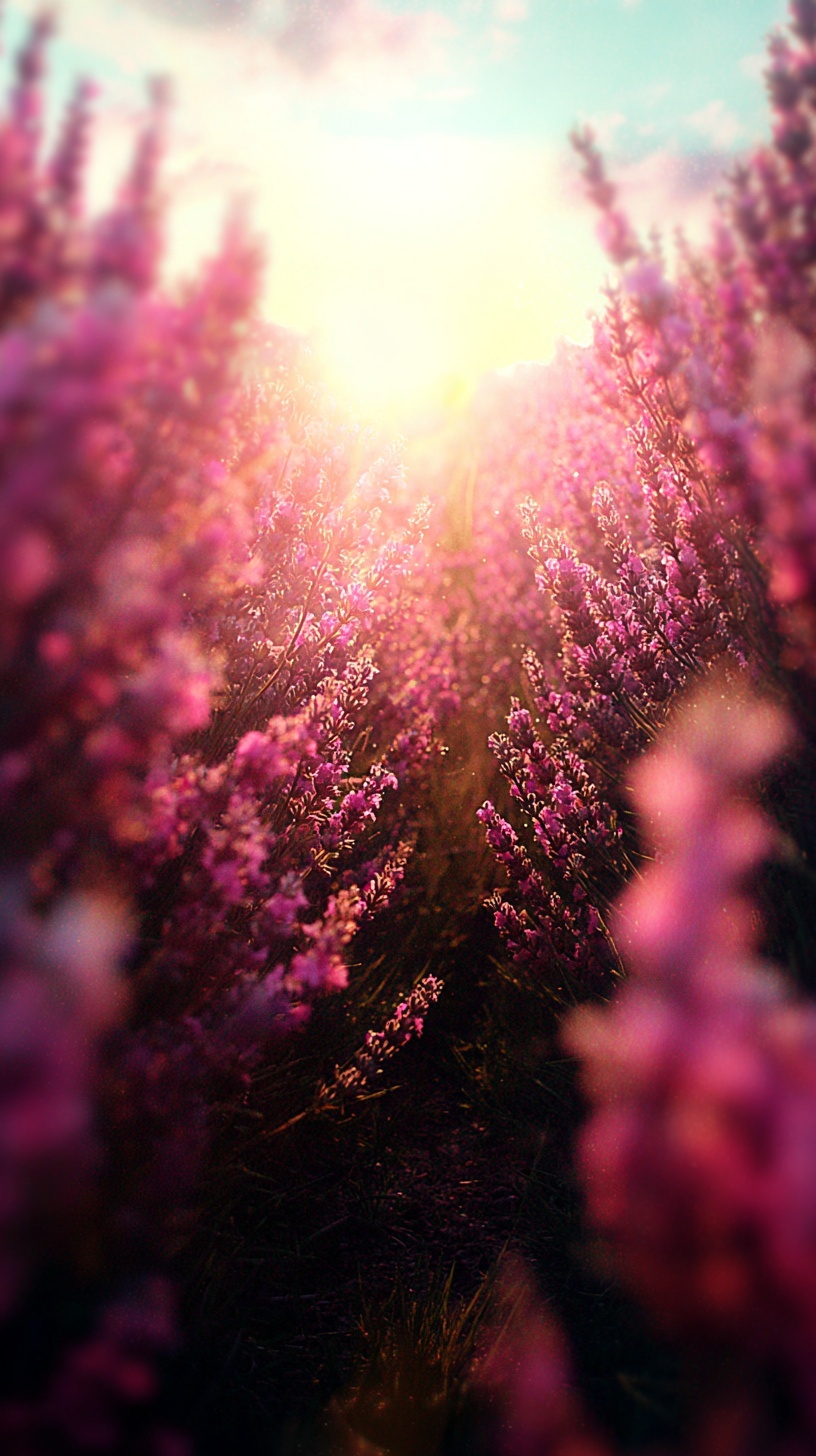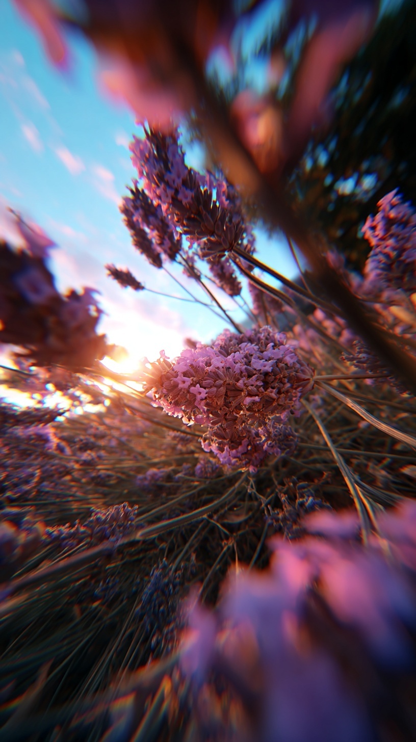 Нижний ракурс изнутри лавандового поля: камера на уровне цветов, мягкое боке, солнце в контровом свете.
