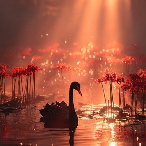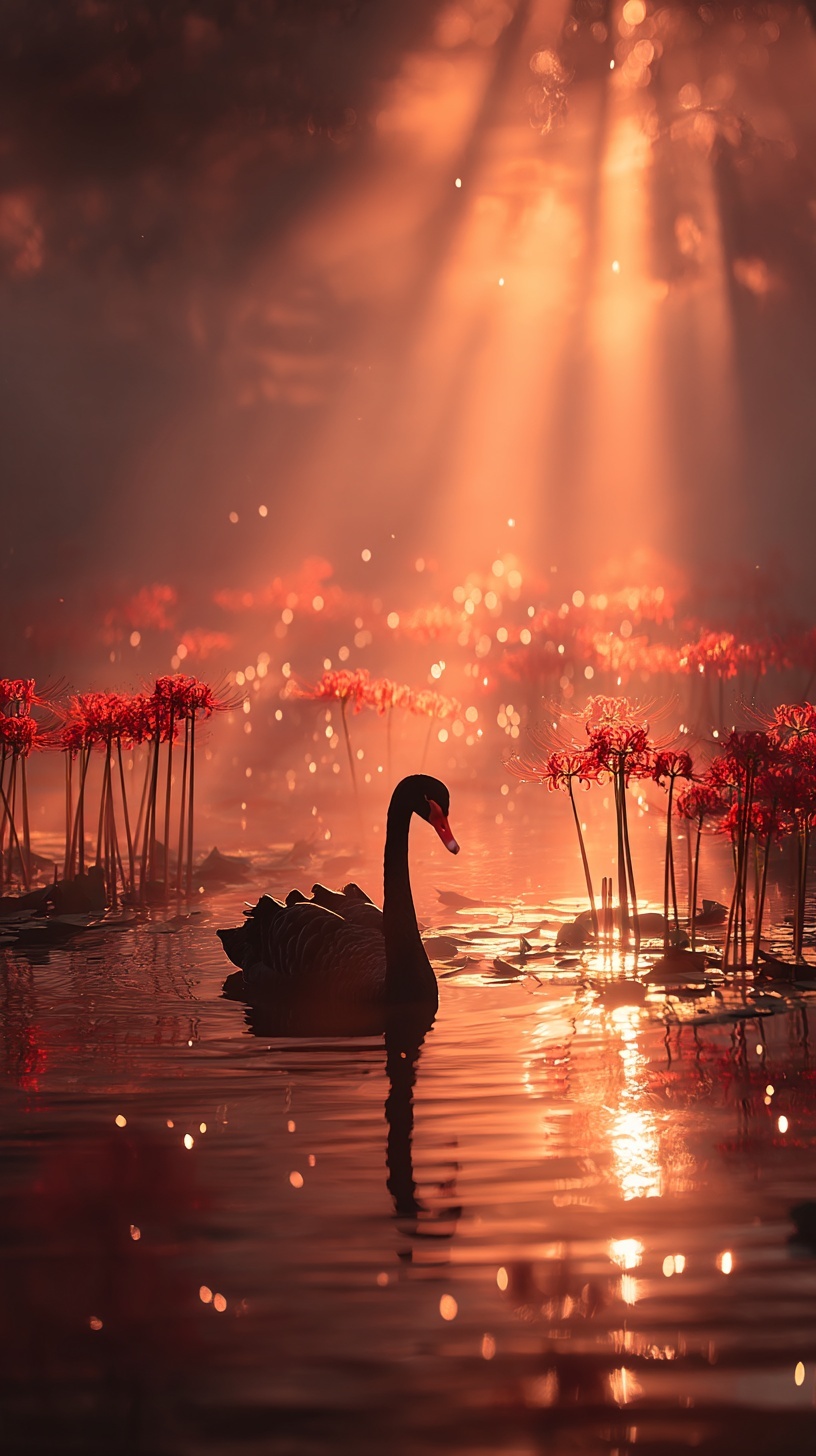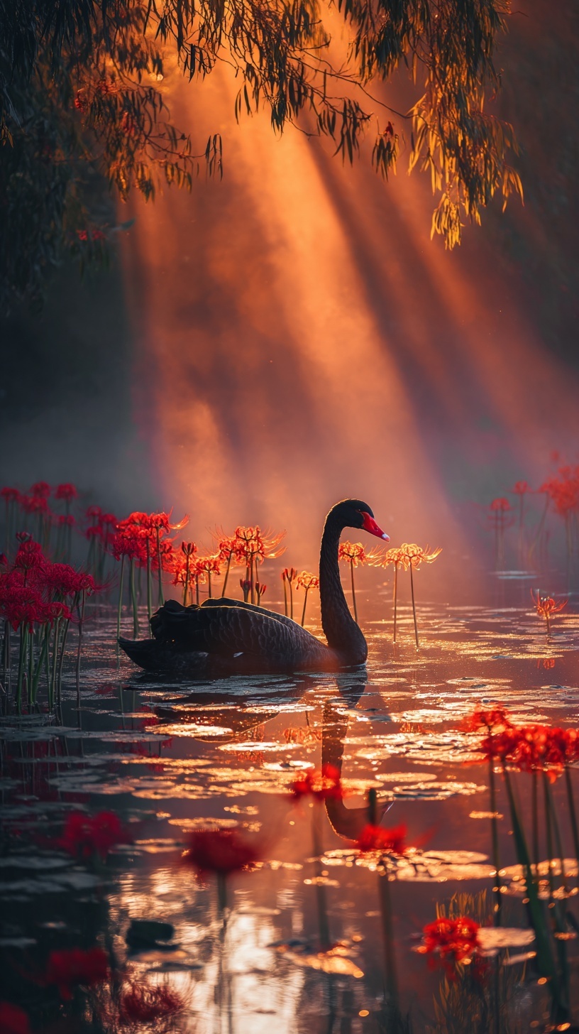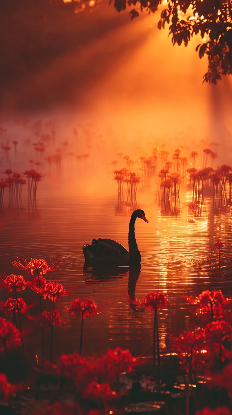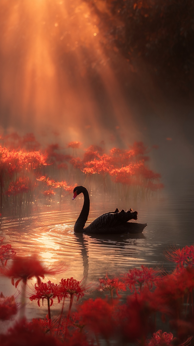 Чёрный лебедь плывёт по туманному озеру, окружённому красными ликорисами.