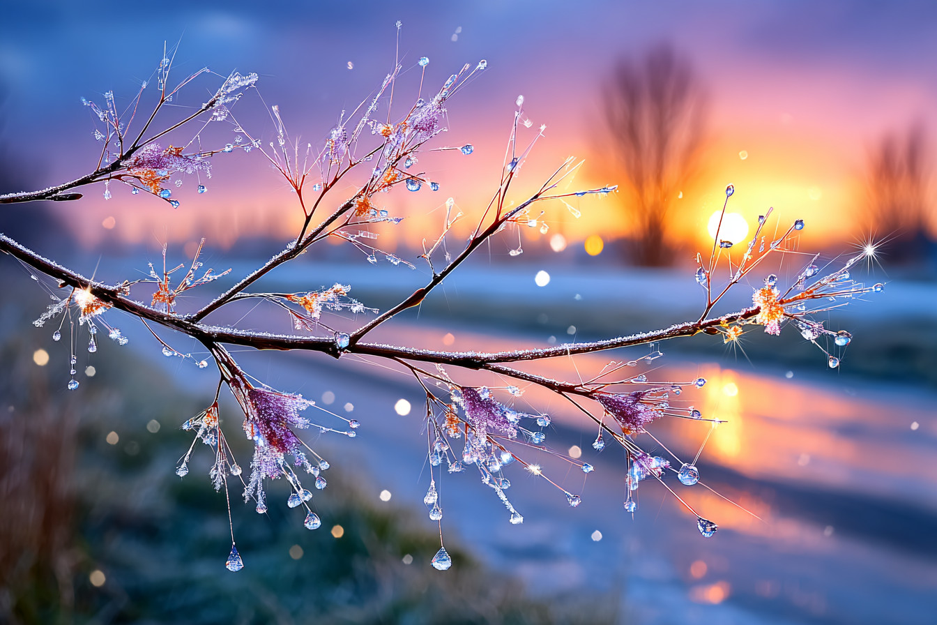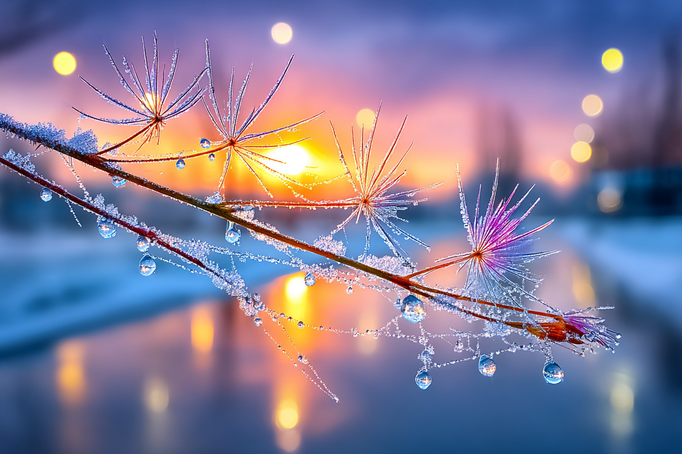 Макросъемка замерзшей паутины, покрытой инеем и утренней росой. Мягкое боке с тёплым светом восхода, ледяные кристаллы.