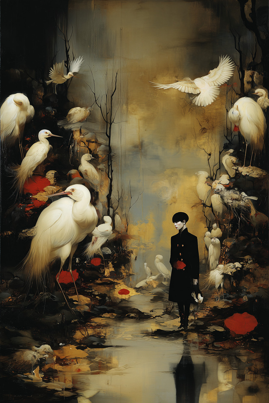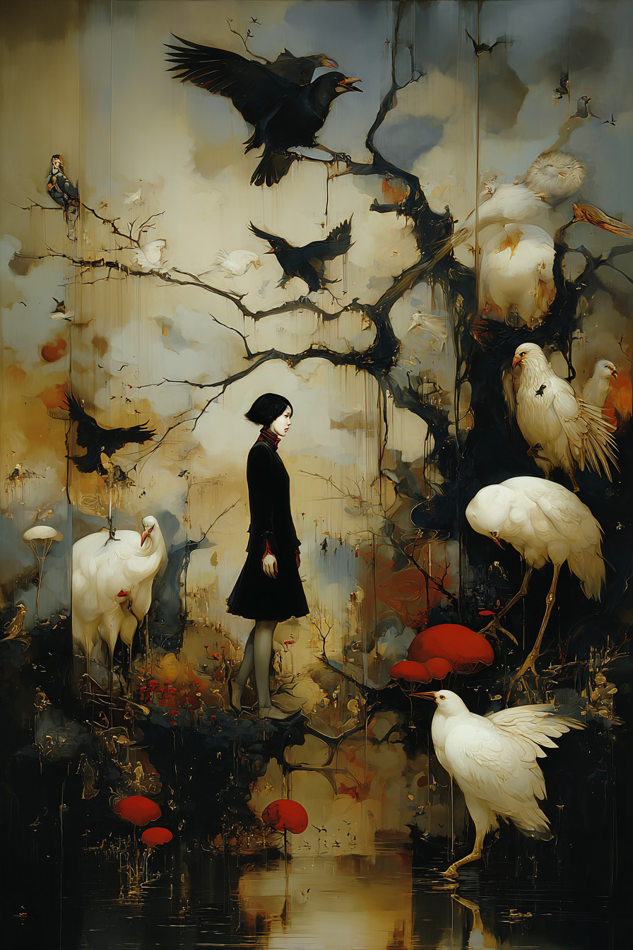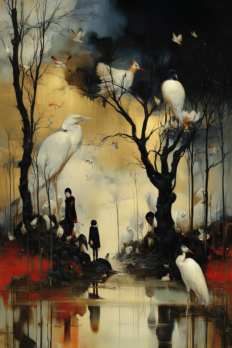 Таинственная картина в стиле Джеймса Джина: странные существа в лесу на болоте, чёрные деревья с белыми птицами, маленькая фигура путника.