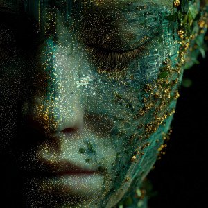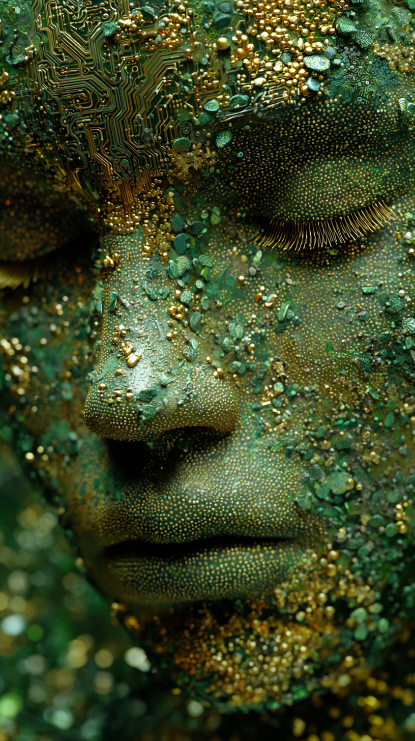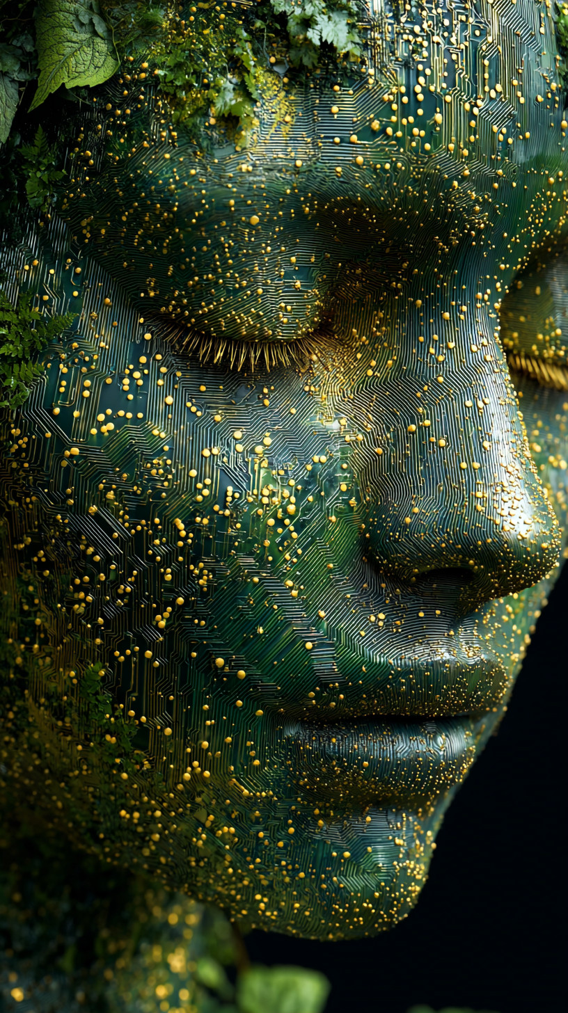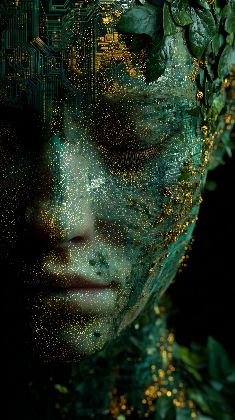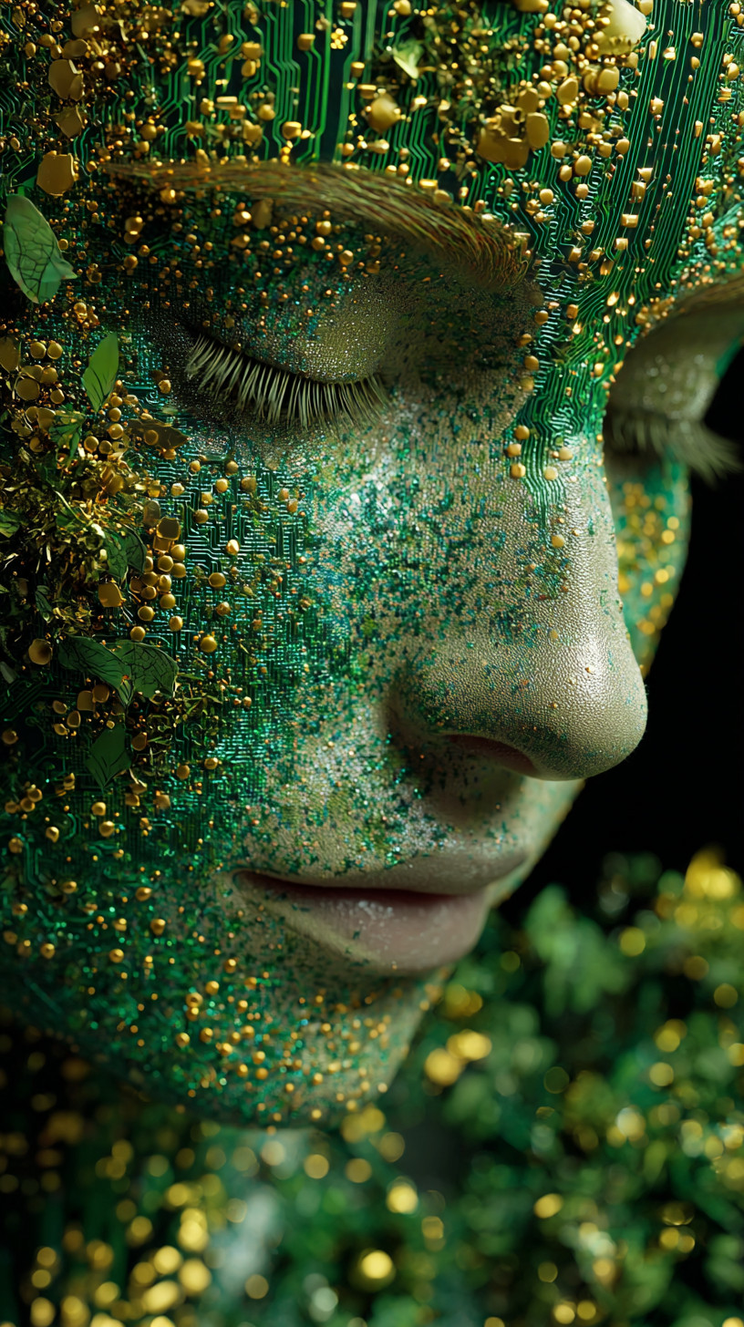 Изображение лица, полностью состоящего из светящихся лесных зелёных и золотых частиц с микросхемами.