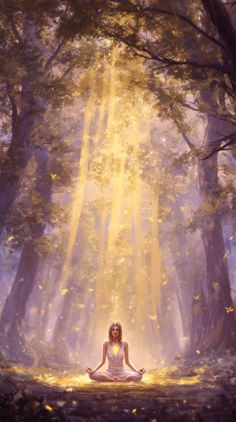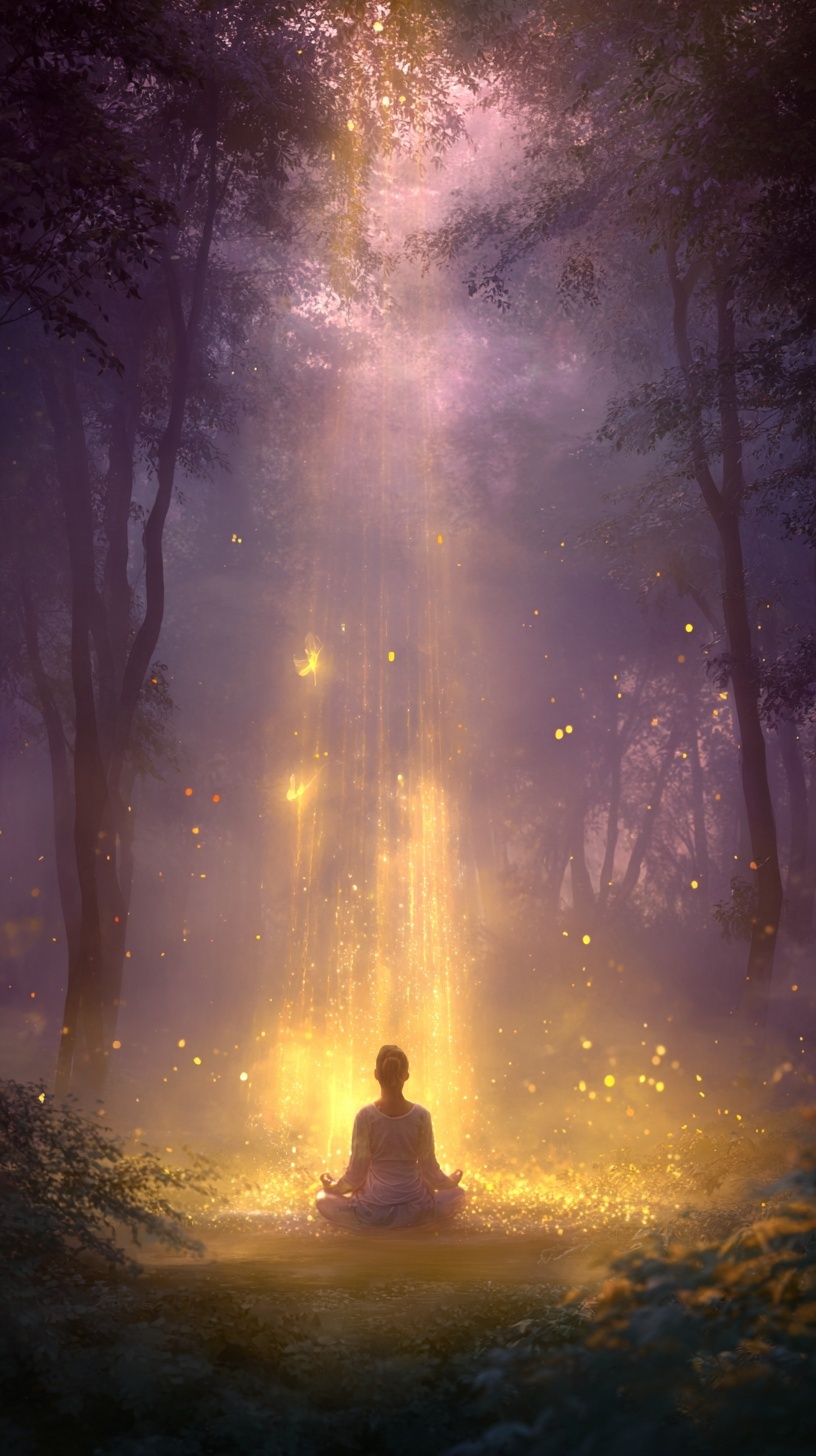 Женщина в медитации с золотым свечением, огоньки, туман и лучи света.