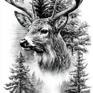 Голова оленя в верхней части, внизу одинокий турист, видимый со спины, на туманной лесной тропе.