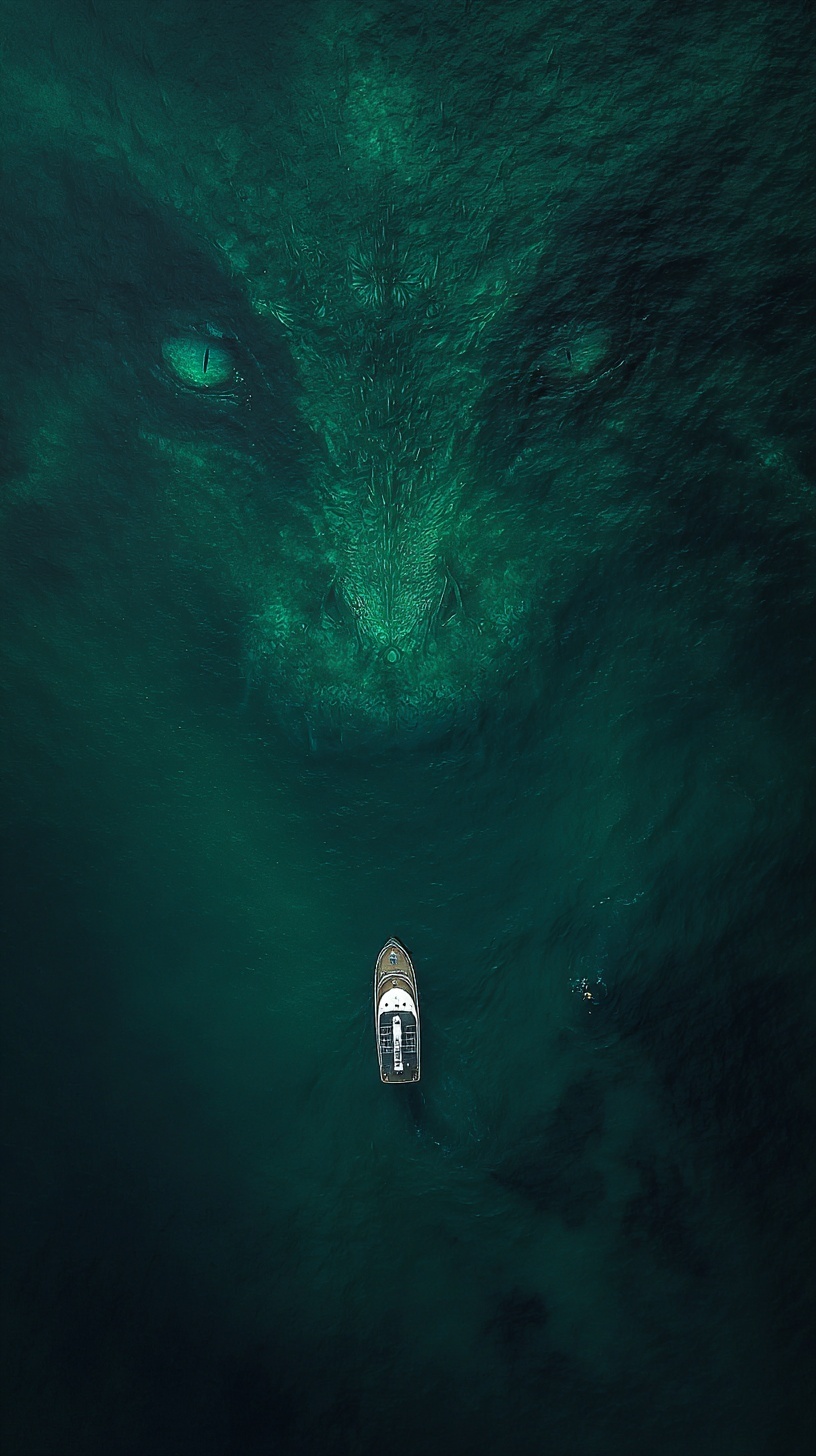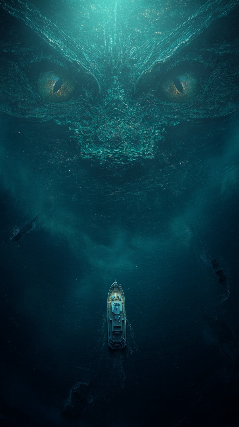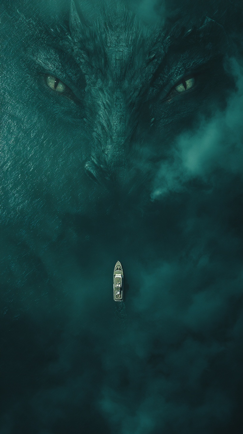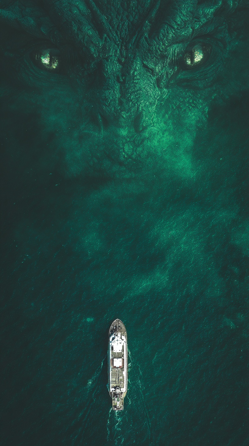 Аэросъемка глубокого моря с кораблем и головой дракона.