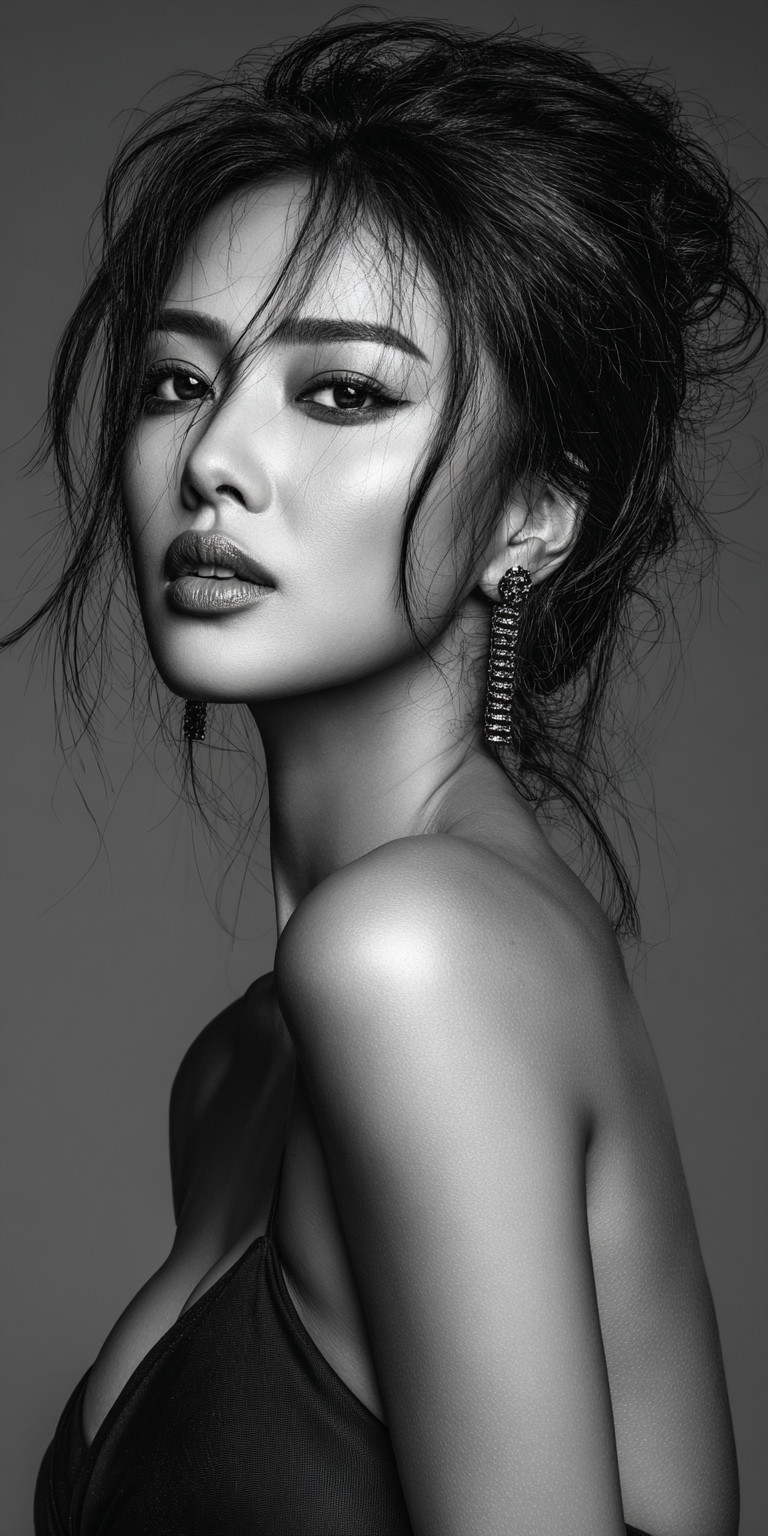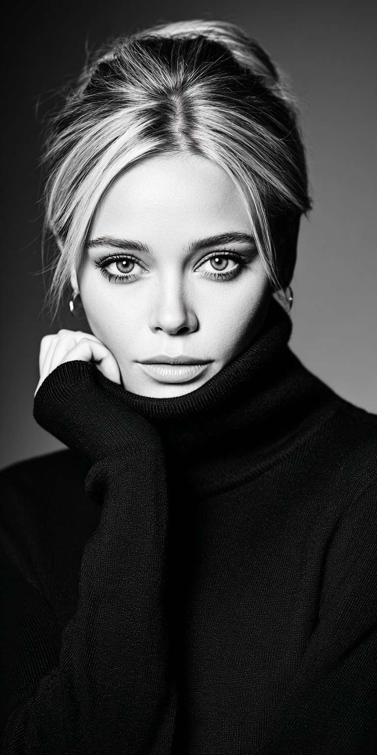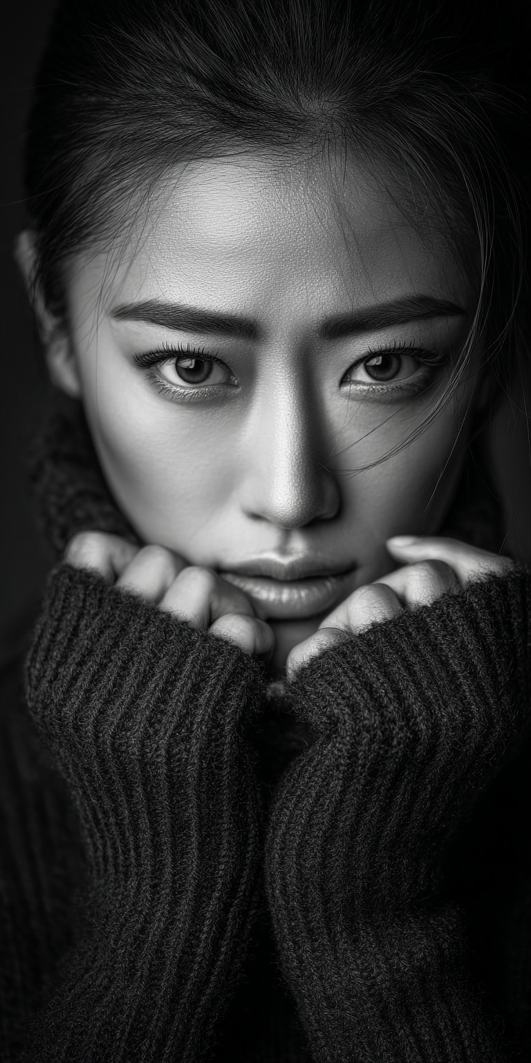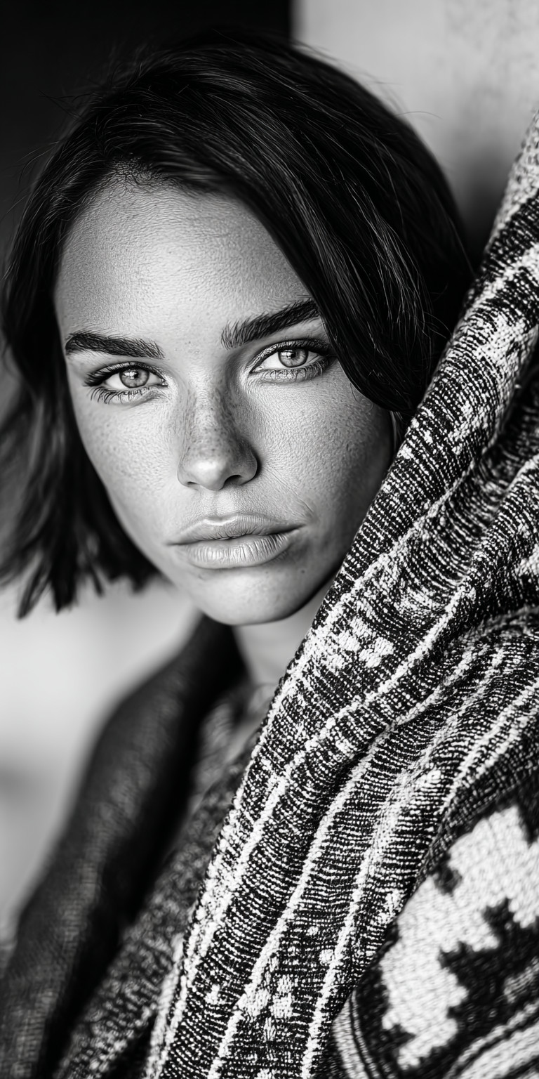 Фэшн-фотография, модель снятая в анфас крупным планом. Монохромная гамма