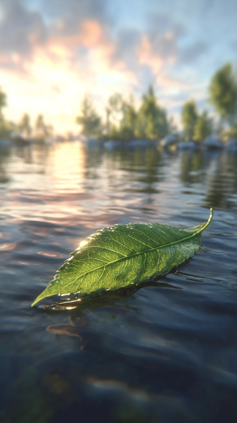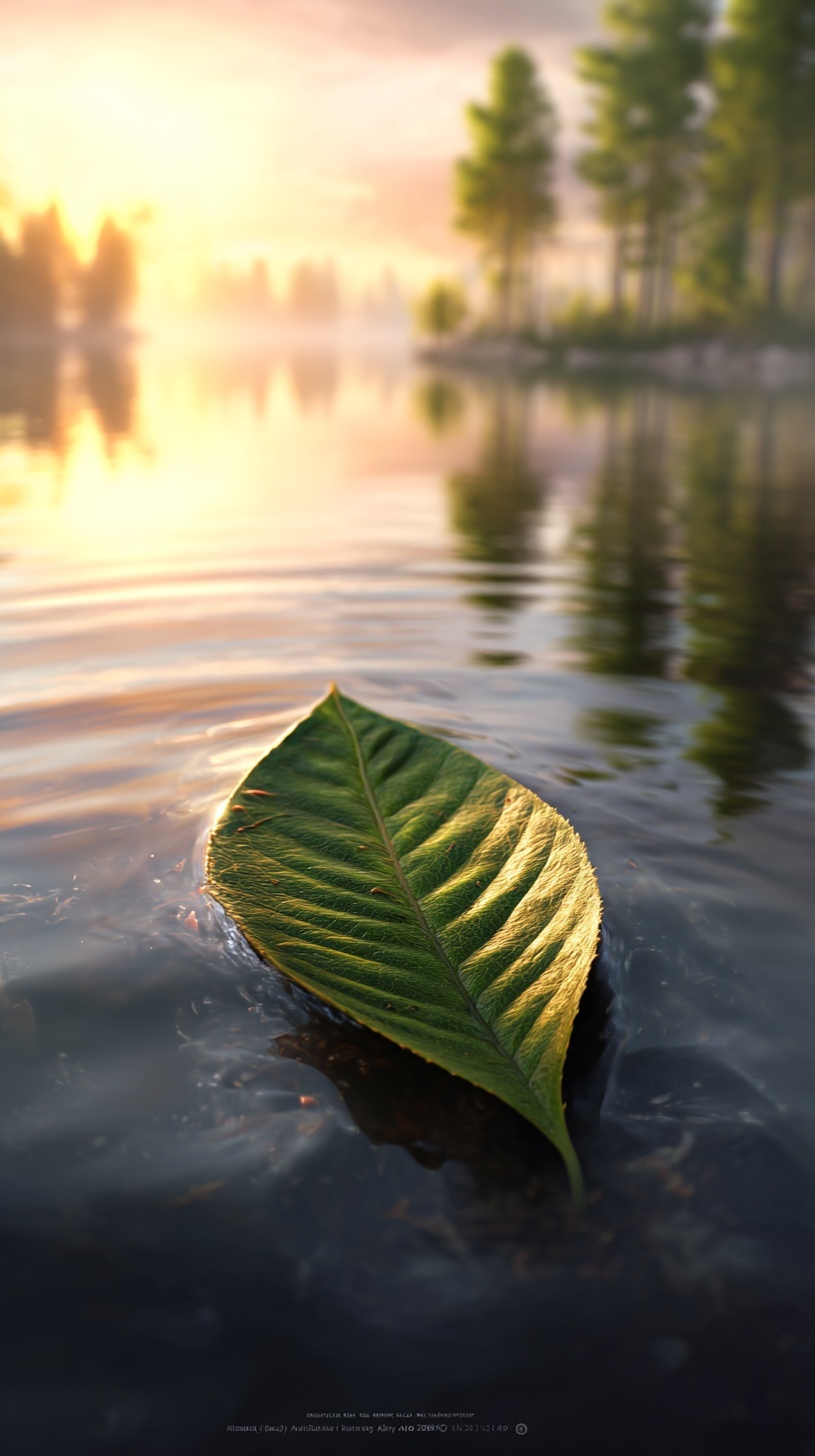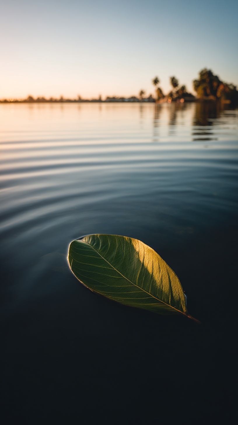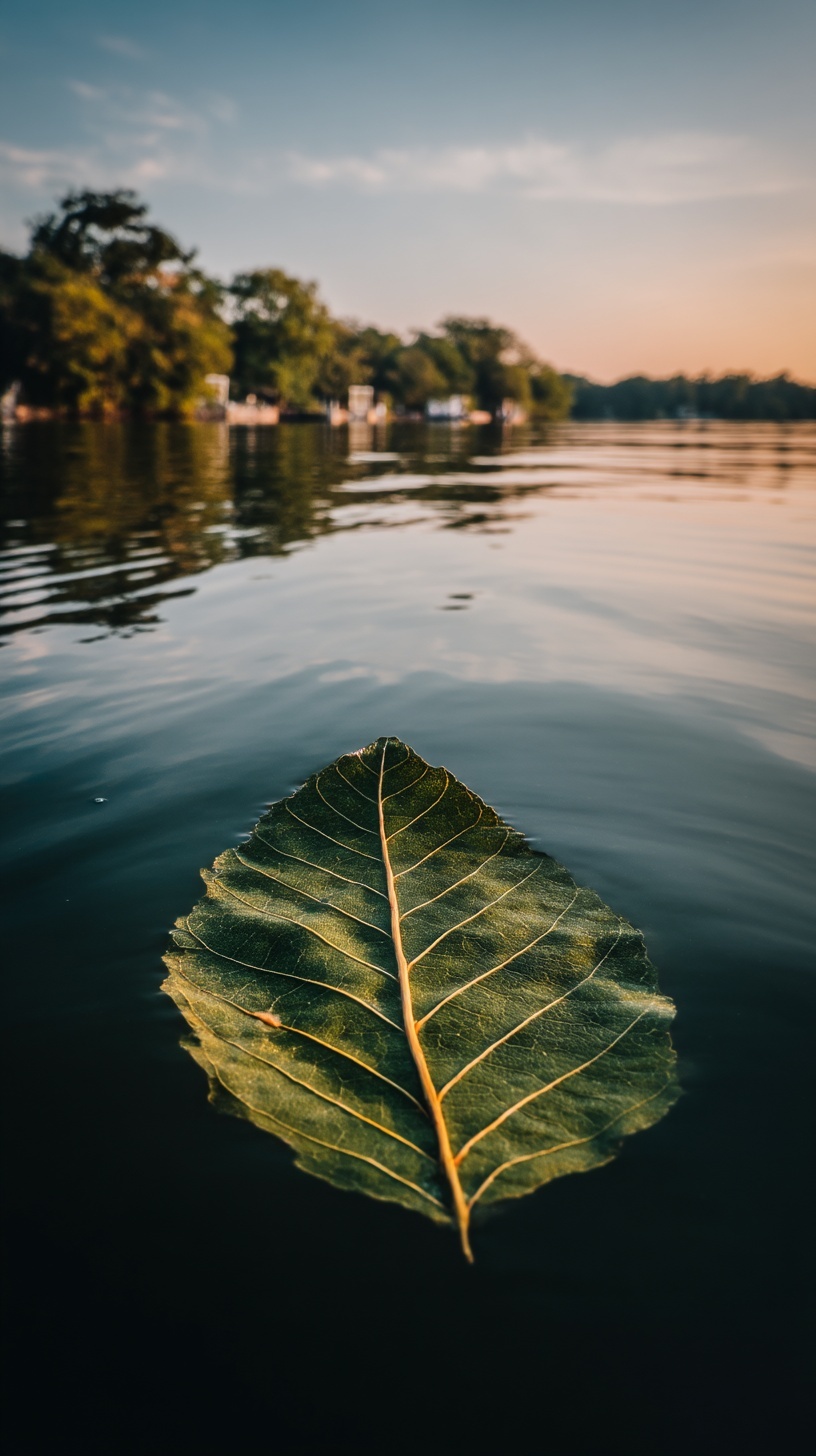 Фотография зелёного листа в форме лодочки, плывущего по спокойному озеру. Тёплый свет золотого часа, отражения в воде, мягкое небо.