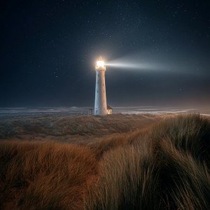 Величественный маяк на дюне ночью, его луч ярко светит над океаном.