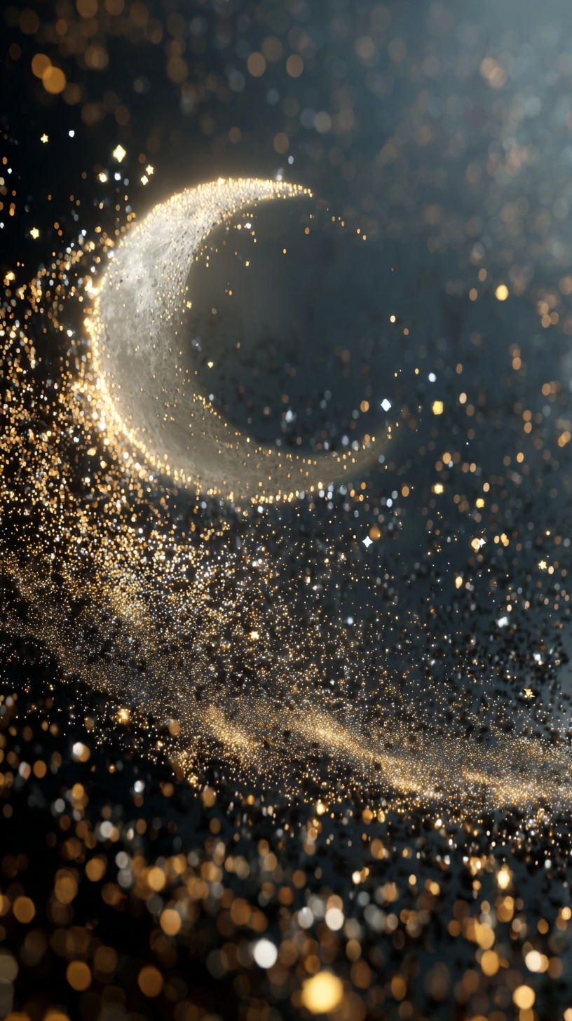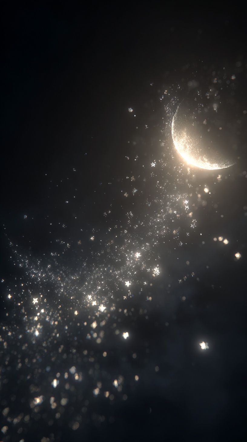 Изображение звёздного неба и луны, которая распадается на мелкие светящиеся частицы.