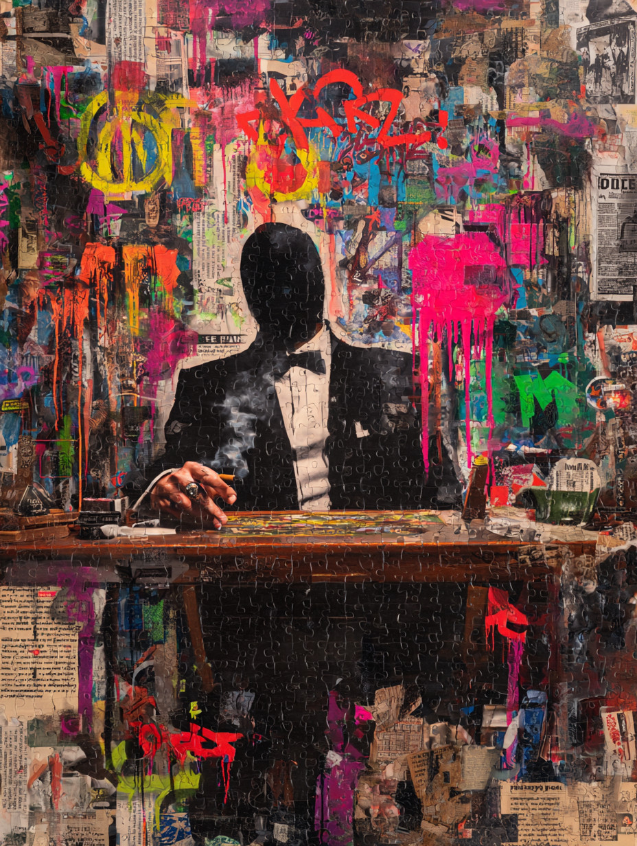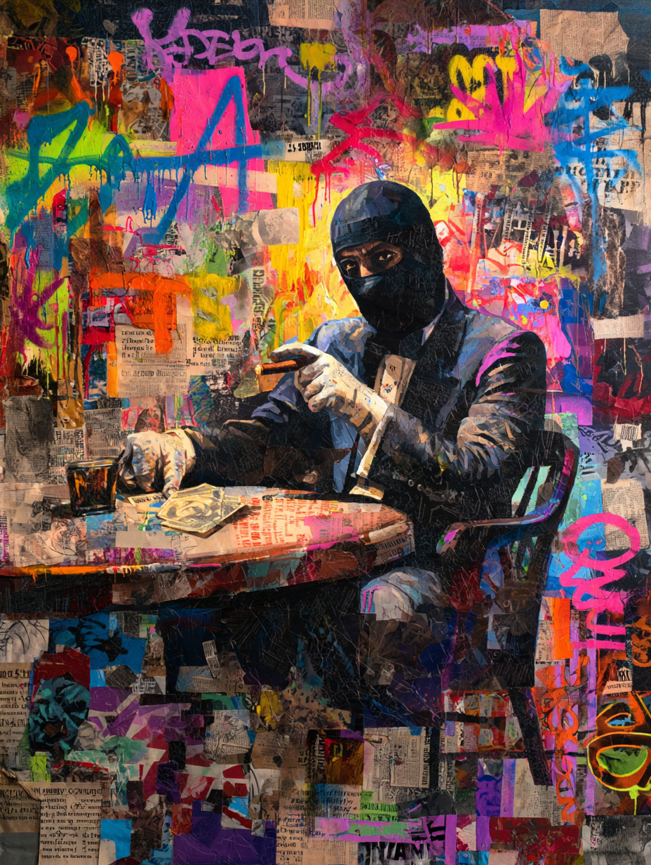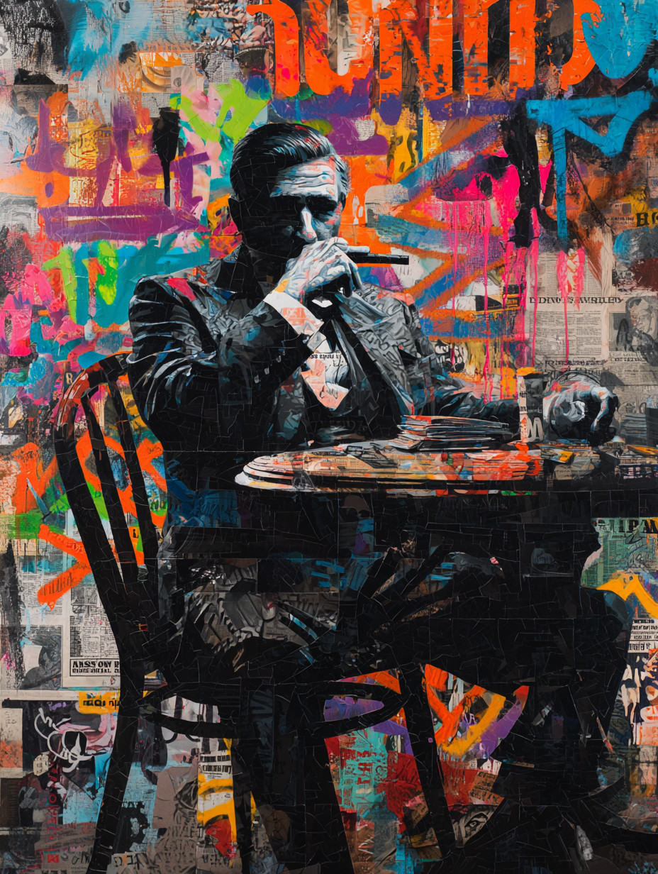 Персонаж «Крёстного отца» сидит за тускло освещённым столом, держа сигару. Фон — хаотичный город с ярким граффити, неоновыми тегами и слоями аэрозольной краски.