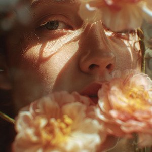 Крупный план художественного, мечтательного портрета женщины, частично скрытой тремя яркими цветами на переднем плане в сильном боке