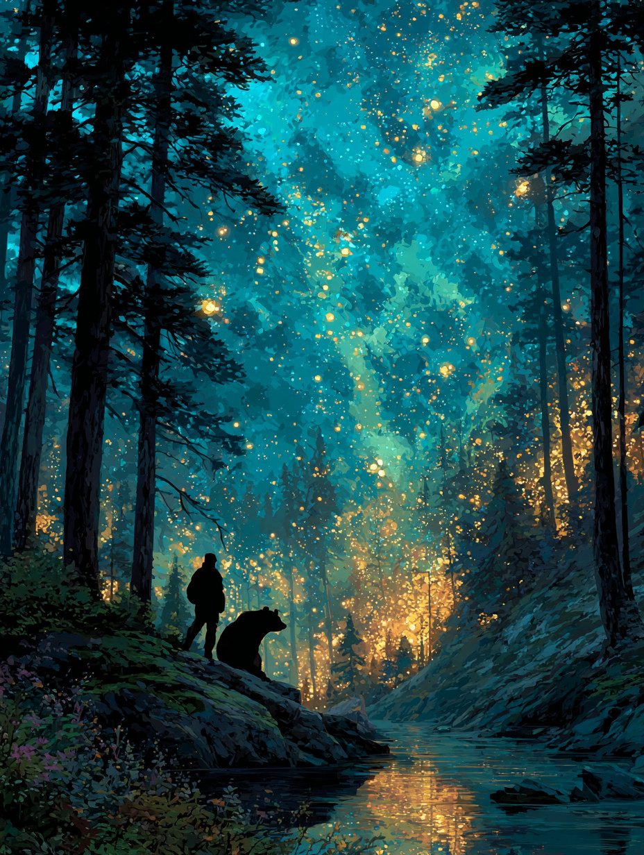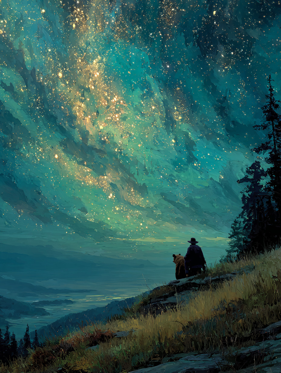 Интенсивный свет обводит фигуры золотом. Ощущение погружения в звёздный свет, текстура рисованной маслом.