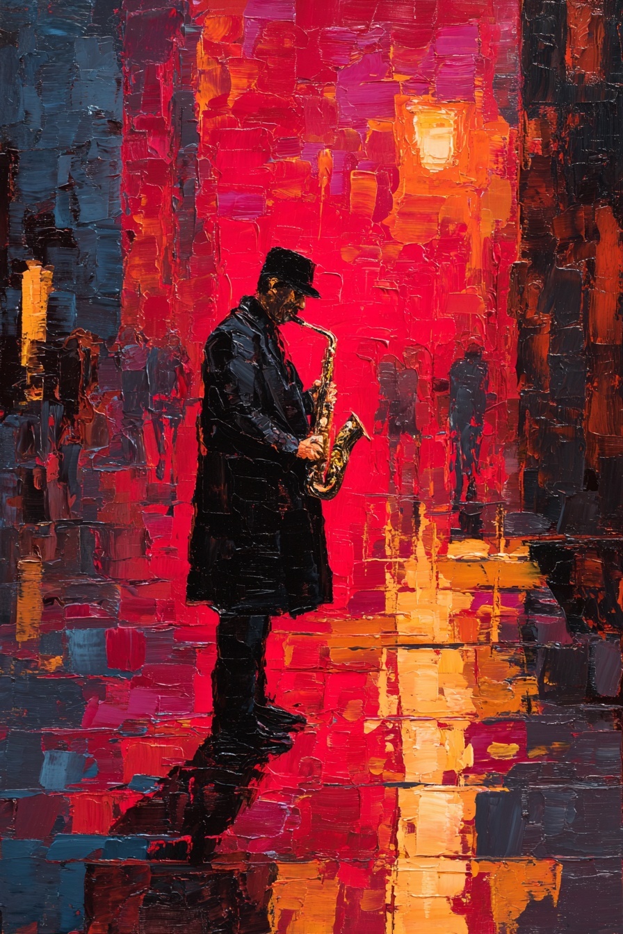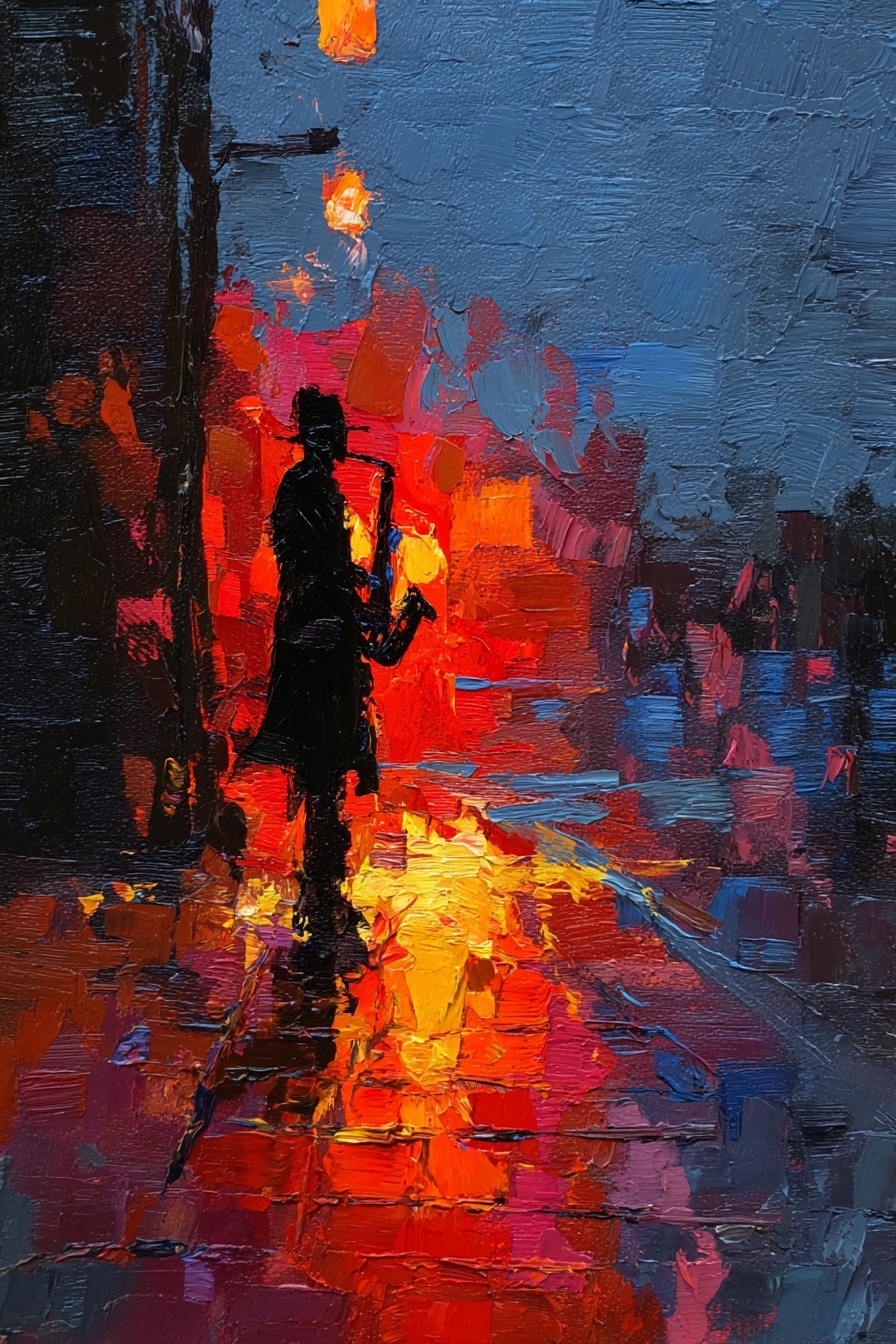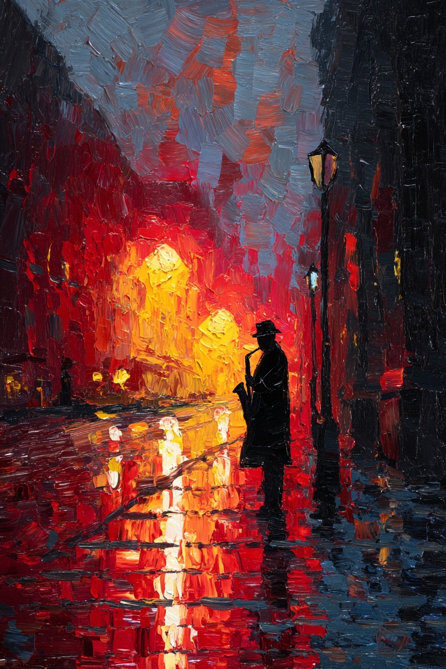 Уличный саксофонист под фонарём в дождливую ночь. Картина в стиле современного импрессионизма с густыми мазками, тёплым светом и драматической атмосферой.