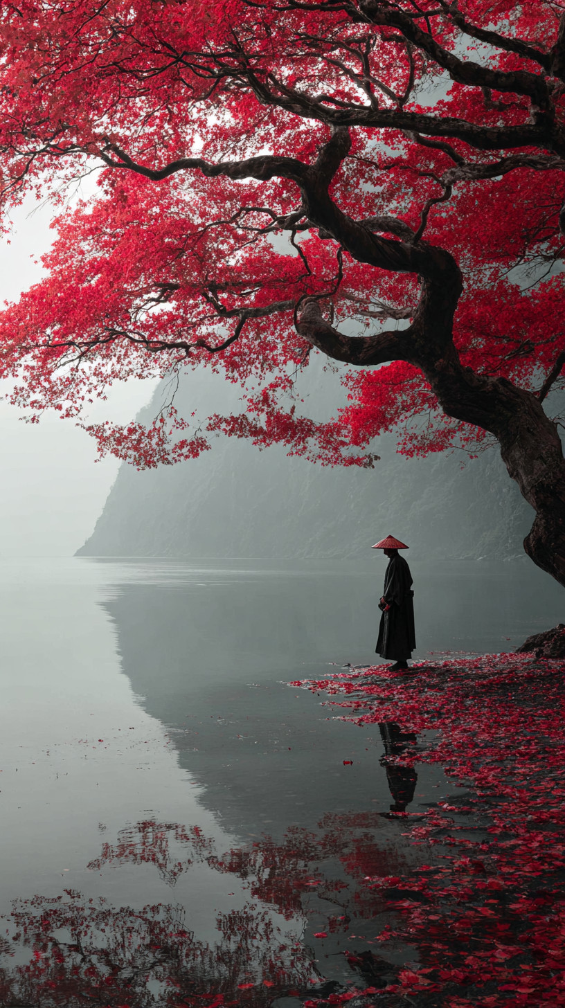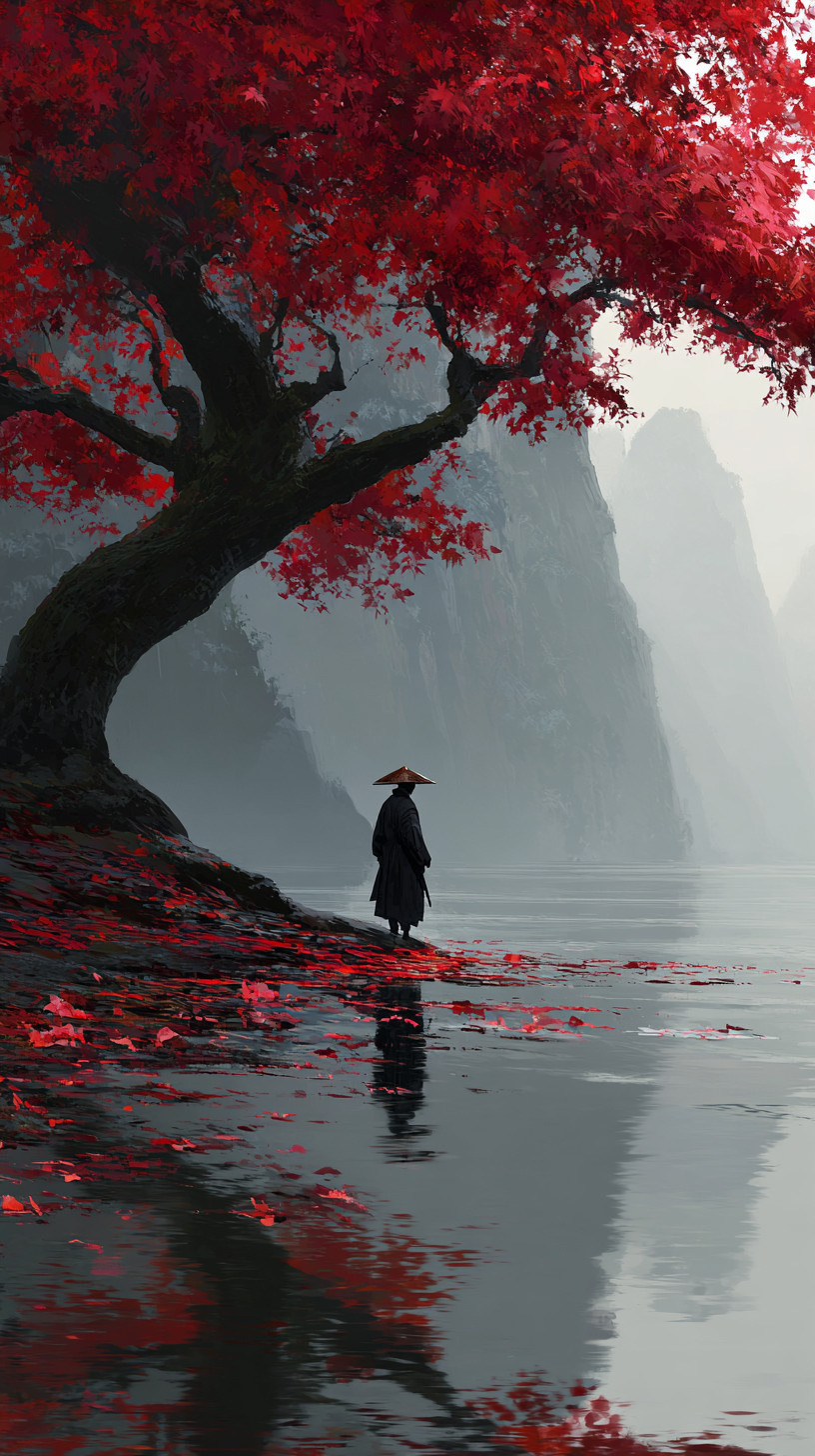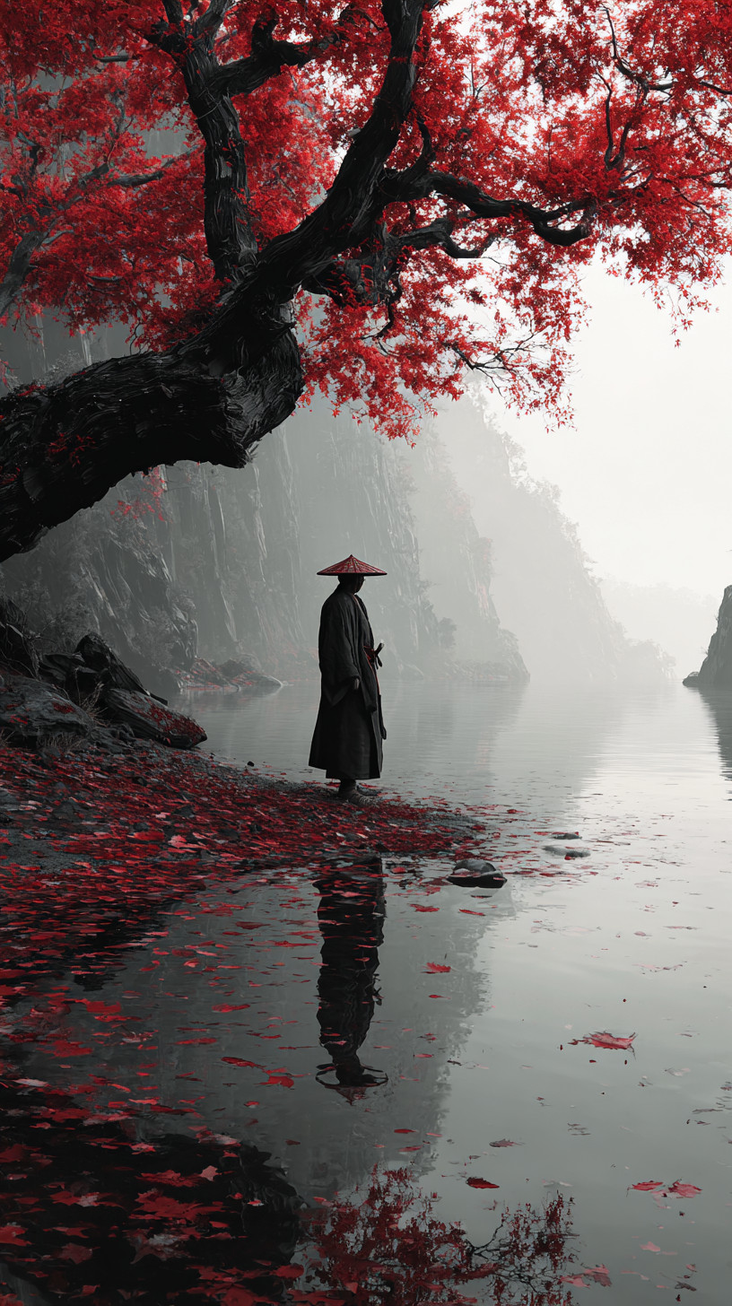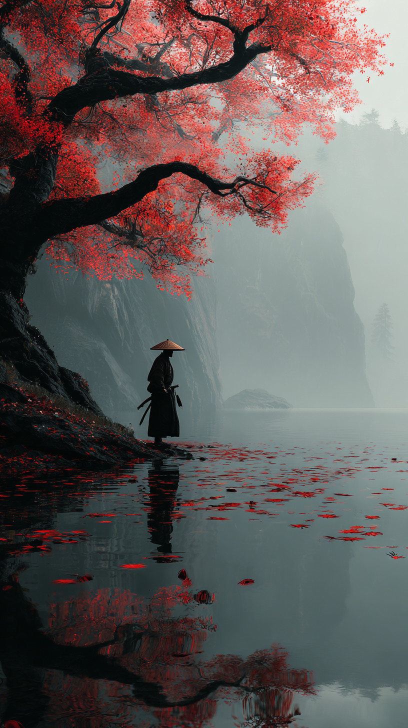 Одинокий странник-самурай в тёмном кимоно и соломенной шляпе, стоит у зеркального озера. Туман скрывает горы, мягкий свет создаёт контраст между монохромным фоном и алыми листьями.