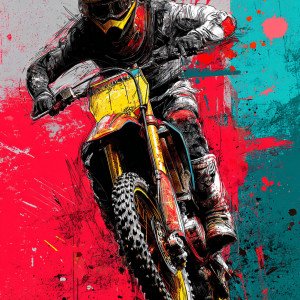 Граффити-иллюстрация мотокроссового райдера в динамике: байк в движении, брызги краски, абстрактный стрит-арт фон, наслоенные гранж-текстуры.