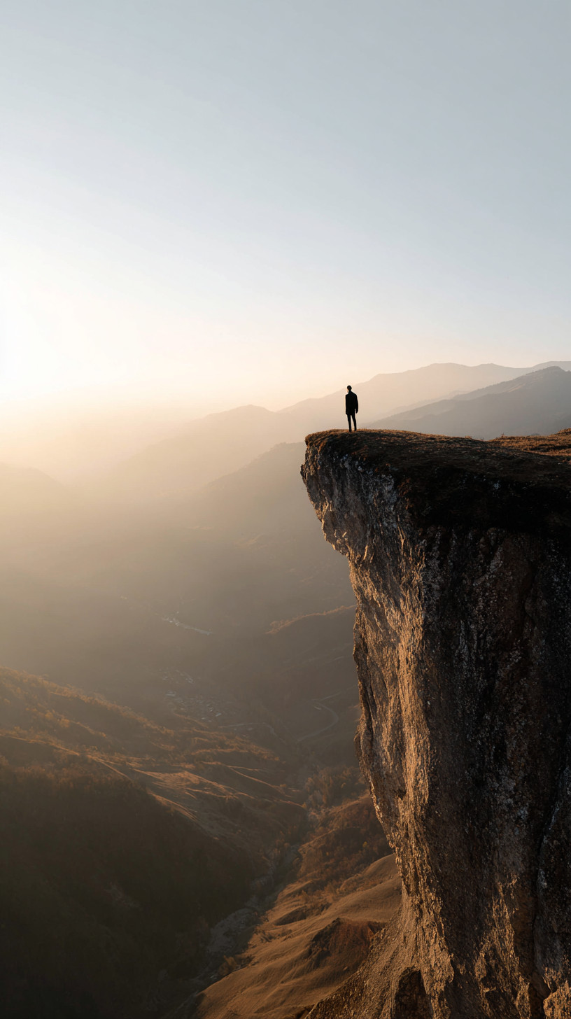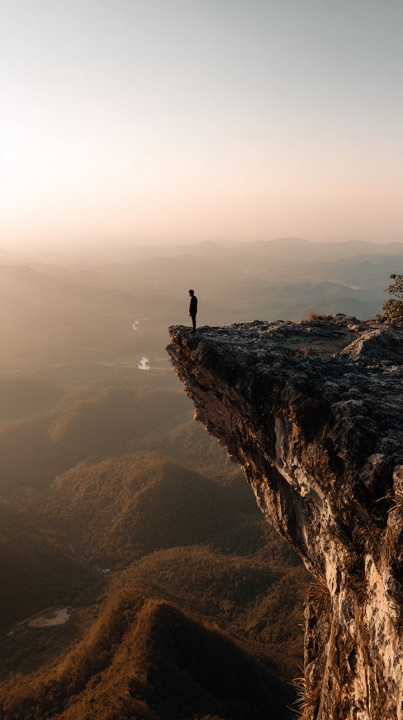 Сцена горного утёса: человек стоит на краю обрыва, глядя на бескрайний пейзаж. Мягкий золотой свет восхода, огромное небо доминирует в кадре.