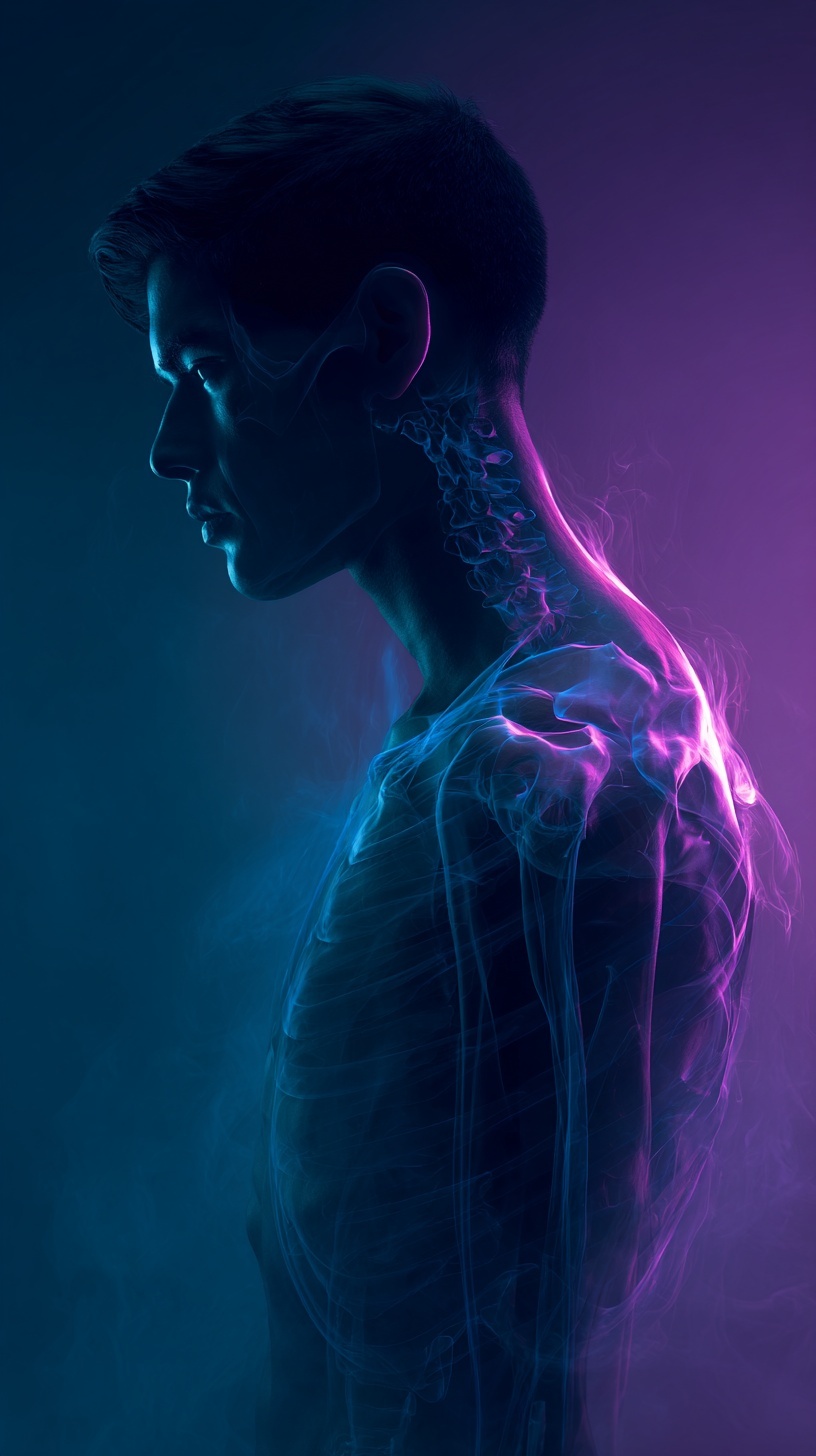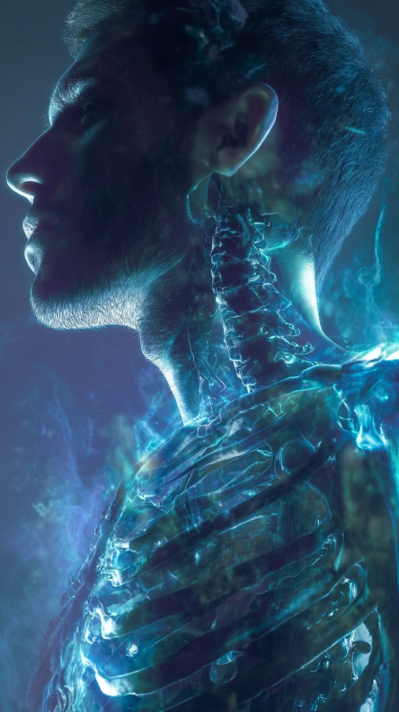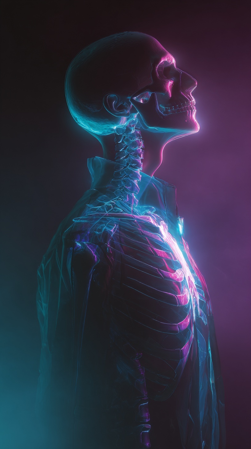 Мужчина с прозрачной кожей, сквозь которую видны светящиеся неоном кости. Авангардный стиль на тёмном фоне с фиолетовым светом и киберпанк-эстетикой.