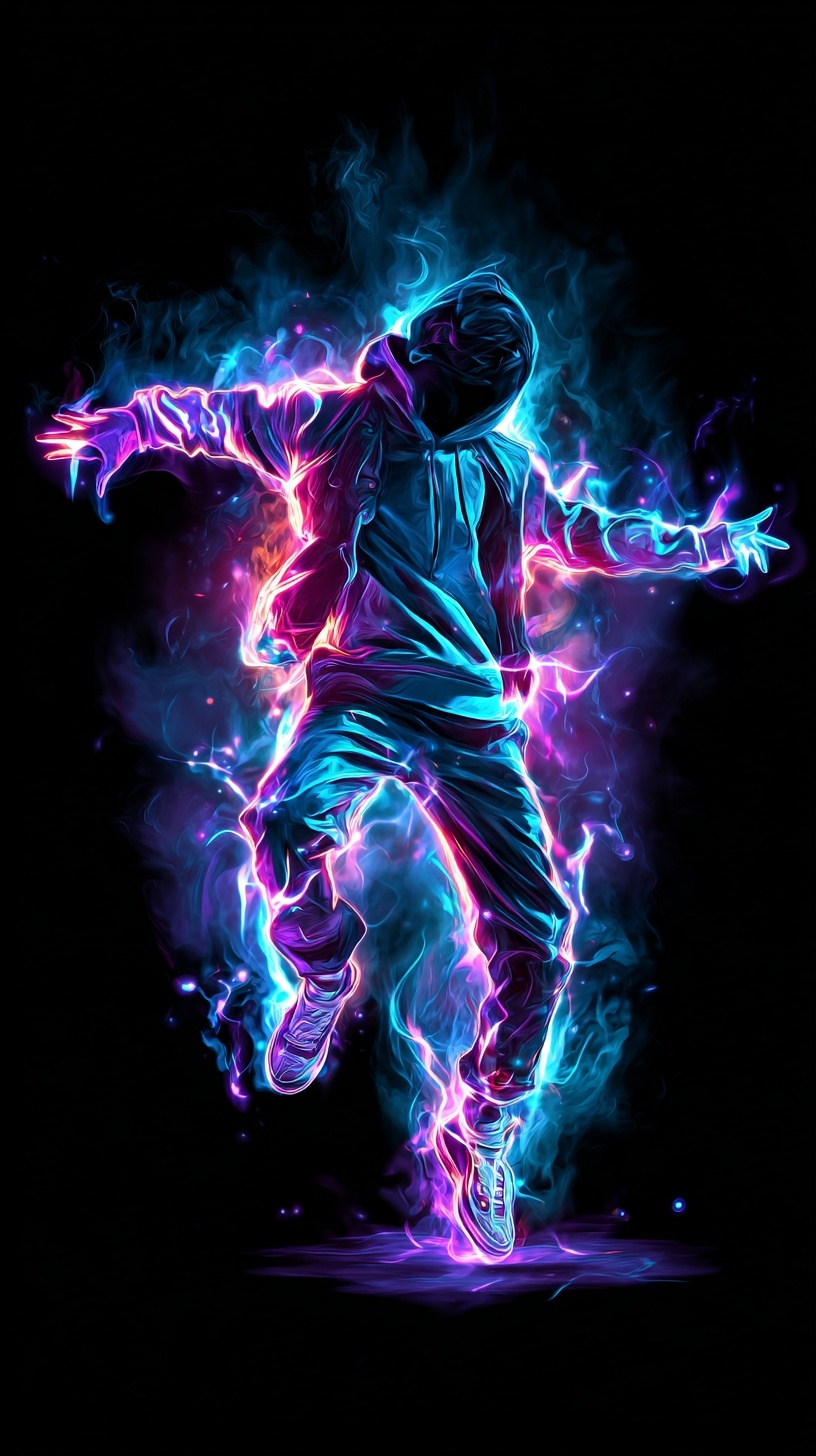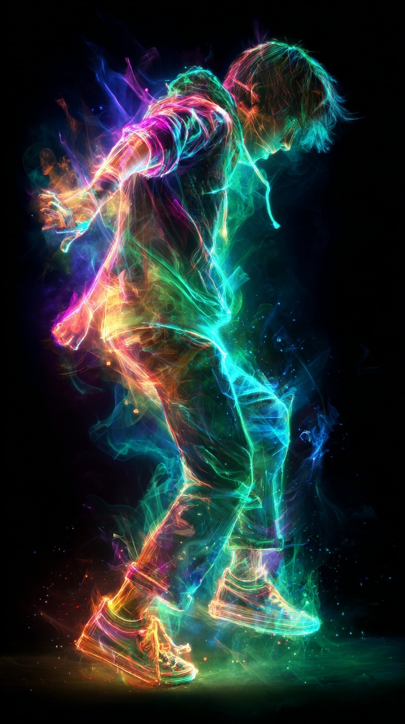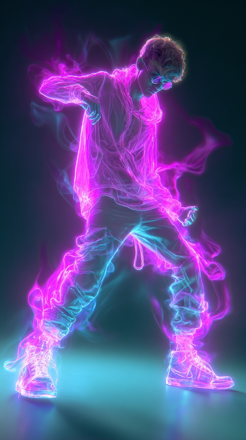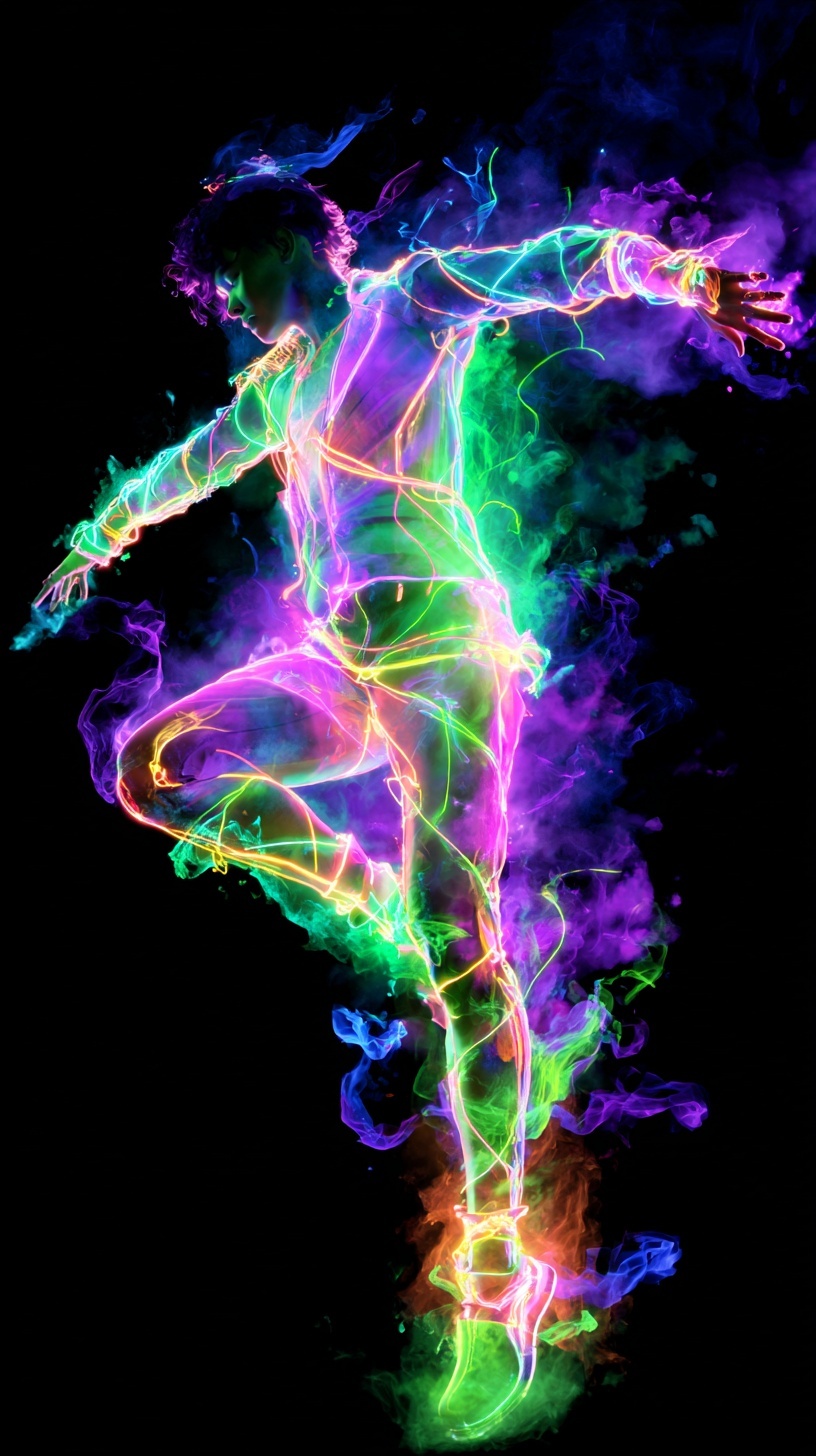 Танцующий человек с неоновым свечением, дымом и световыми эффектами.
