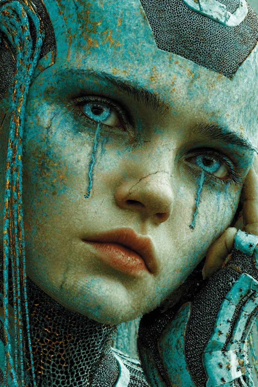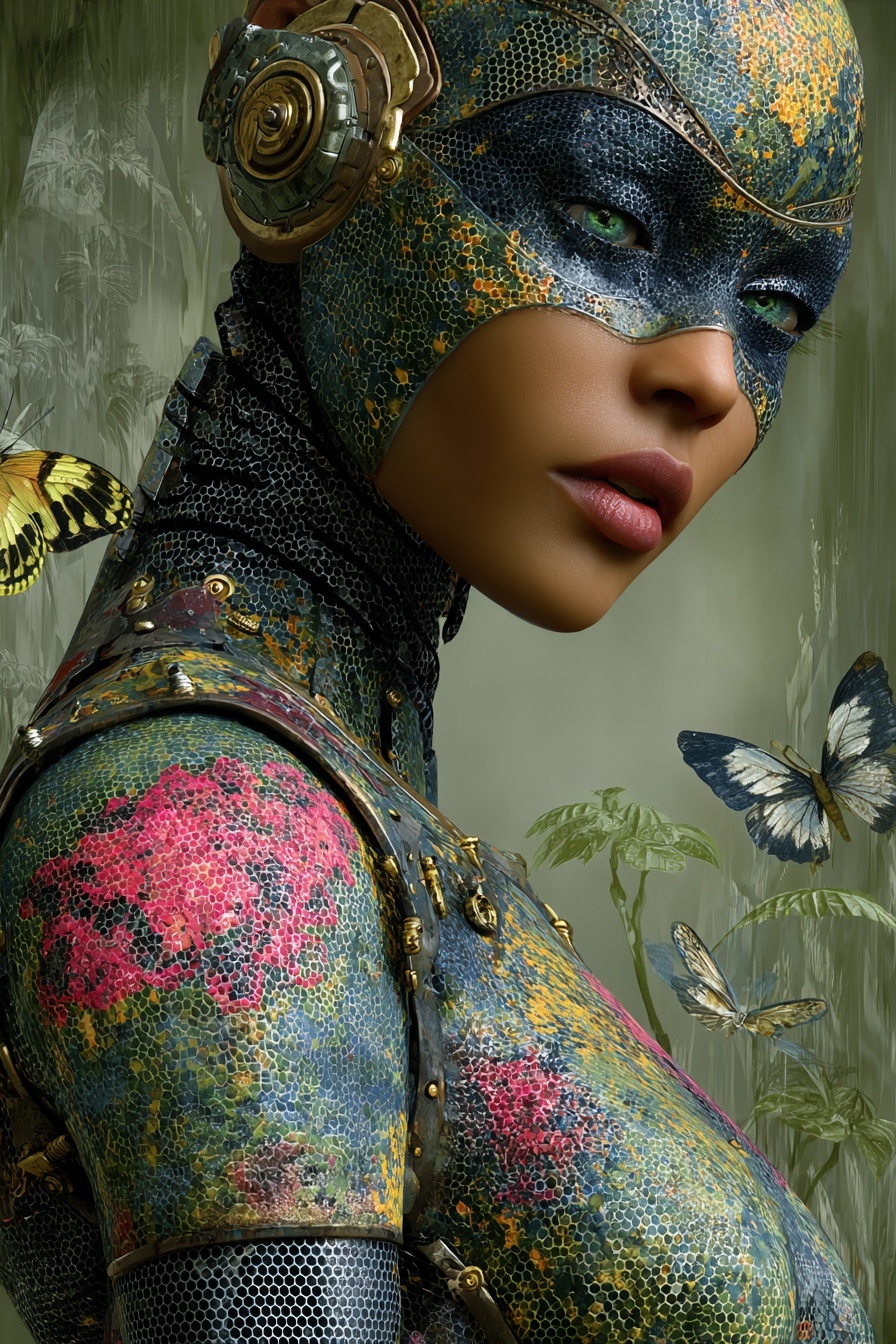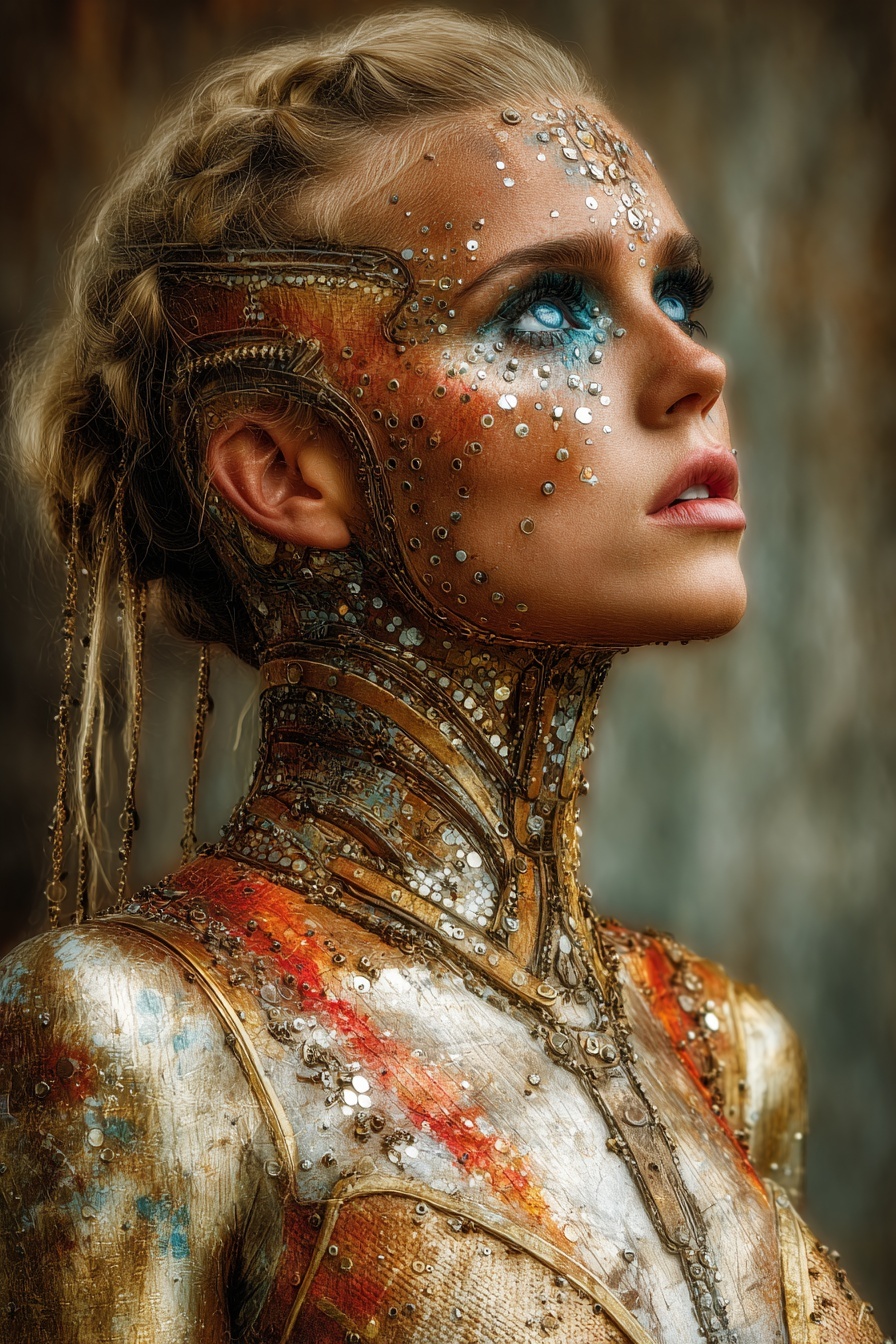 Портрет женщины в стиле sci-fi. Её тело состоит из блестящих металлических пластин с неоновой подсветкой.
