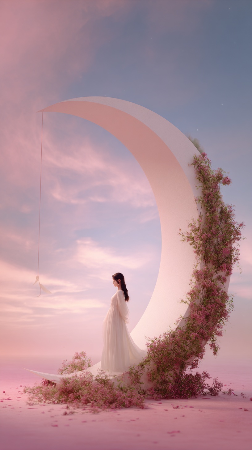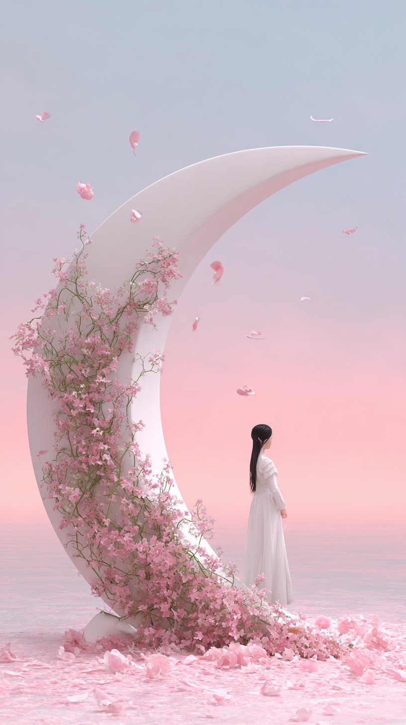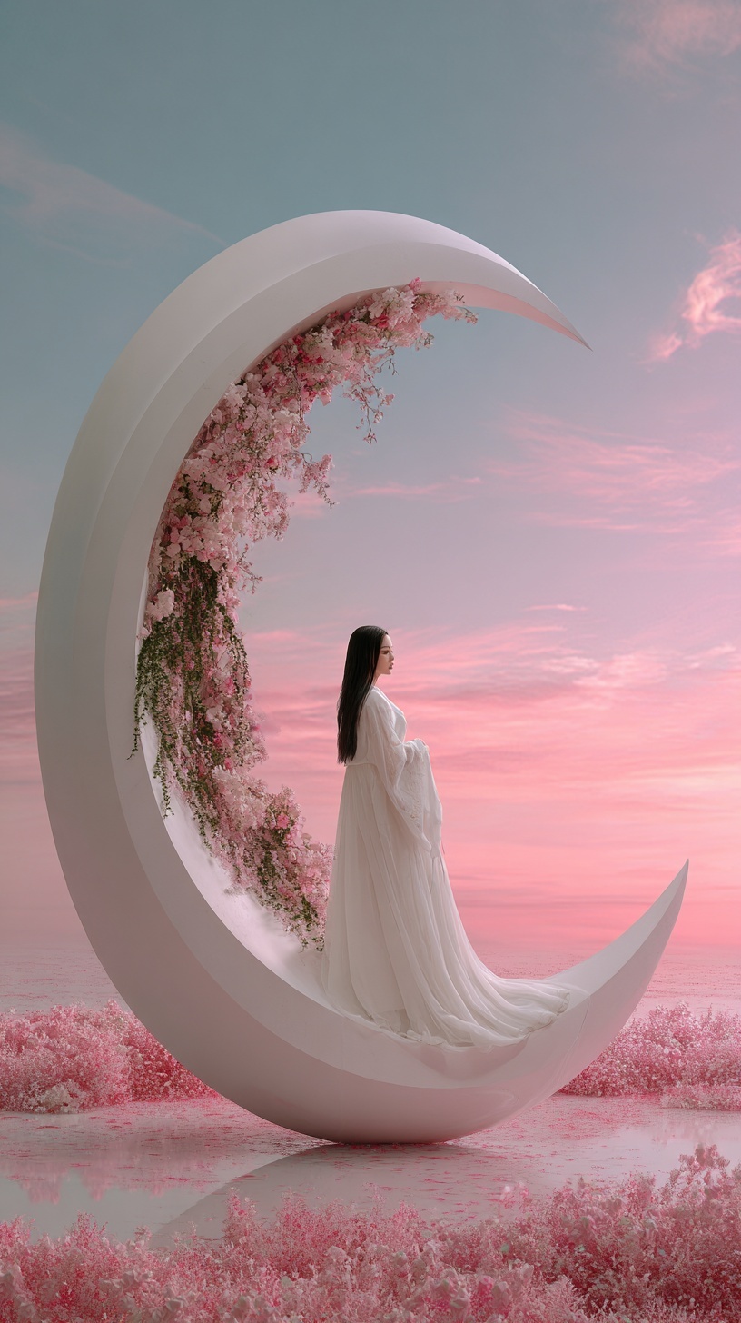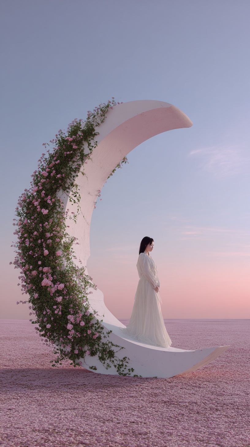 В центре изображения — инсталляция в форме полумесяца с чисто-белой поверхностью, изящно украшенная с одной стороны нежно-розовыми цветами и зелеными вьющимися лианами.