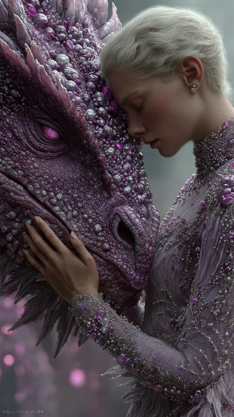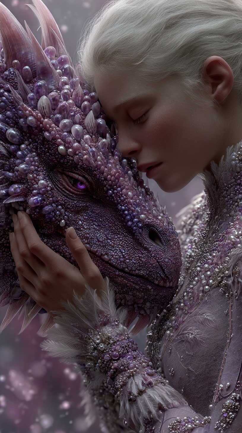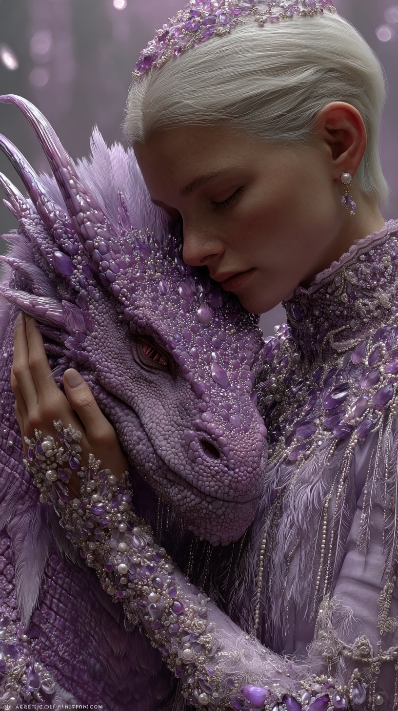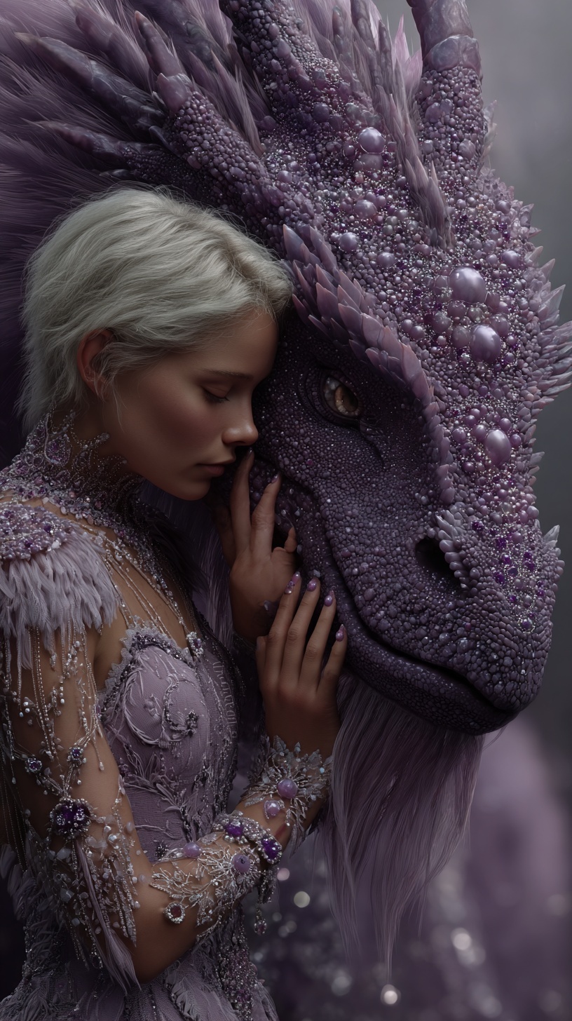 Нежная сцена где женщина в сложном лавандовом платье с бисером, прижимается лицом и руками к морде величественного аметистового дракона.