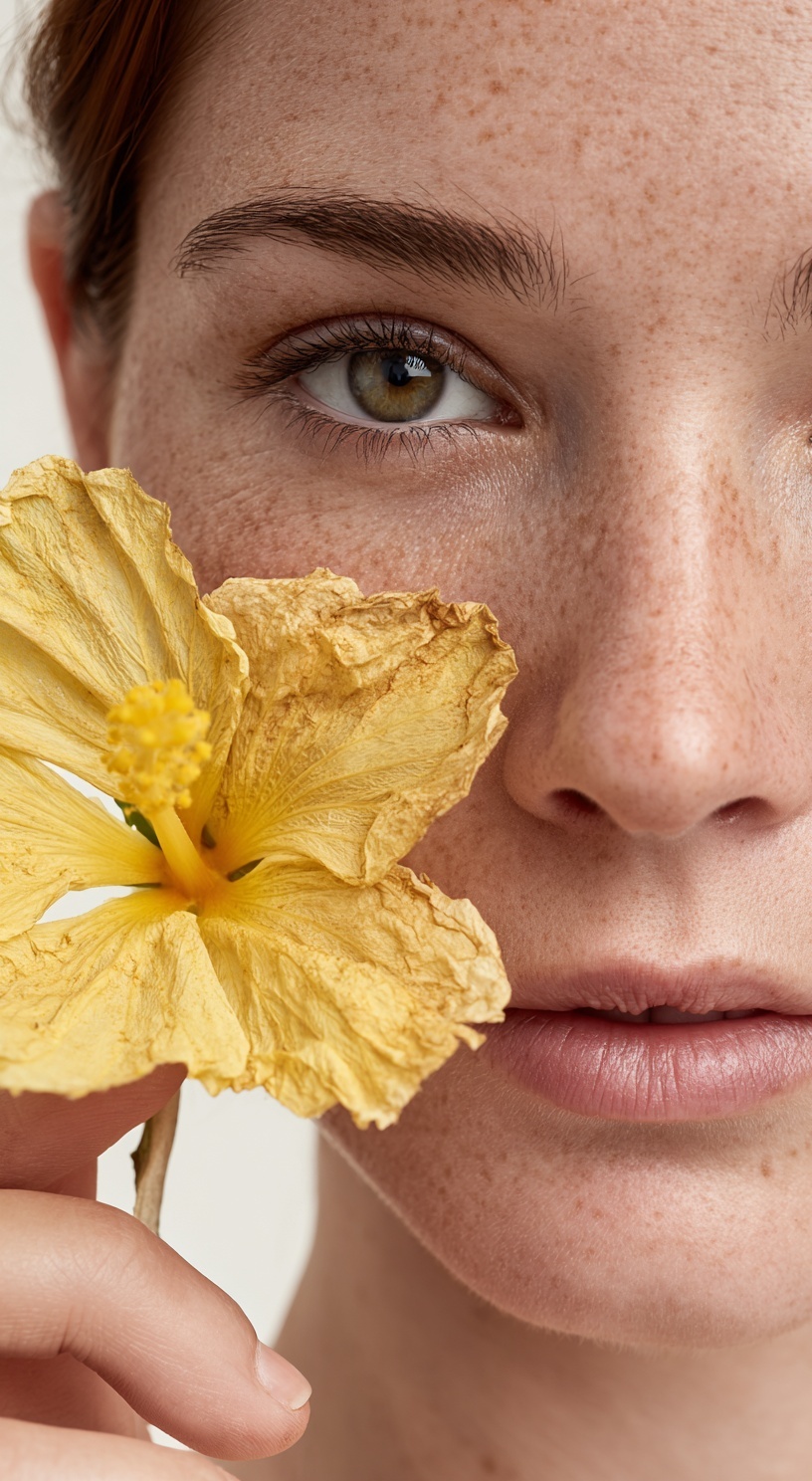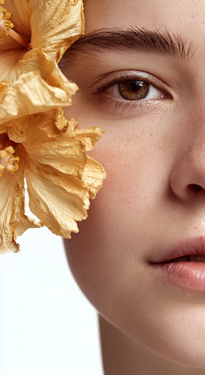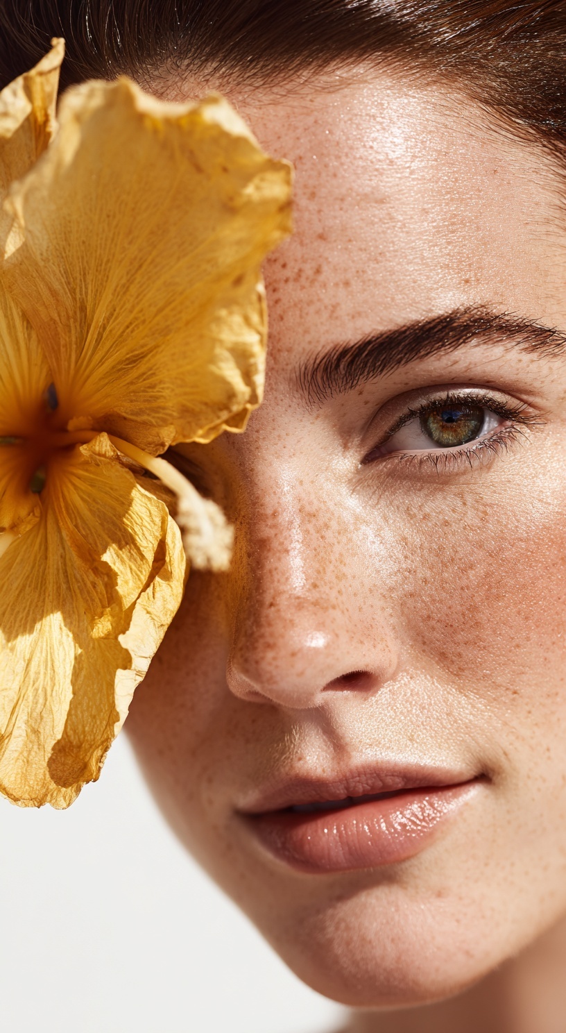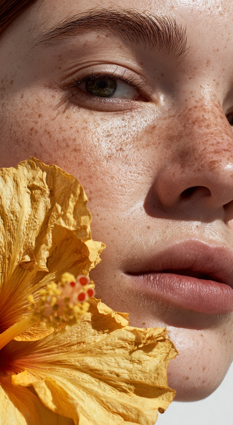 Портрет женщины с чистой, здоровой кожей, снятый крупным планом. На переднем плане — жёлтый цветок гибискуса.