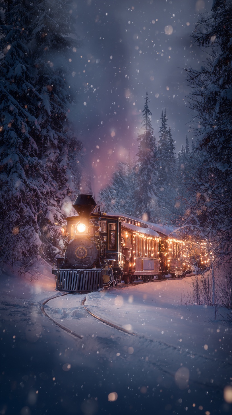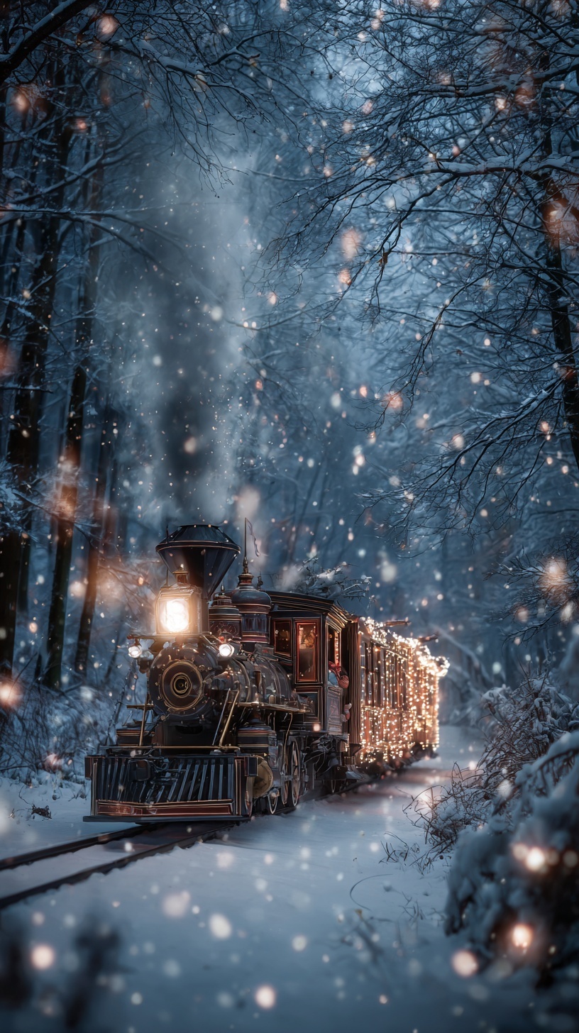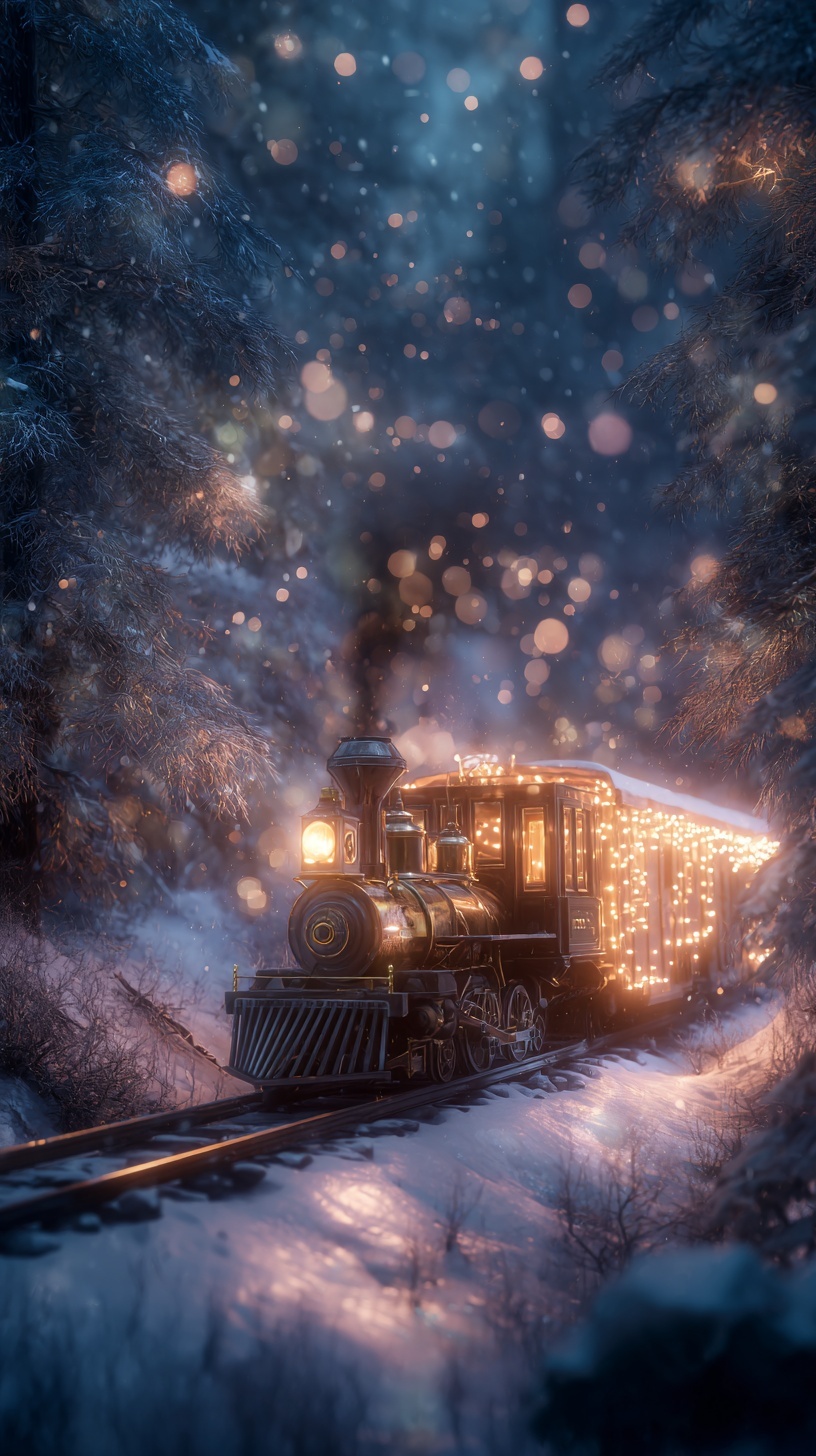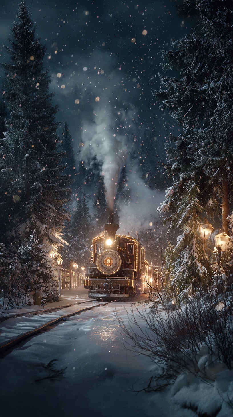 Винтажный рождественский поезд с тёплым светом окон мчится сквозь заснеженный ночной лес.