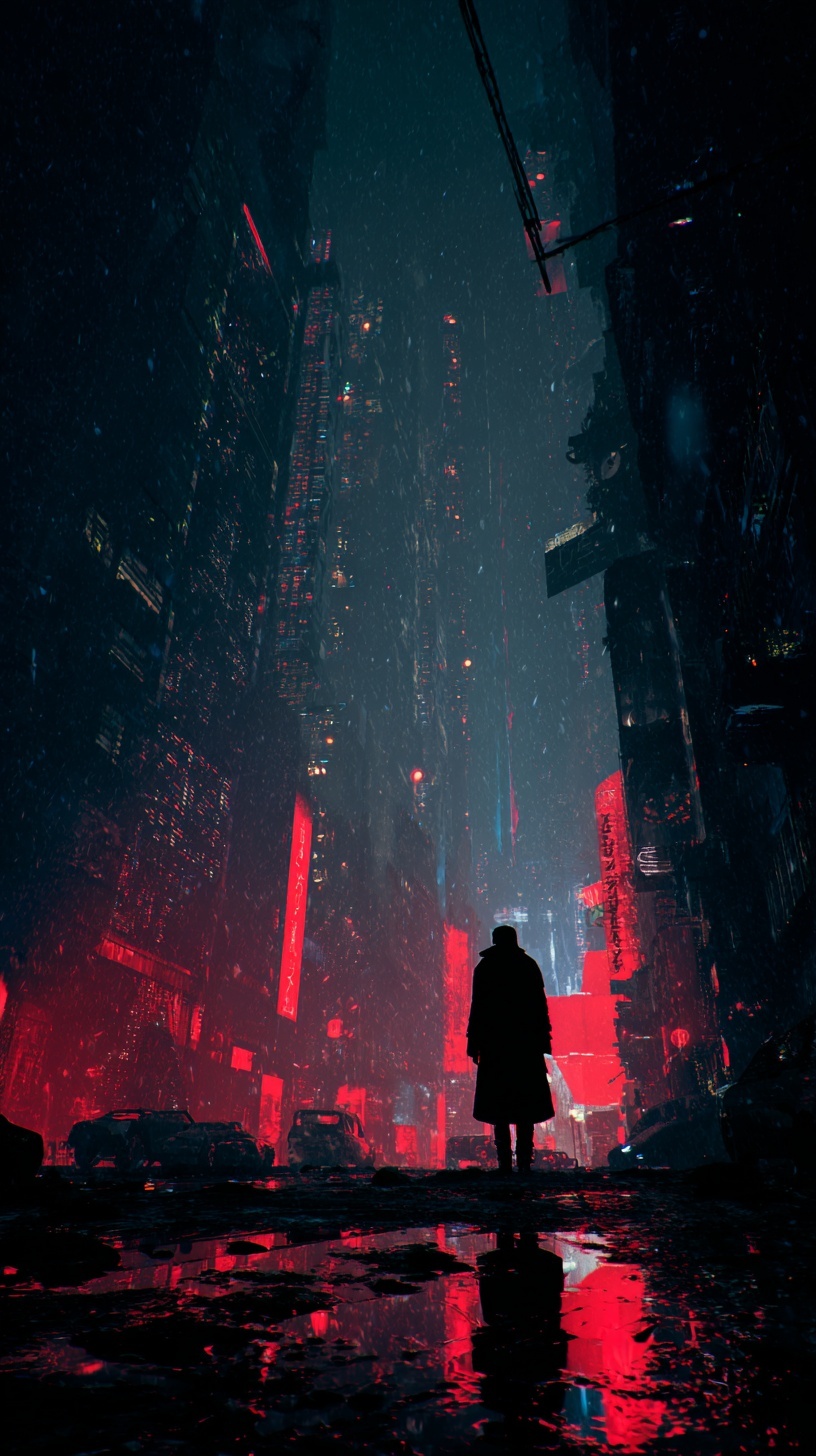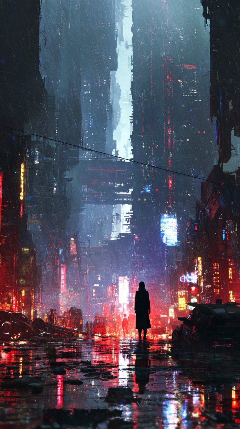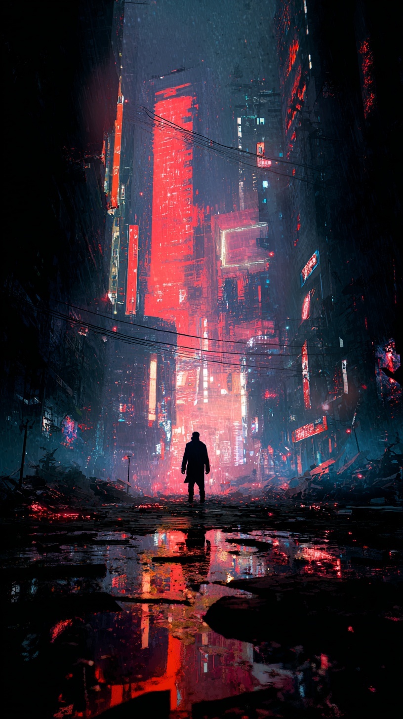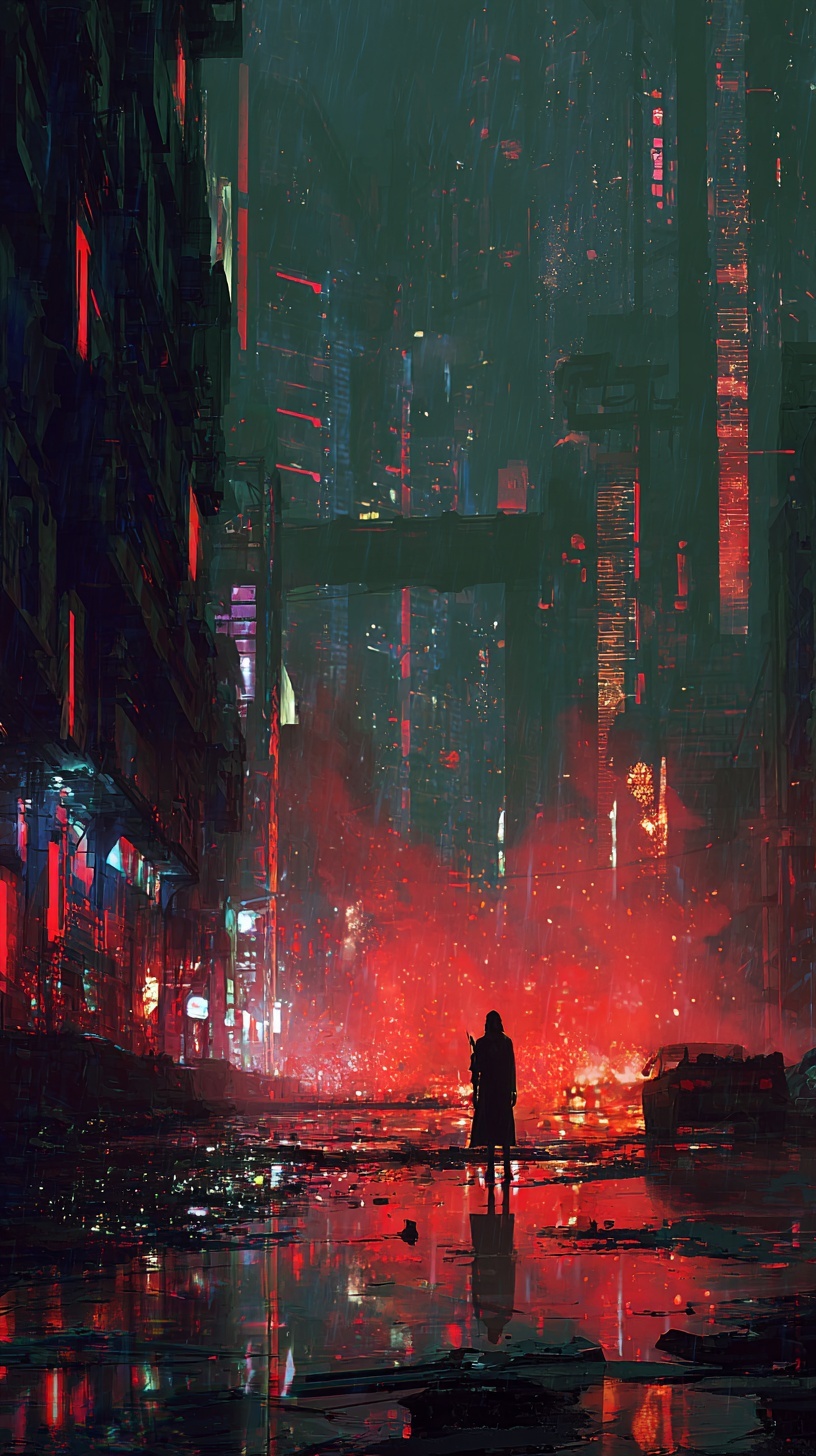 Киберпанк-ситискейп с красным неоном, одинокая фигура в дождь, атмосфера упадка и бунта.