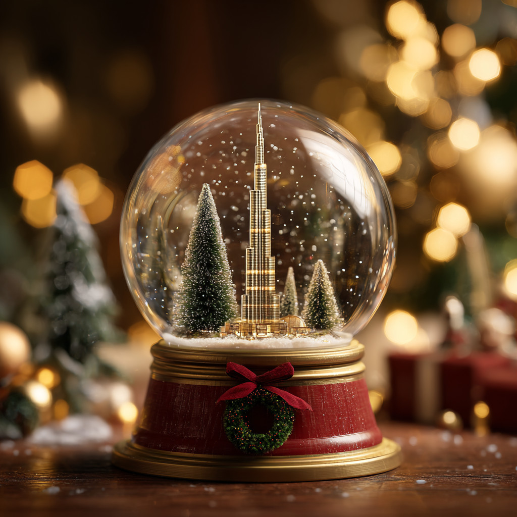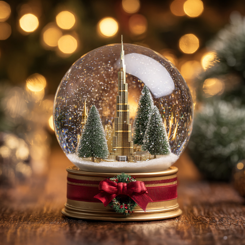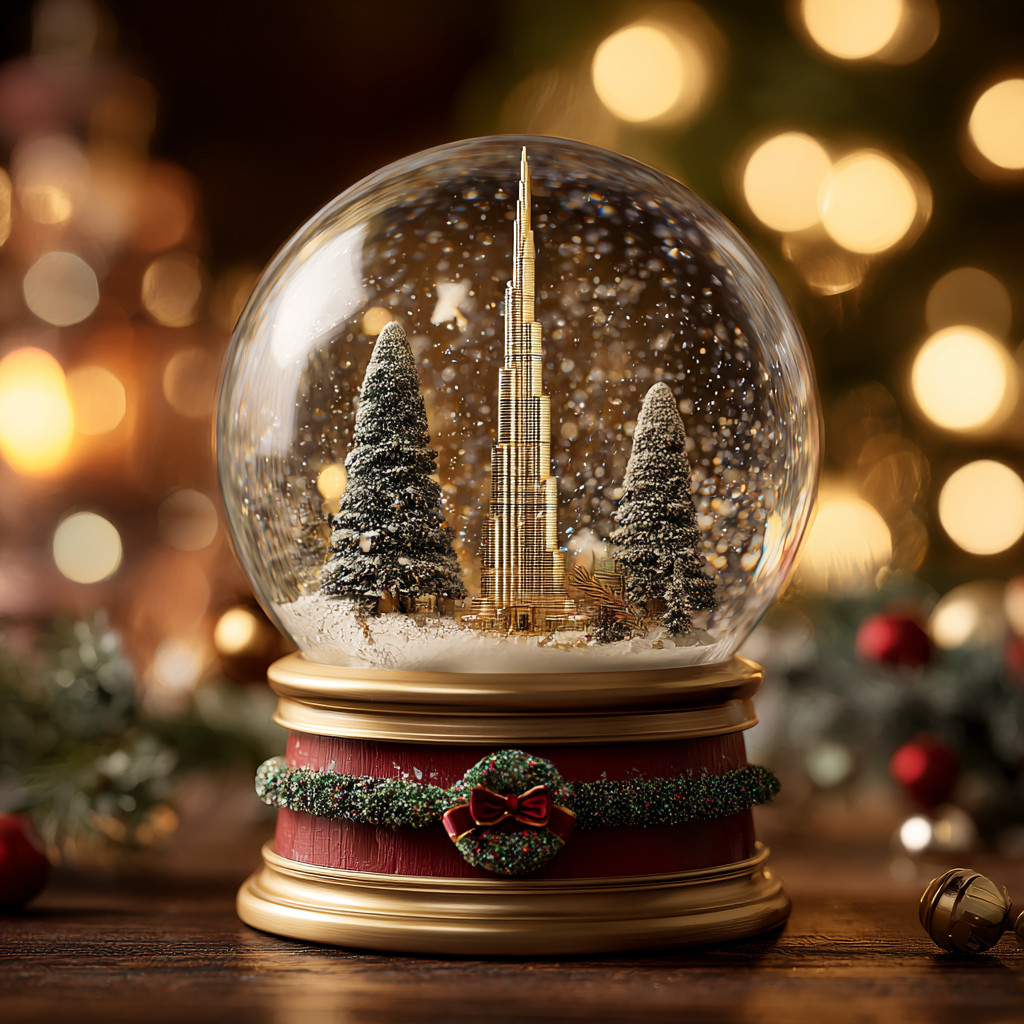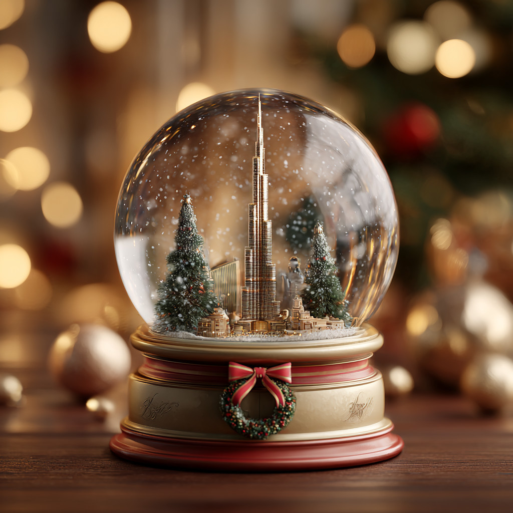 Фото новогоднего шара с миниатюрной золотой Бурдж-Халифой внутри.