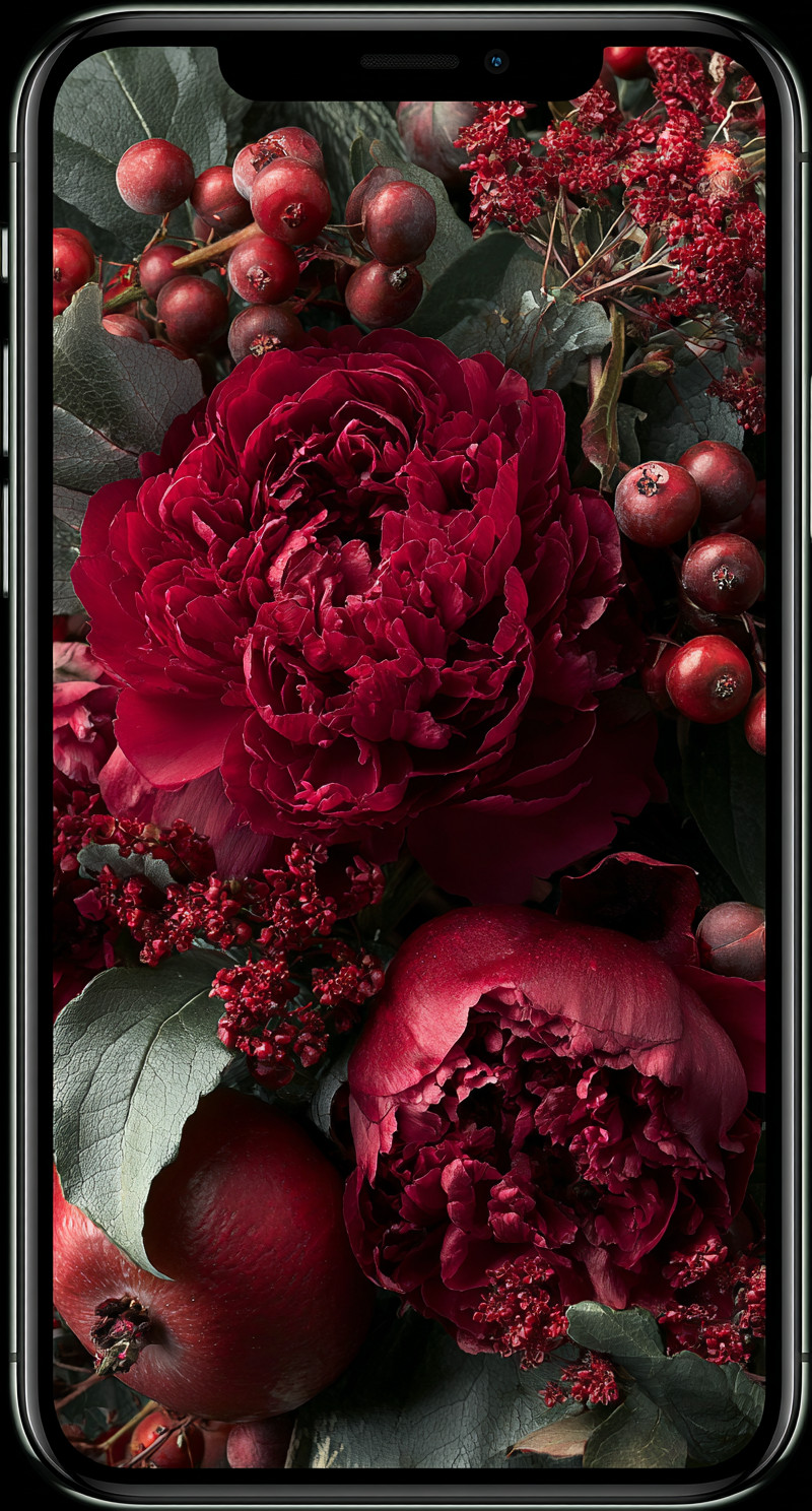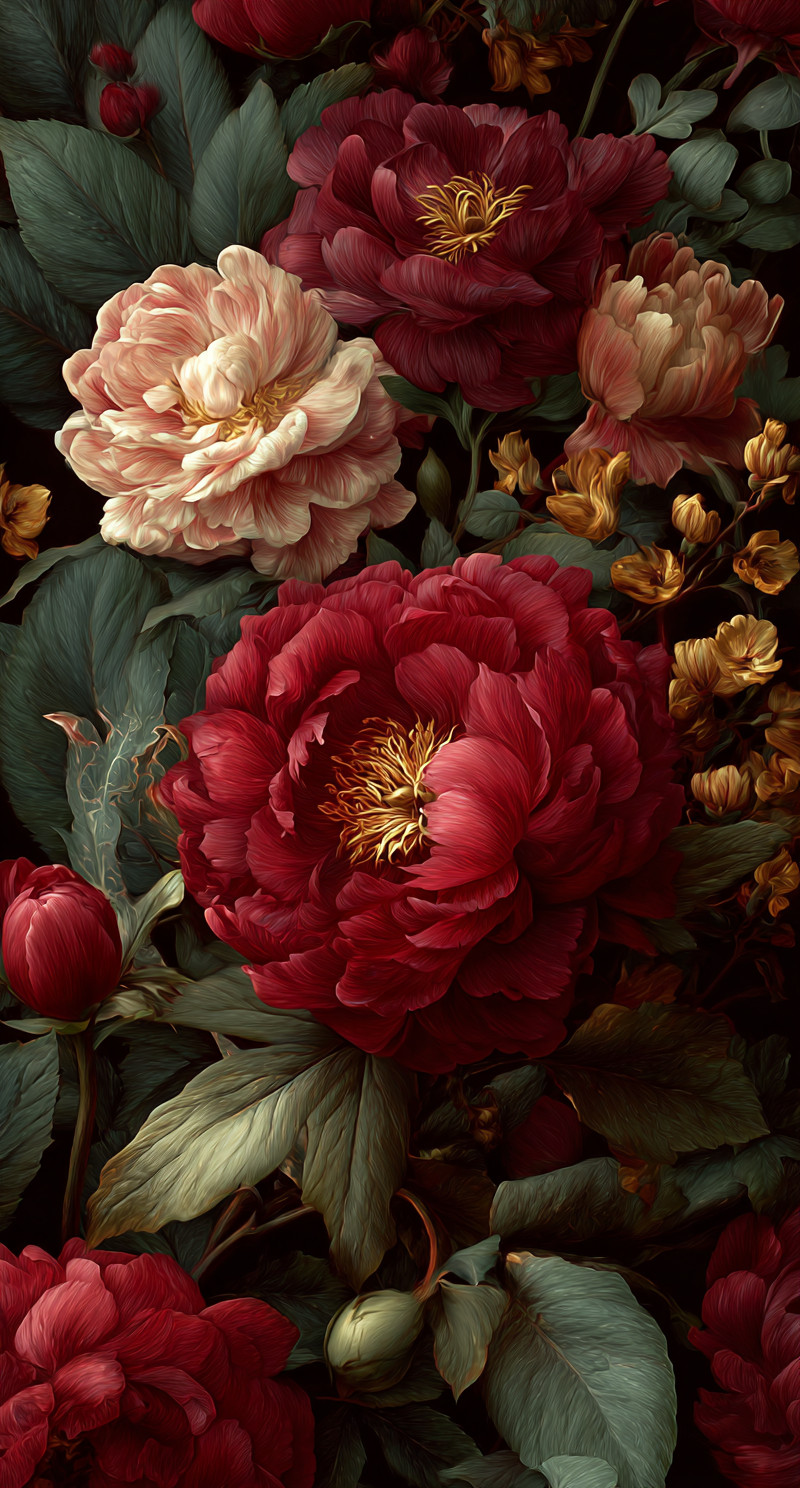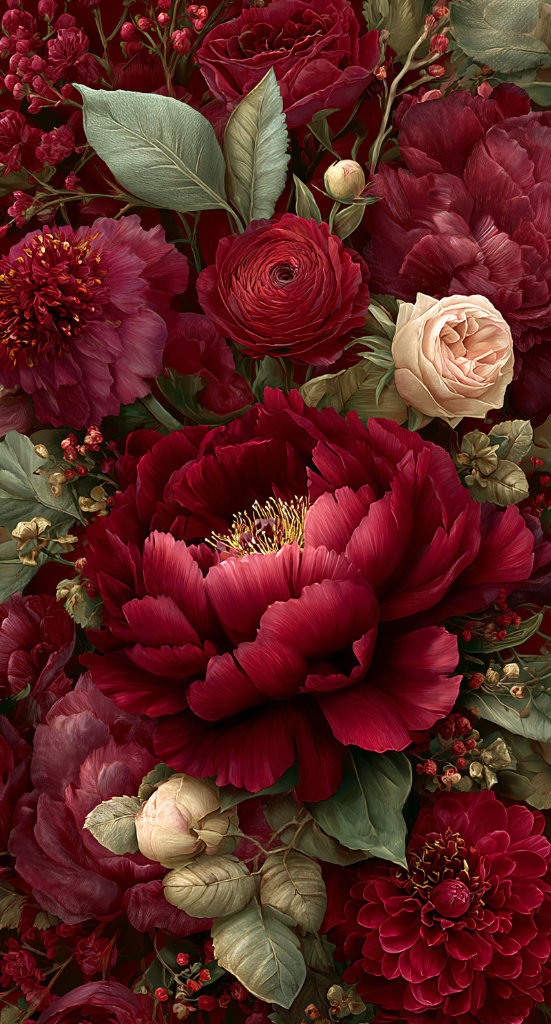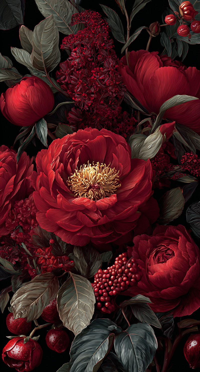 Яркая красная цветочная композиция с насыщенными цветами и детализированными текстурами пионов, роз, листьев и лиан.