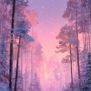 Сказочная иллюстрация зимнего леса в пастельной гамме: нежно-розовое и лавандовое небо, мерцающий снег, кружащие снежинки.
