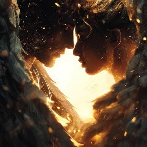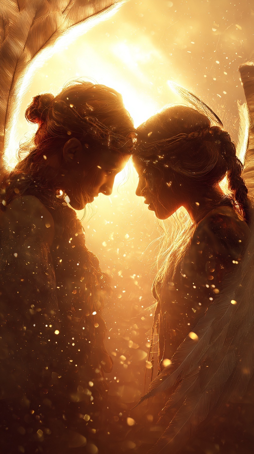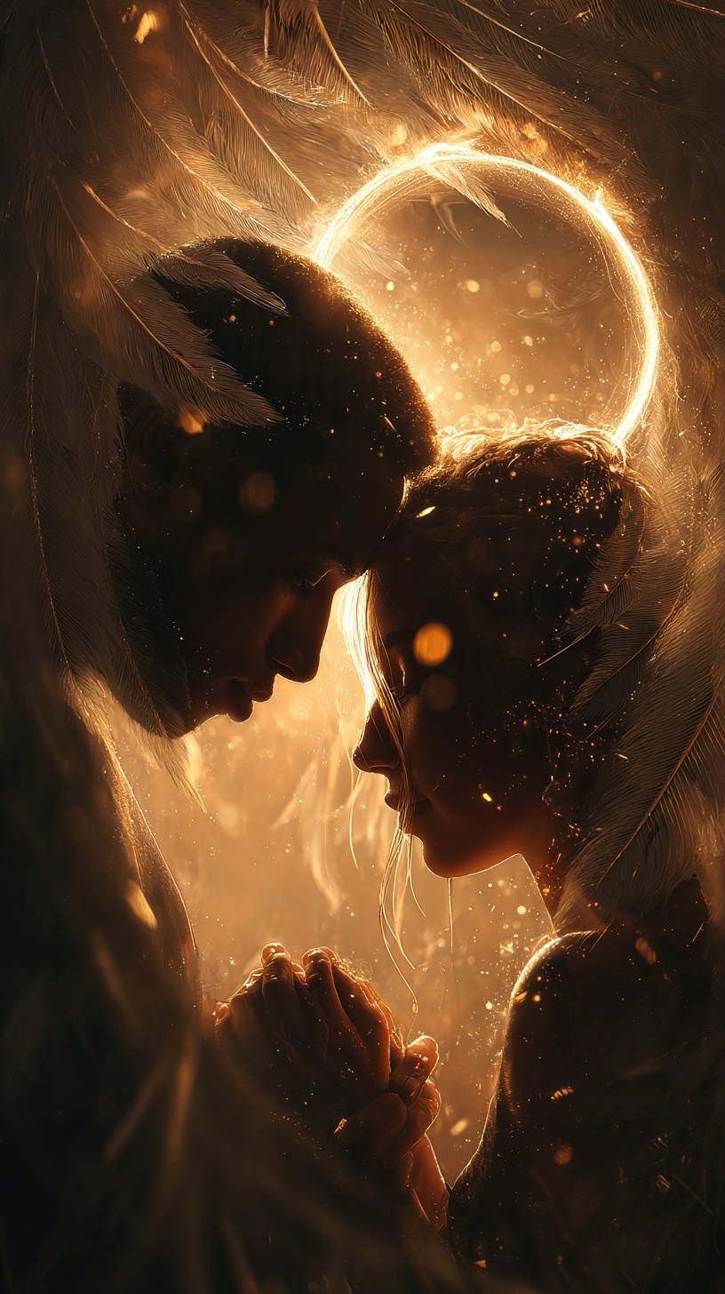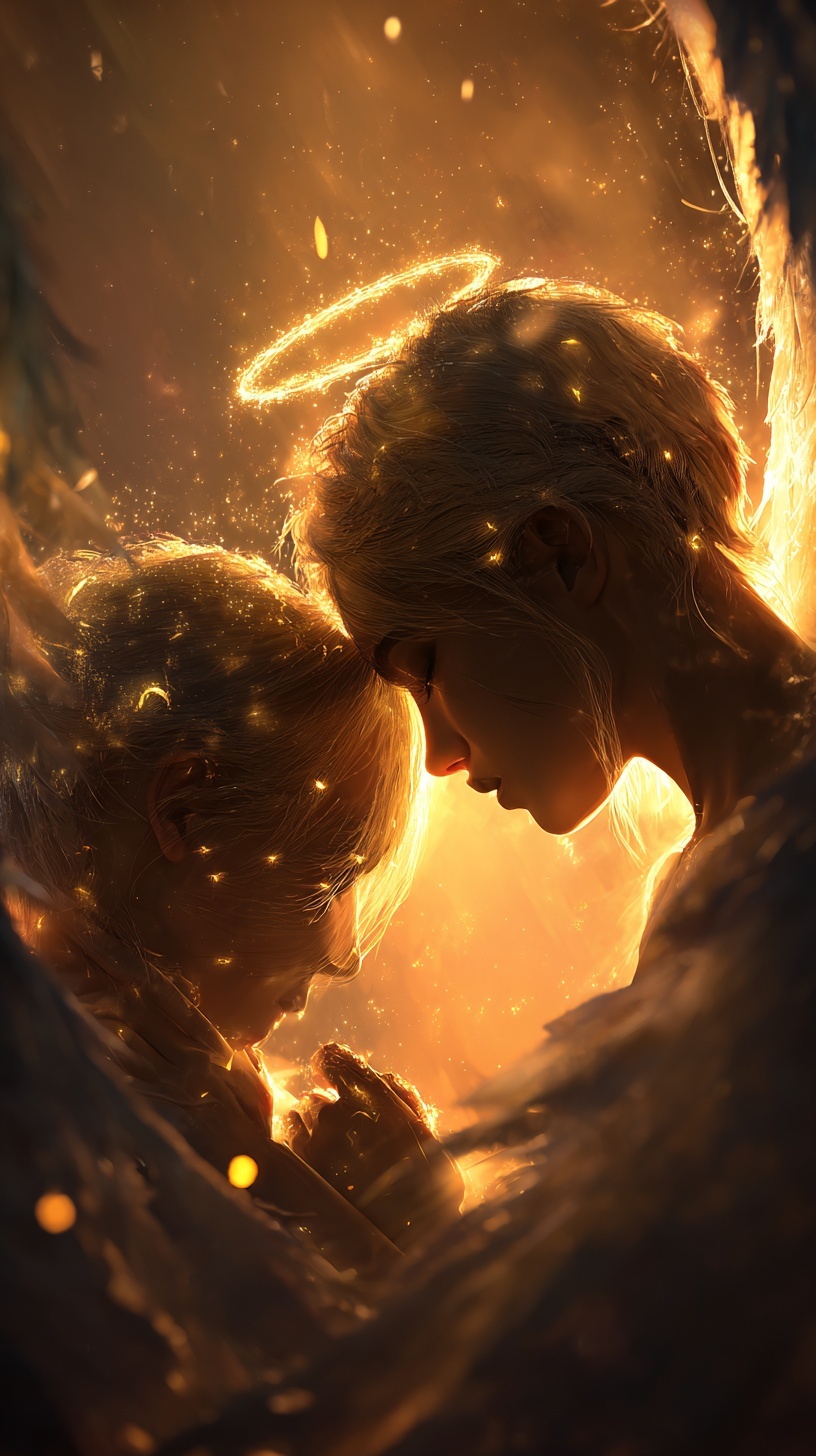 Нежная пара ангелов соприкасается под сияющим ореолом. Тёплый свет за спинами, парящие золотые блёстки.