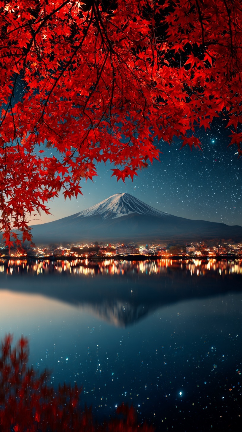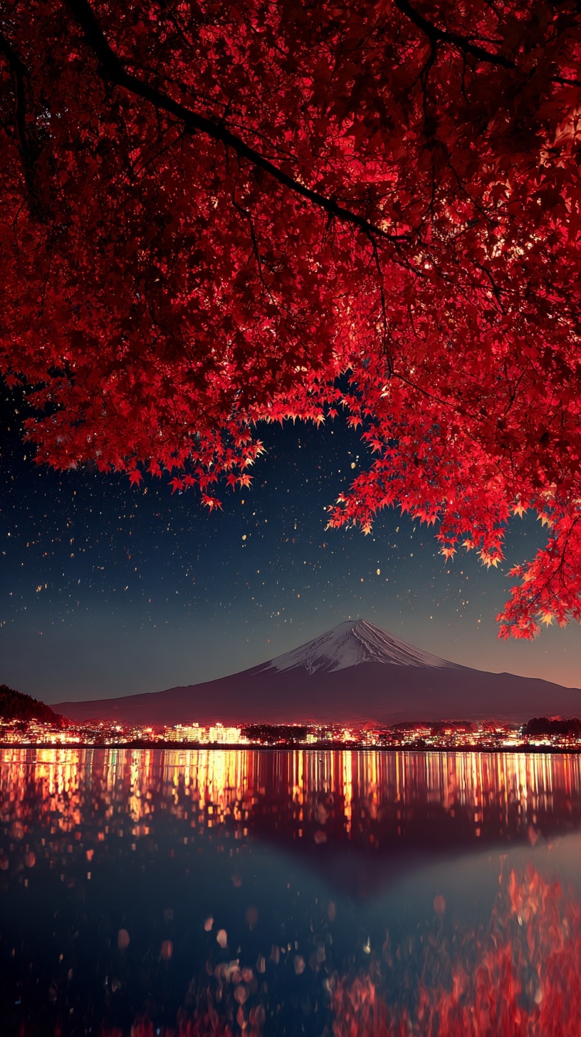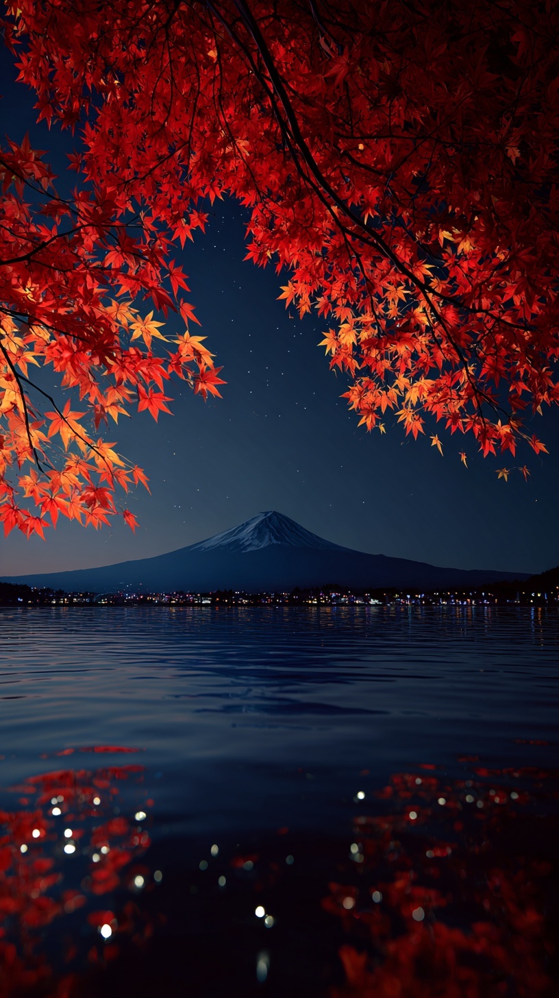 Япония осенью: красные клёны, гора Фудзи на фоне ночного неба, сверкающая вода озера.