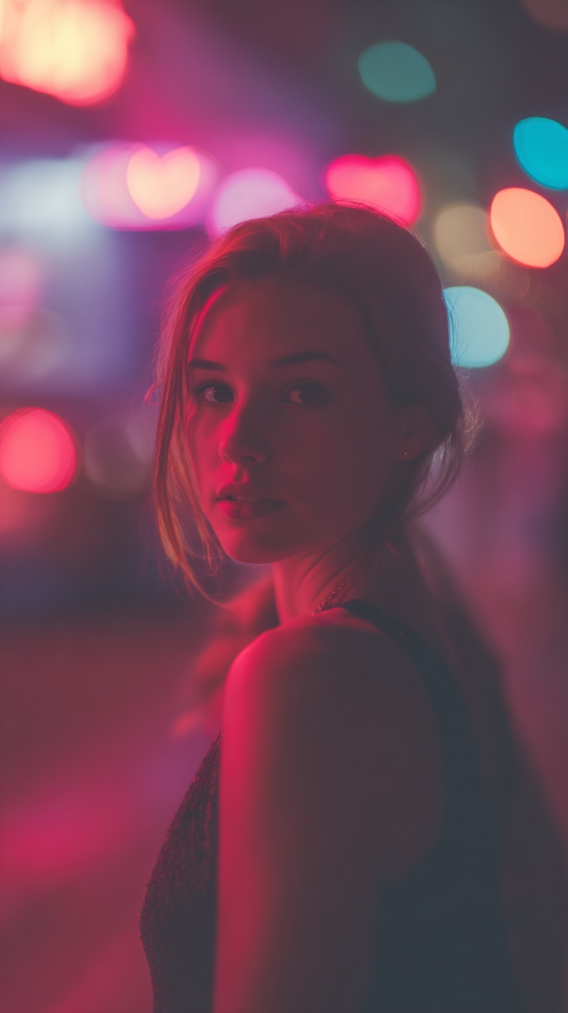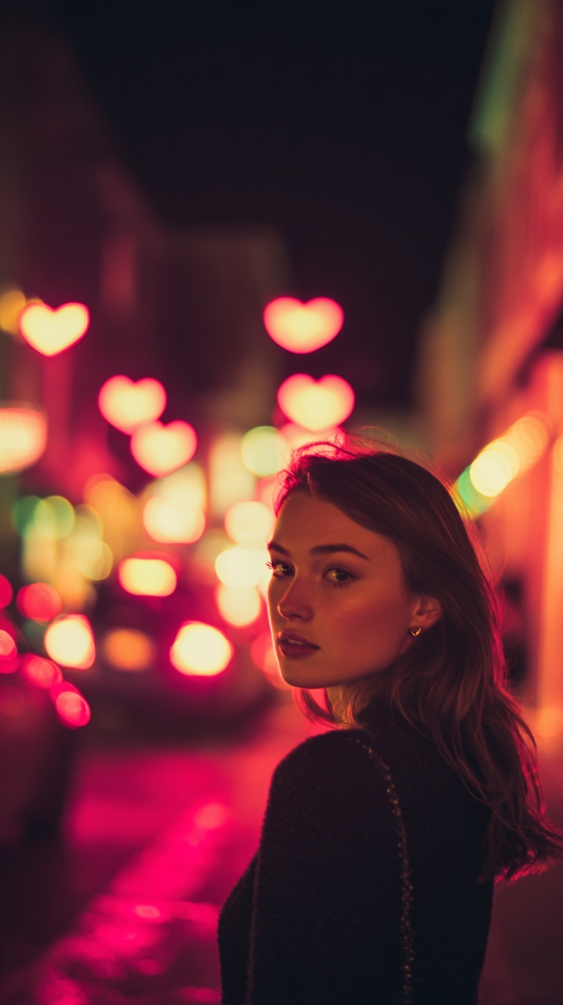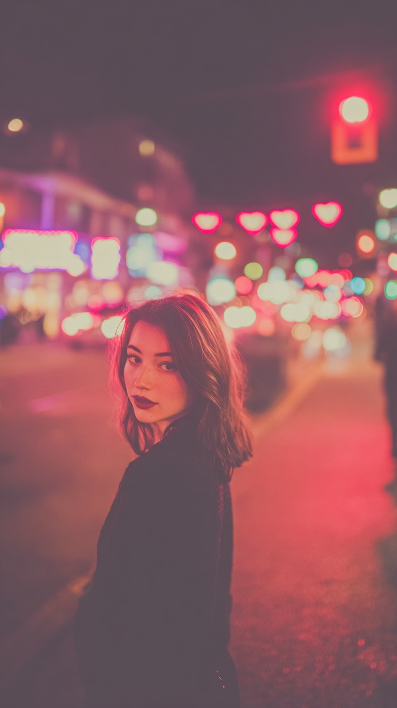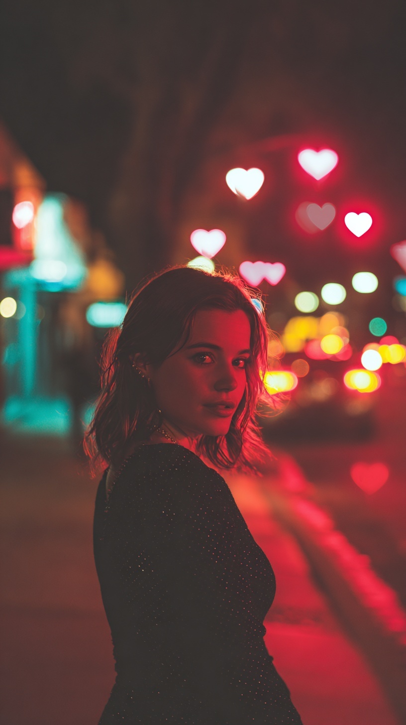 Ночной портрет: девушка оборачивается на оживлённой городской улице, её взгляд полон томления и ожидания. Сцена наполнена романтикой: неоновые сердечки, светофоры в форме сердец, розовые блики.