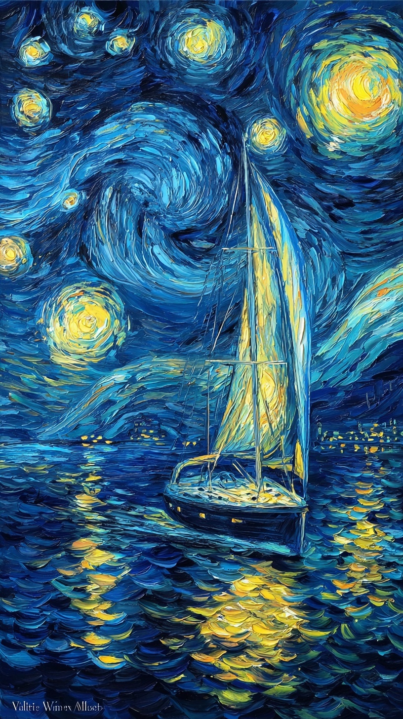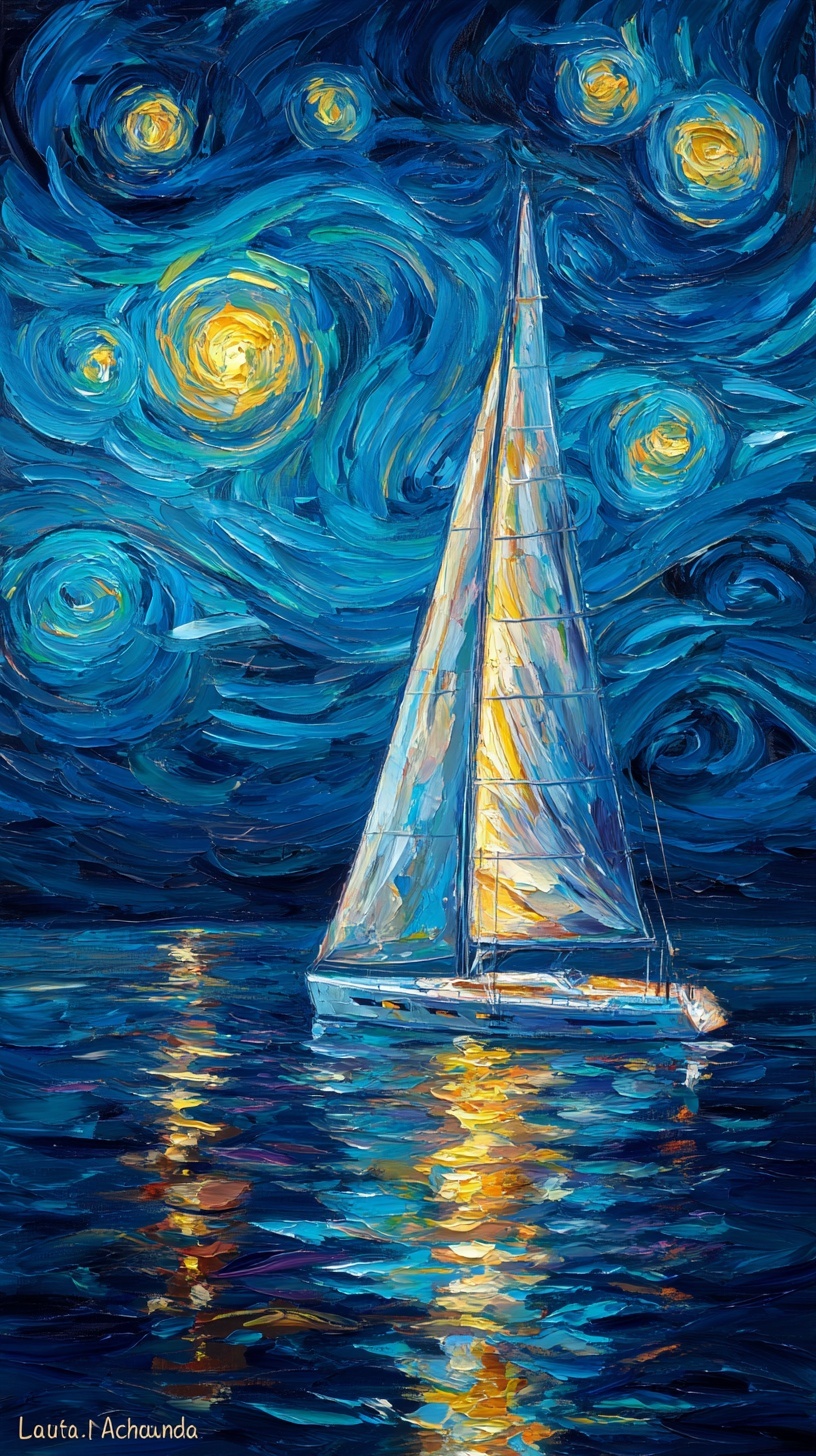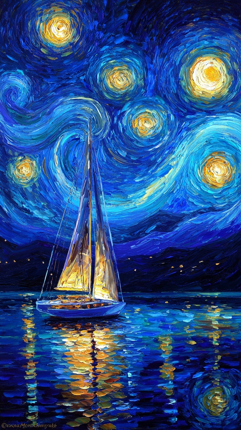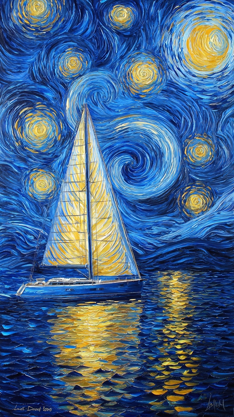 Картина маслом в стиле Ван Гога «Звездная ночь»: парусная яхта плывёт по ночному морю под вихревым небом