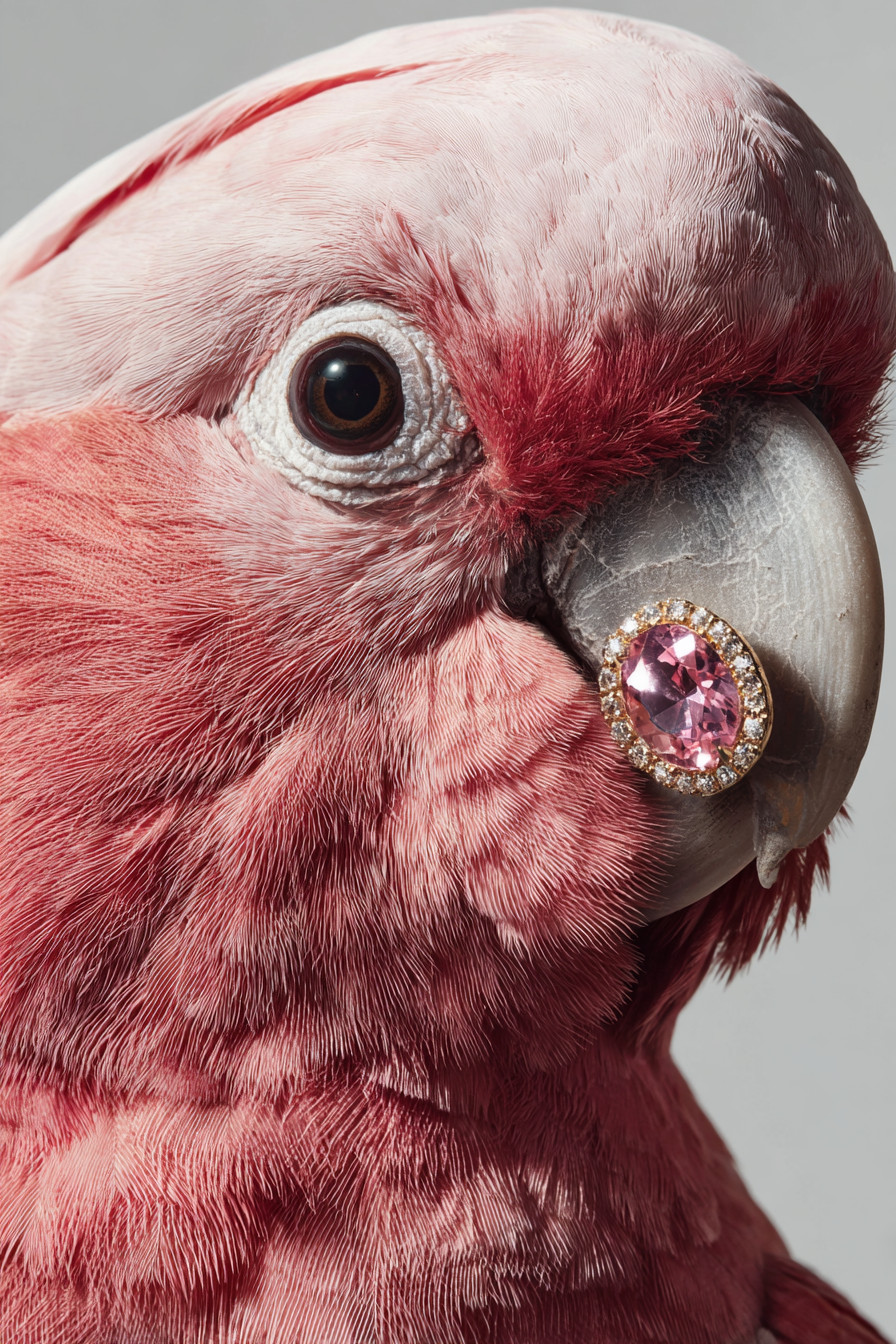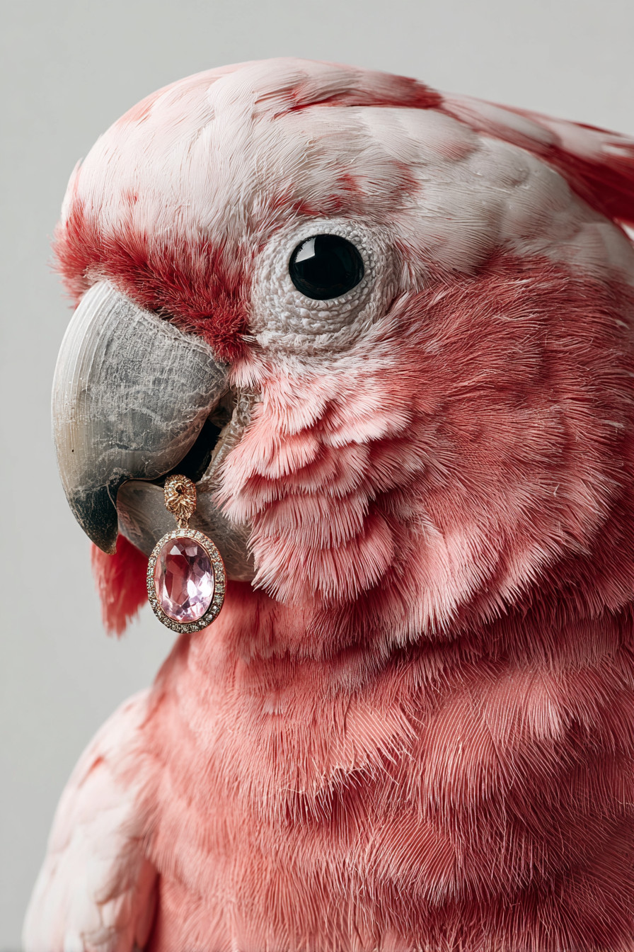 Студийное фото розового какаду в профиль крупным планом. Птица держит в клюве роскошную серьгу.