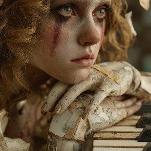 Женщина, в платье полностью состоящем из клавиш пианино. Состаренные белые клавиши украшены выцветшими мягкими пастельными цветами.