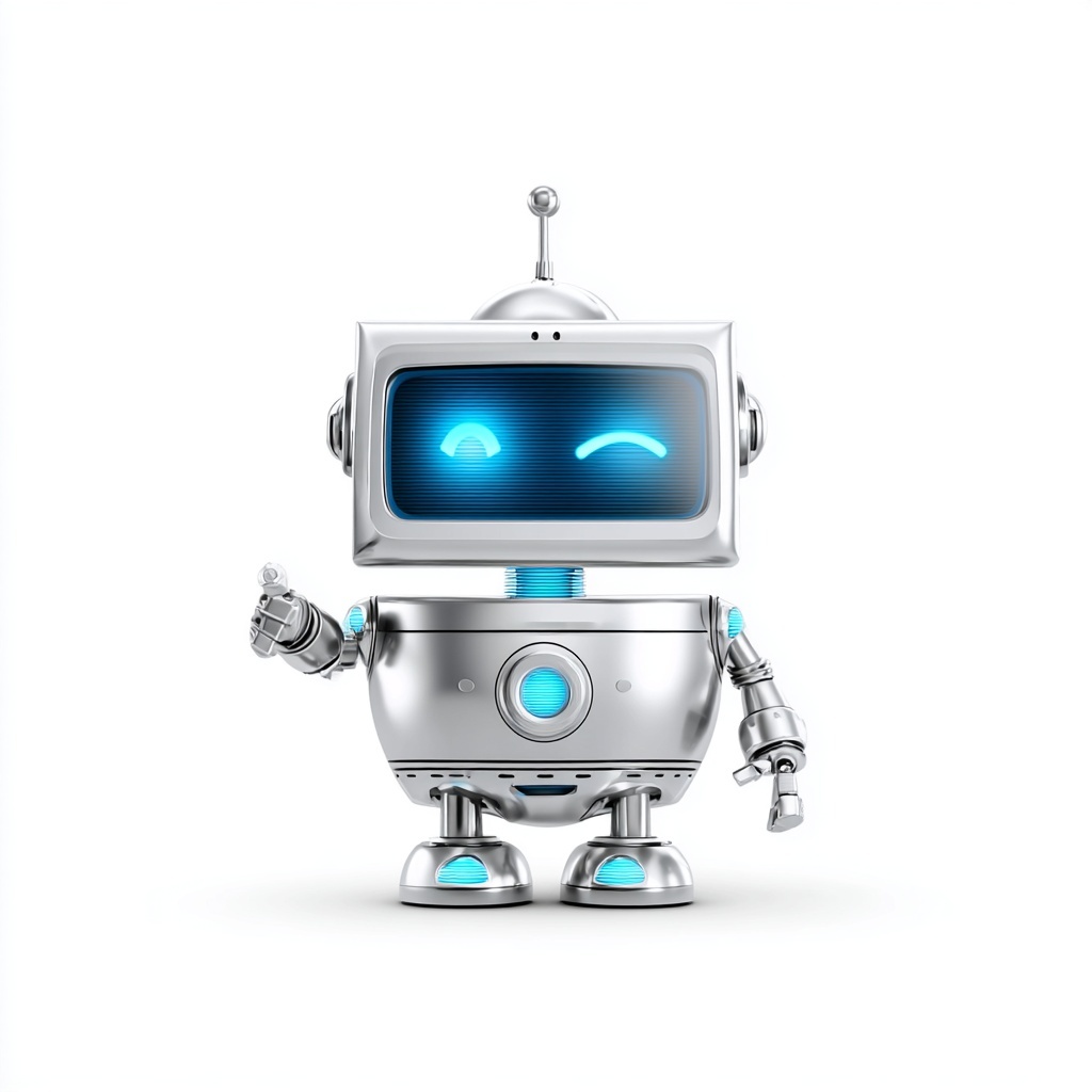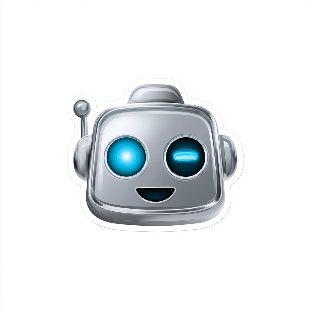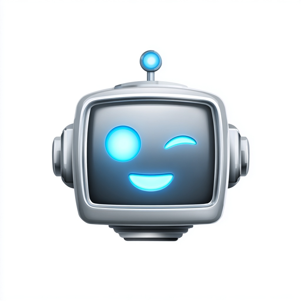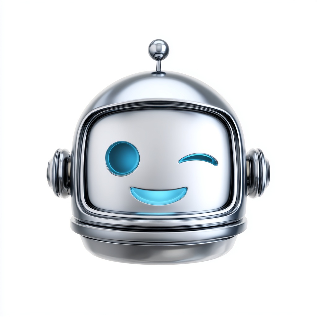 Дружелюбный робот-эмодзи с подмигивающим лицом из хрома и синей подсветки.