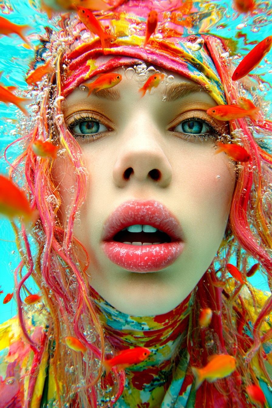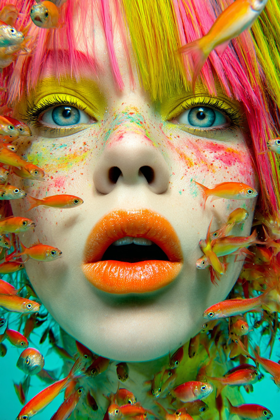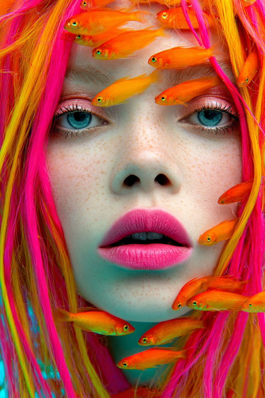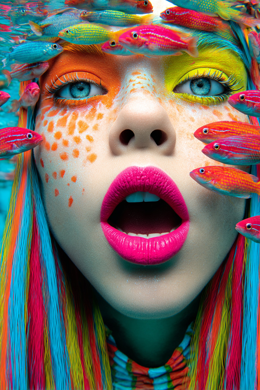 Женщина с длинными разноцветными волосами парит под водой, вокруг её лица плавают десятки маленьких рыбок. Яркие насыщенные цвета в стиле Майлза Олдриджа.