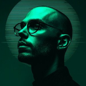 Портрет мужчины с бритой головой, в тонких очках, прямой взгляд. Тёмный фон, мягкое зелёное CRT свечение, слабое глитч-эхо.