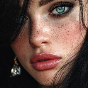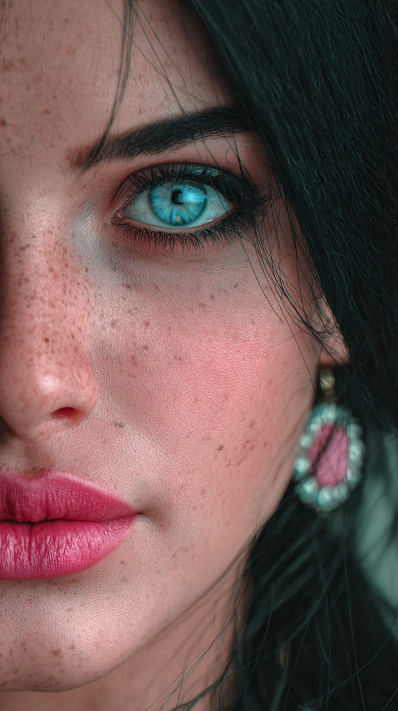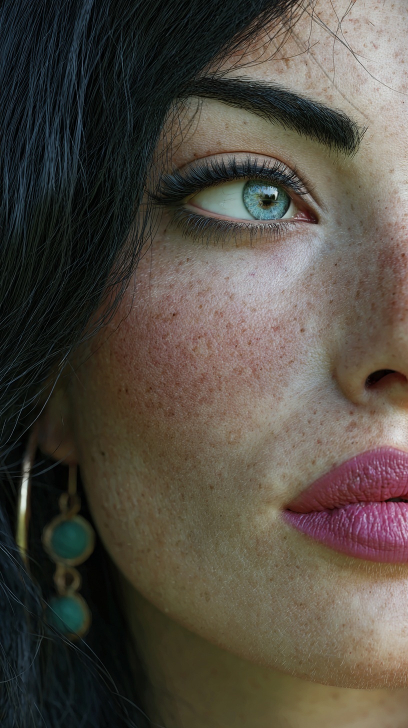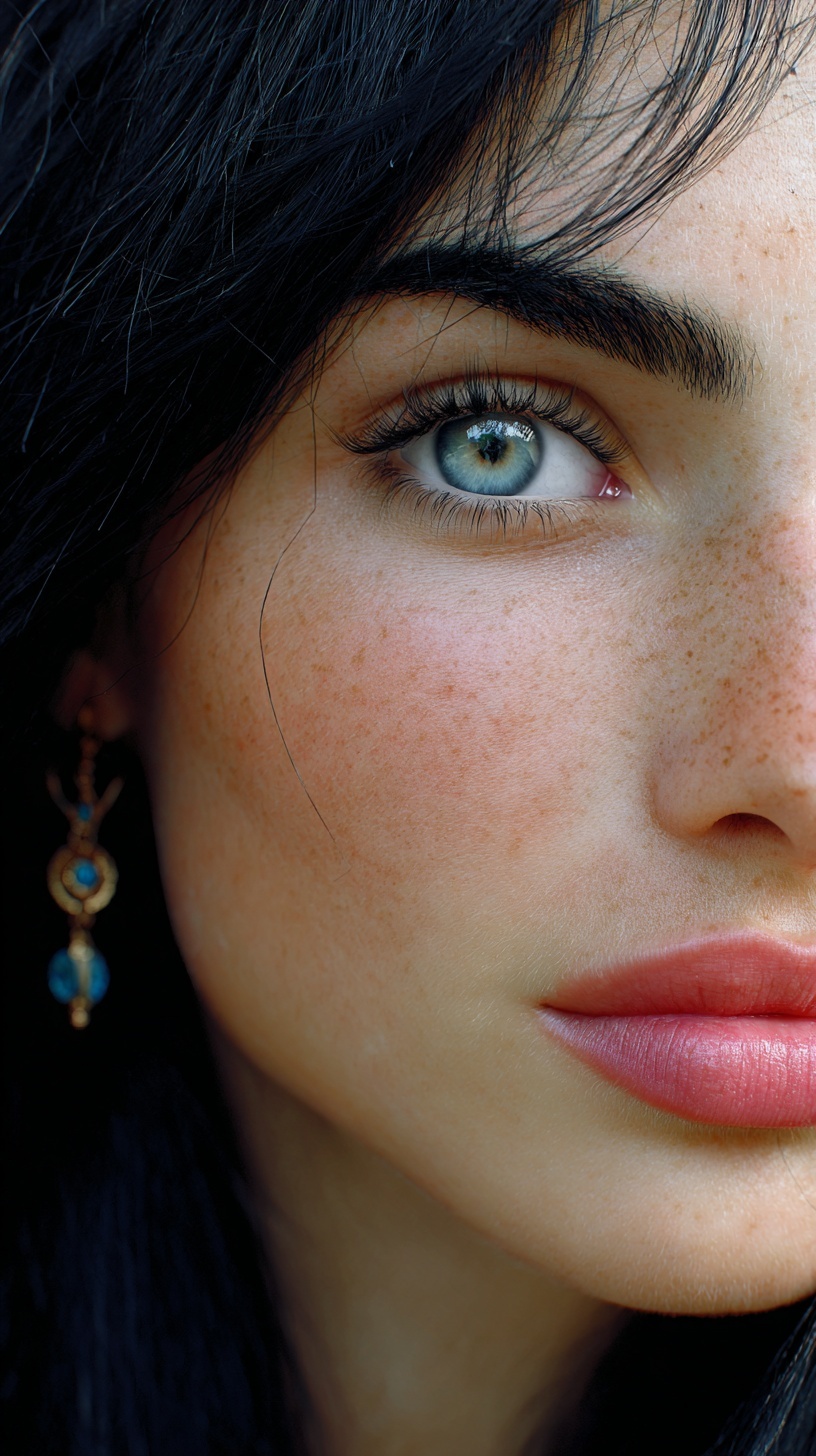 Крупный план красивой итальянки. Длинные чёрные волосы, сине-зелёные глаза, чёрные брови, пухлые розовые губы, лёгкие веснушки, серьги.