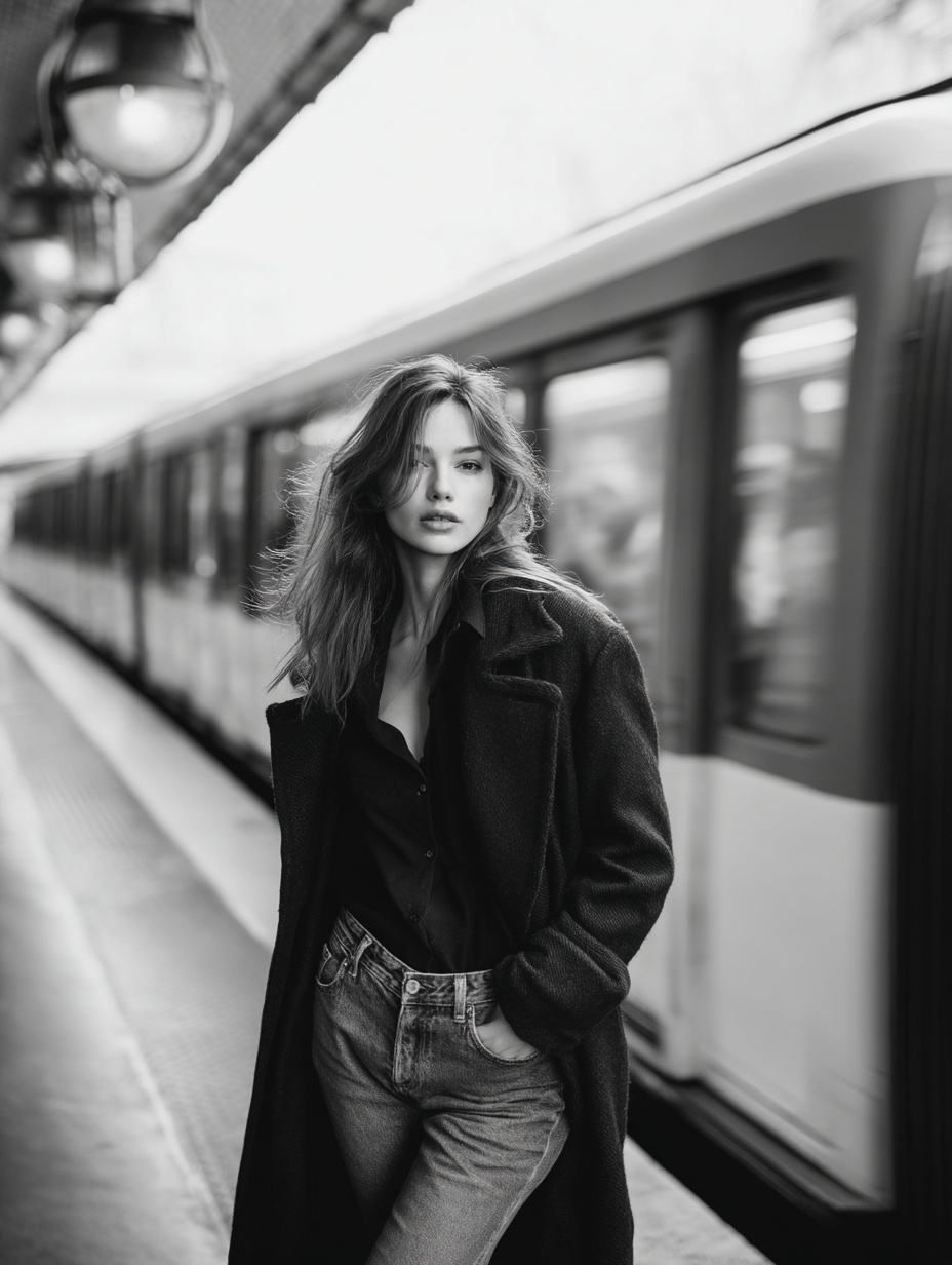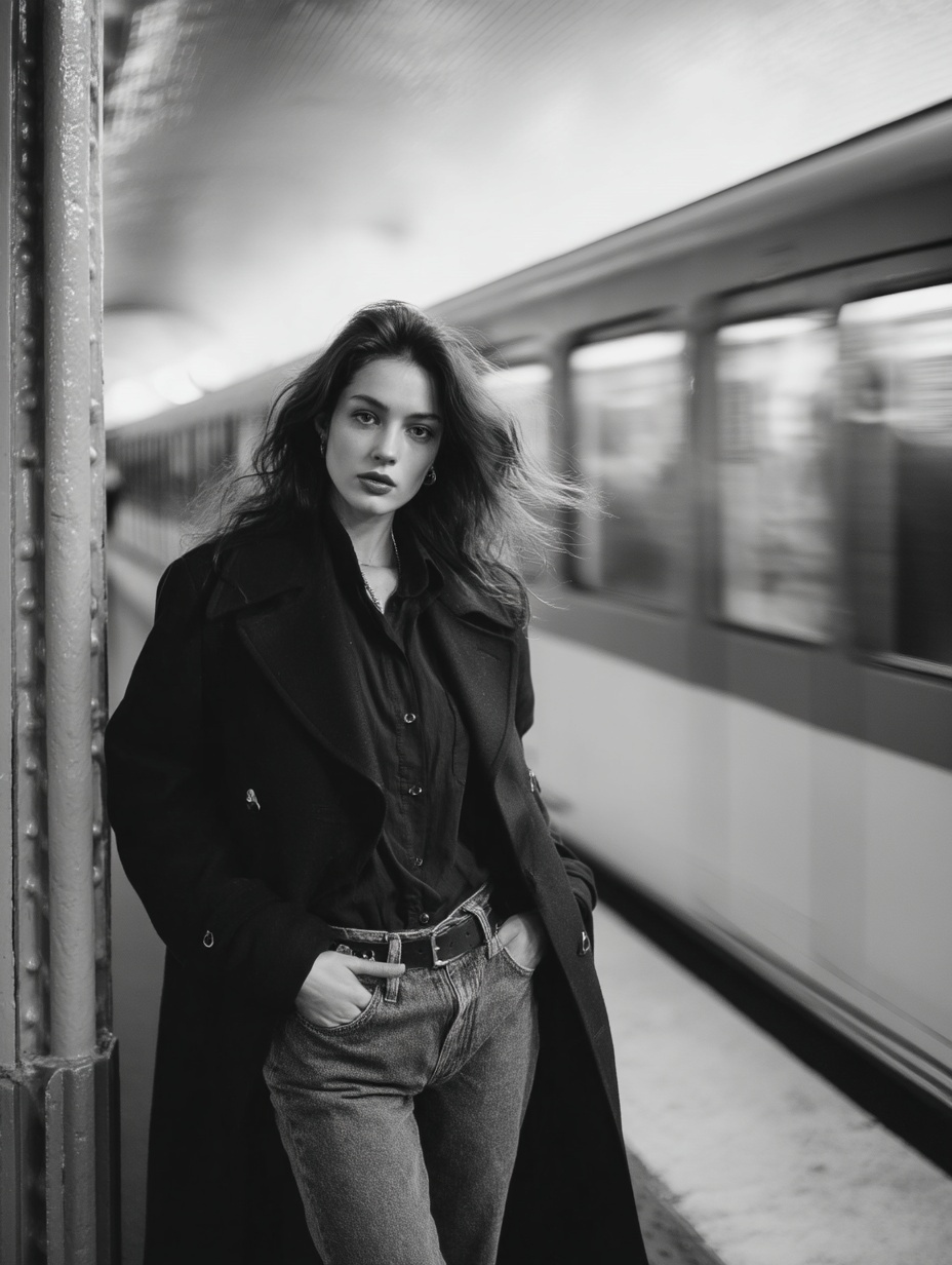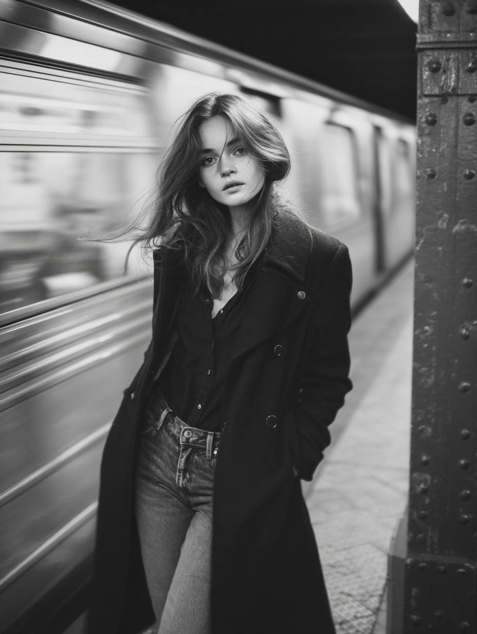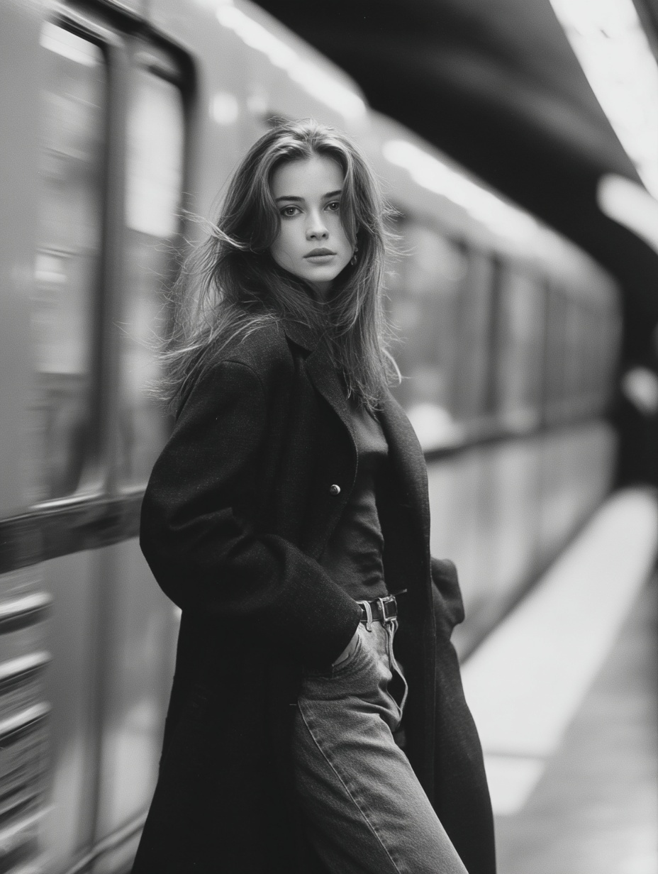 Чёрно-белая фотография модели в метро в стиле Хельмута Ньютона. Движение поезда на фоне, развевающиеся волосы, тёмное пальто.