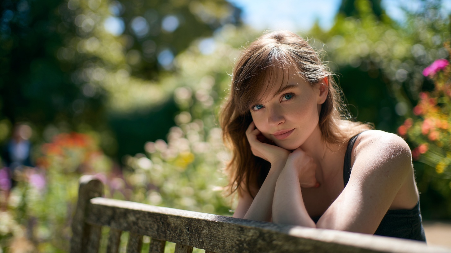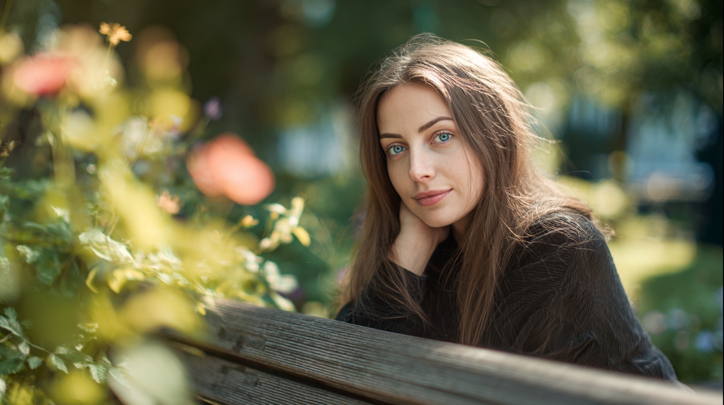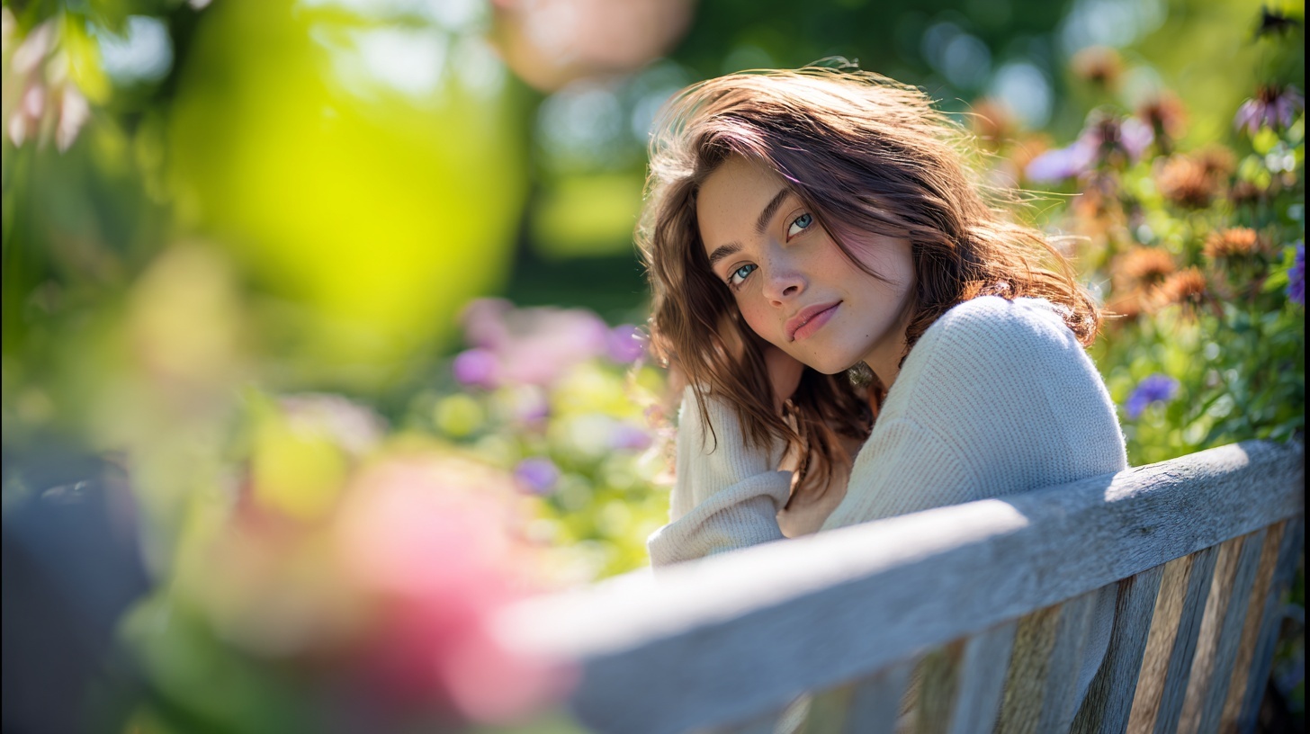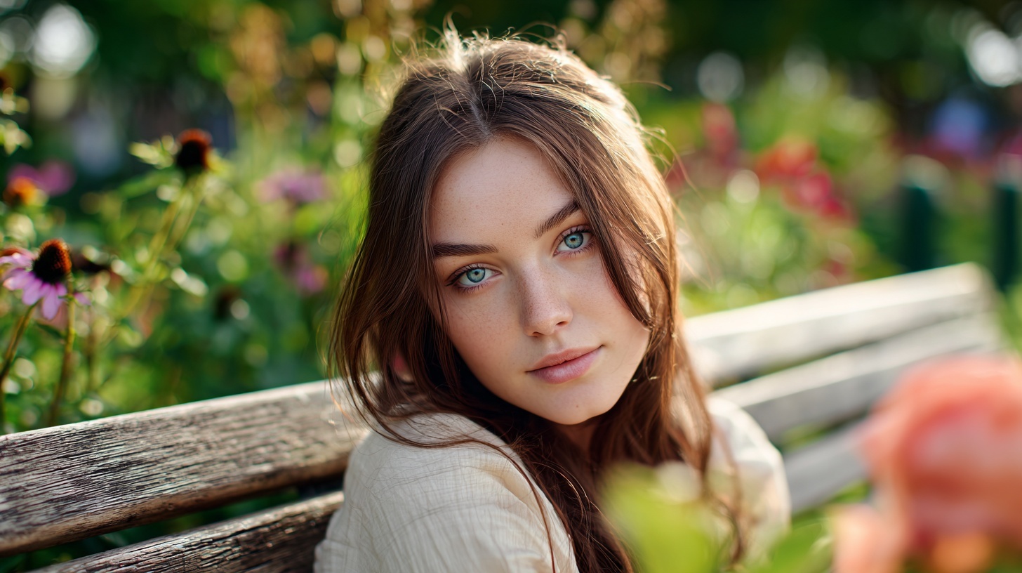 Молодая женщина с каштановыми волосами и голубыми глазами сидит на деревянной скамье в парке, окруженная зеленью и цветами.