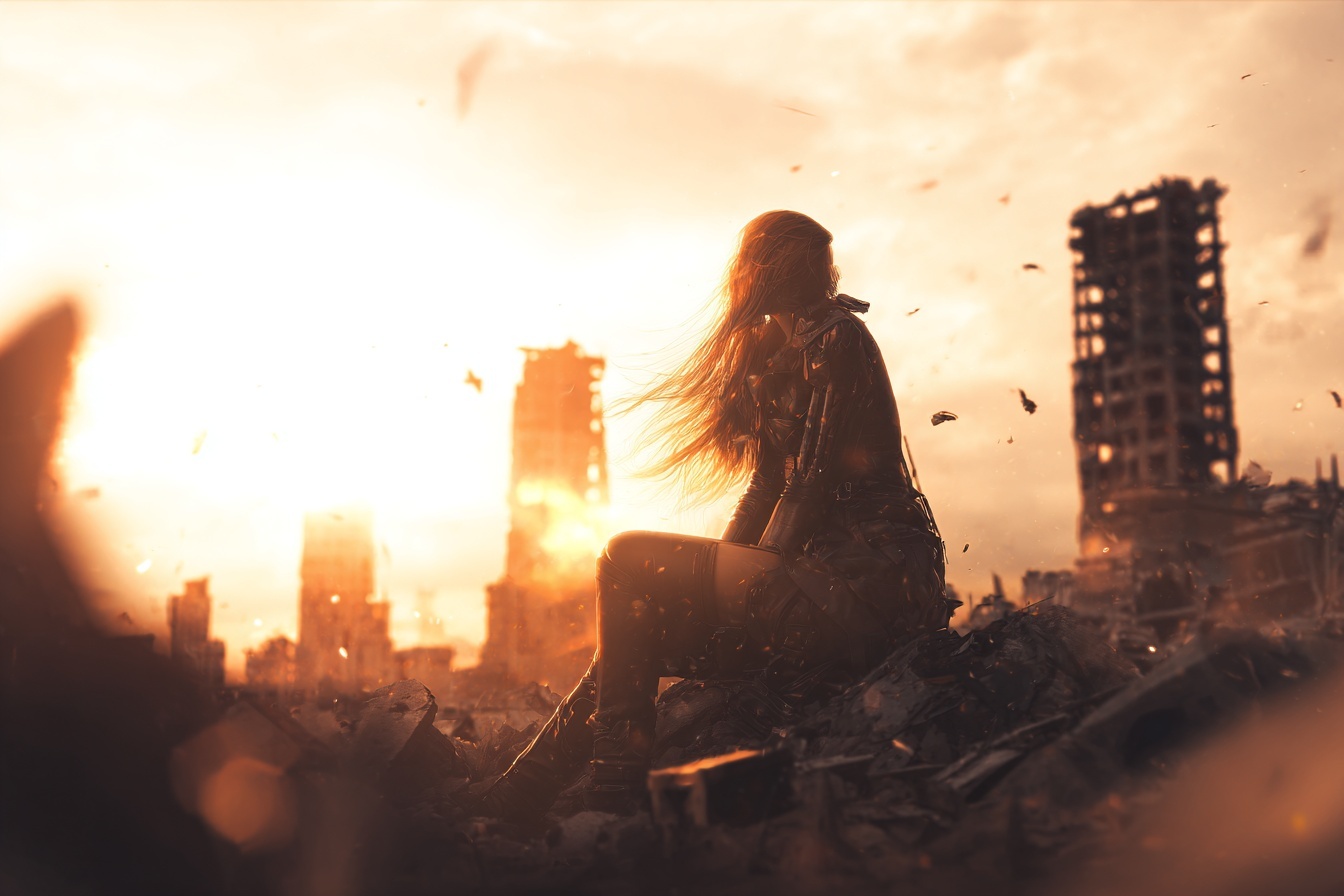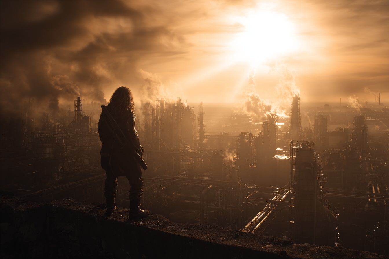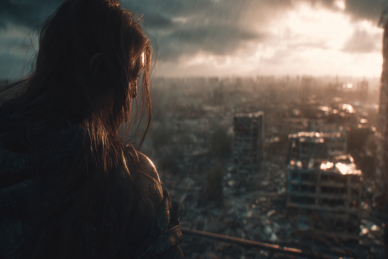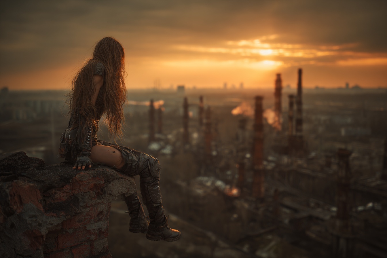 Вид бескрайнего разрушеного города в тёмном sci-fi стиле.
