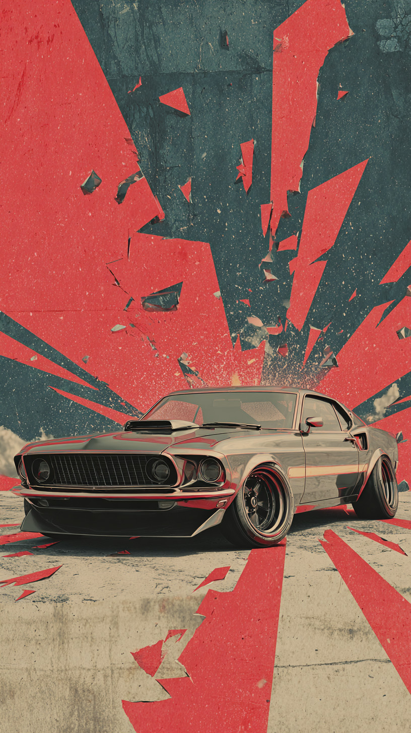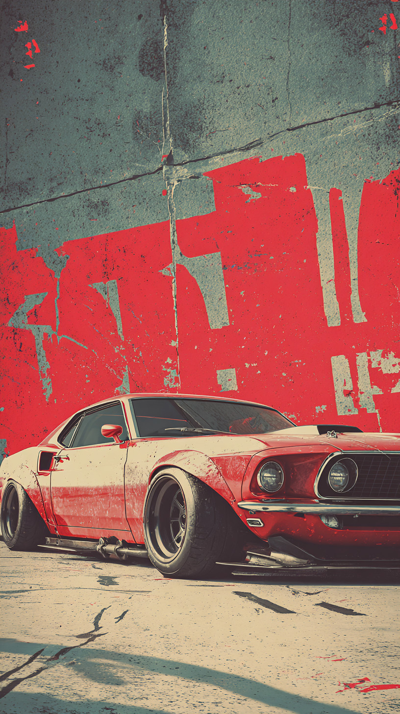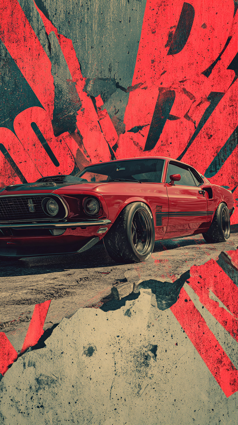 Ford Mustang Fastback 1969 года. Палитра красного, чёрного и бежевого, эстетика постера.