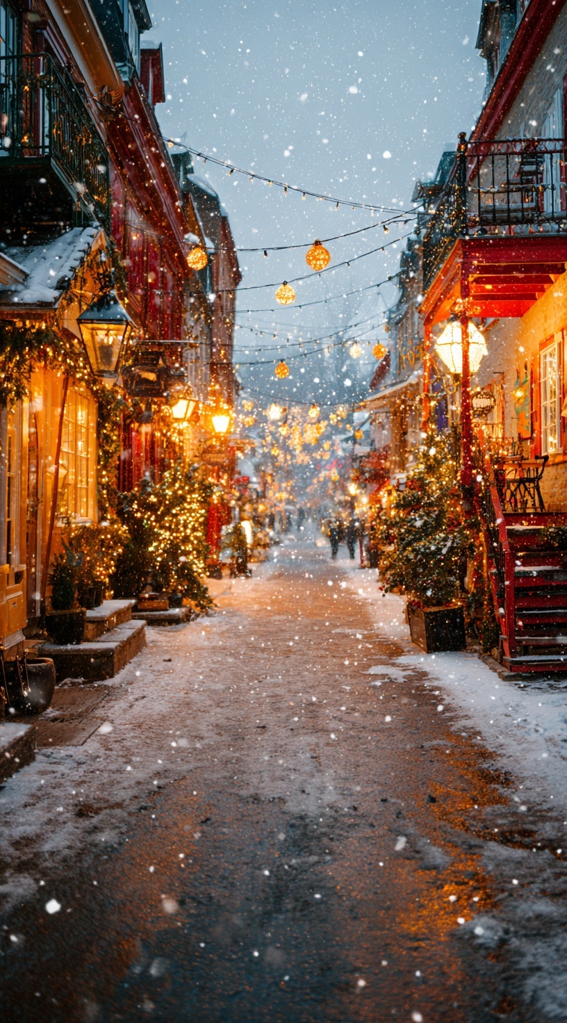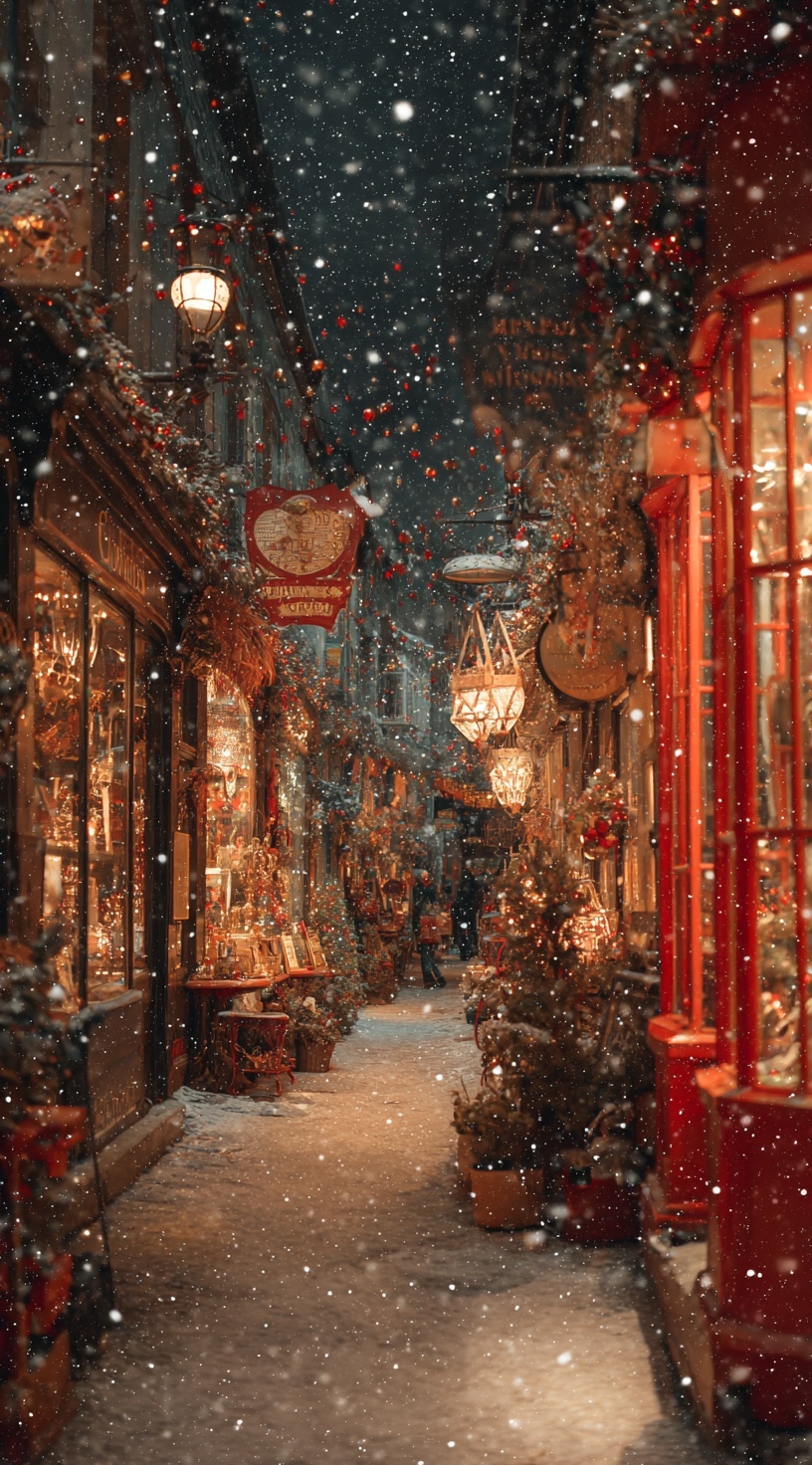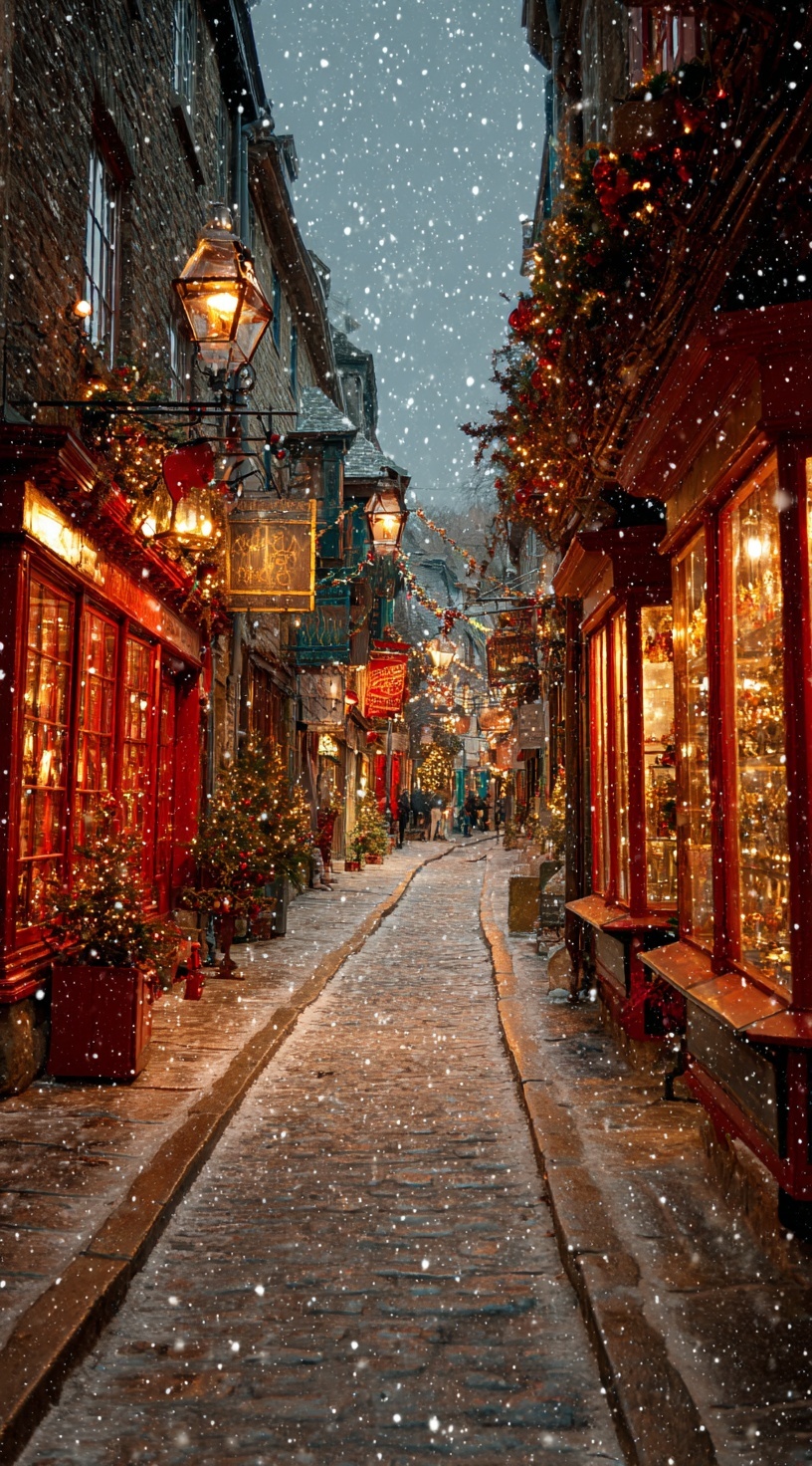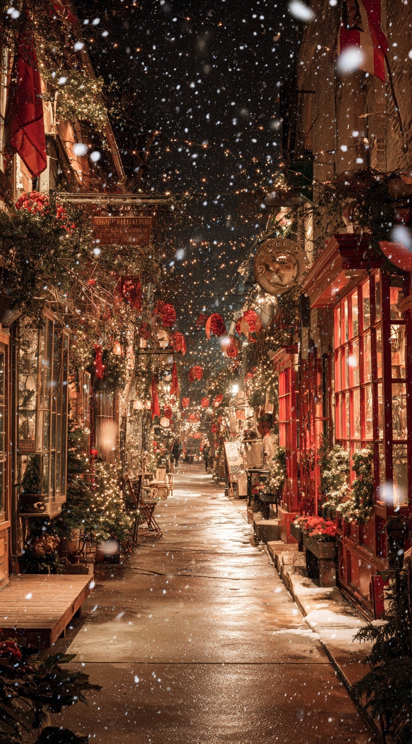 Уютная улица с винтажными магазинами в рождественском убранстве. Красные и золотые украшения, мерцающие гирлянды, падающий снег.