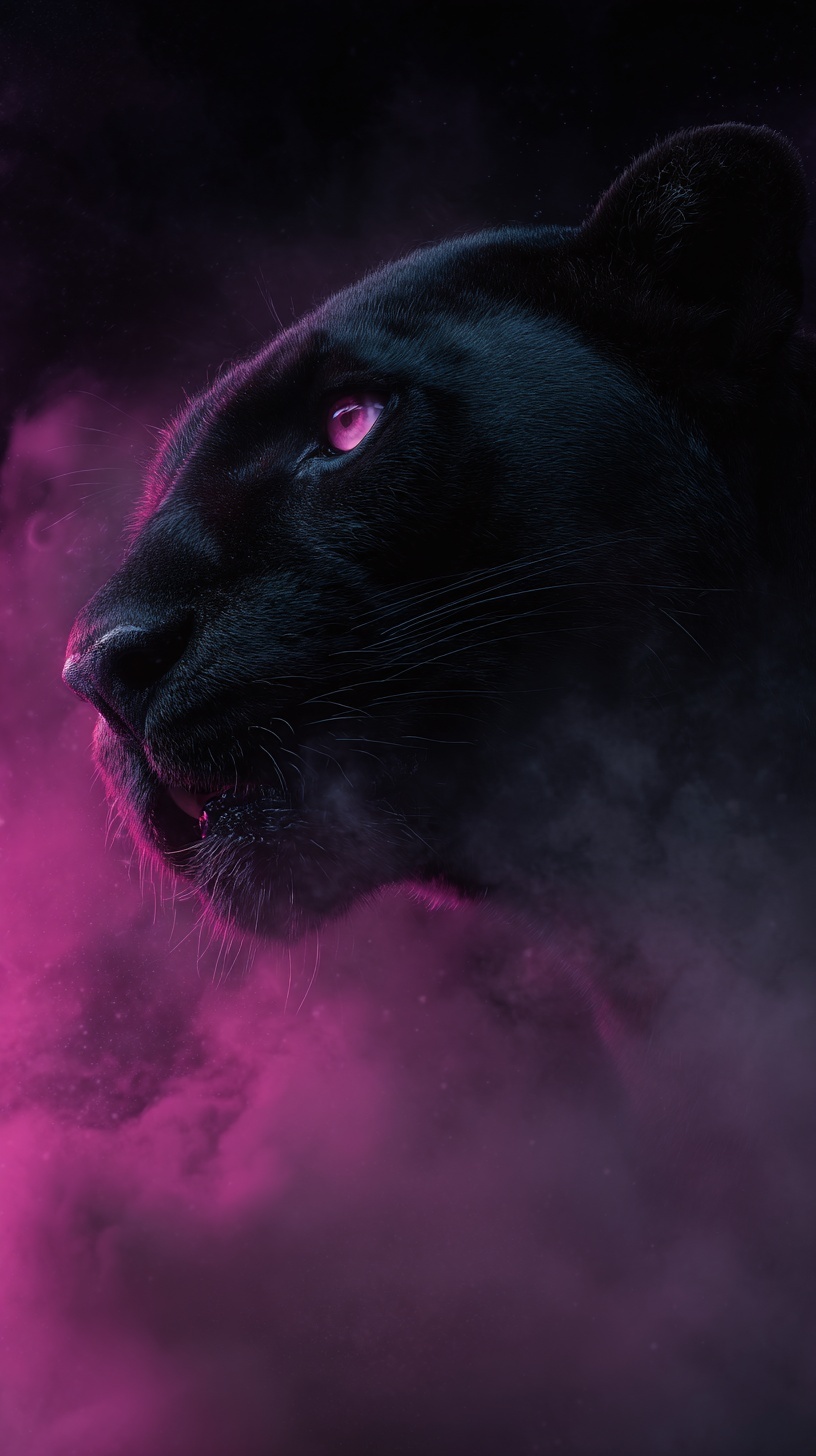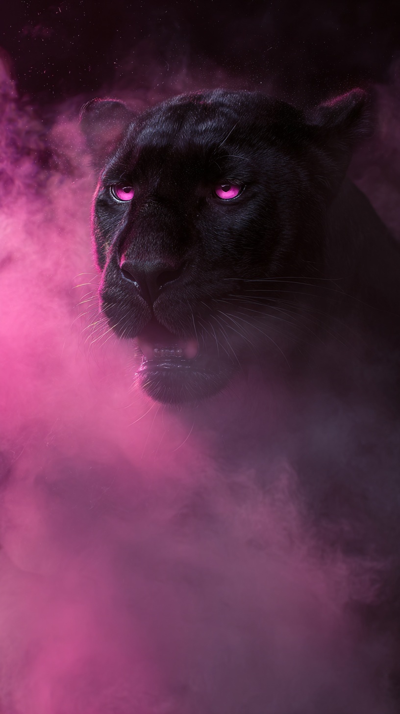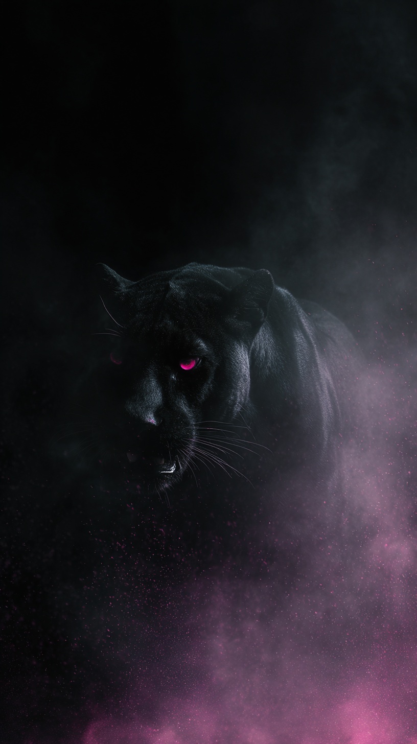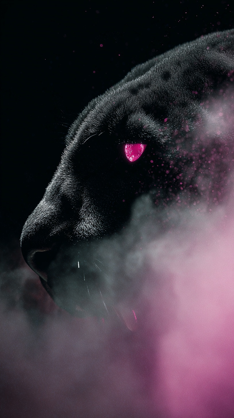 Чёрная пантера в темноте с светящимся розовым глазами. Туман, неоновые акценты.