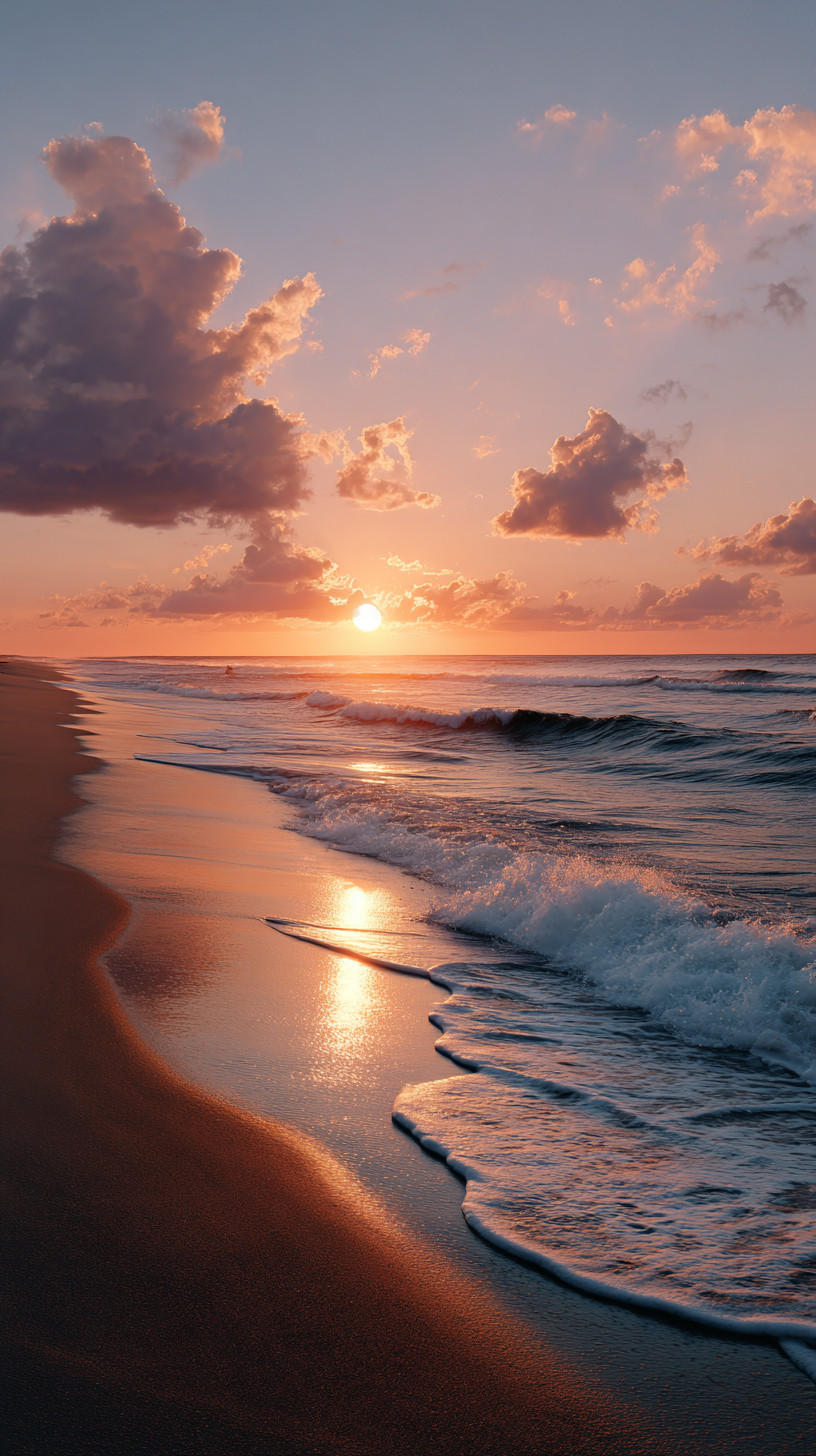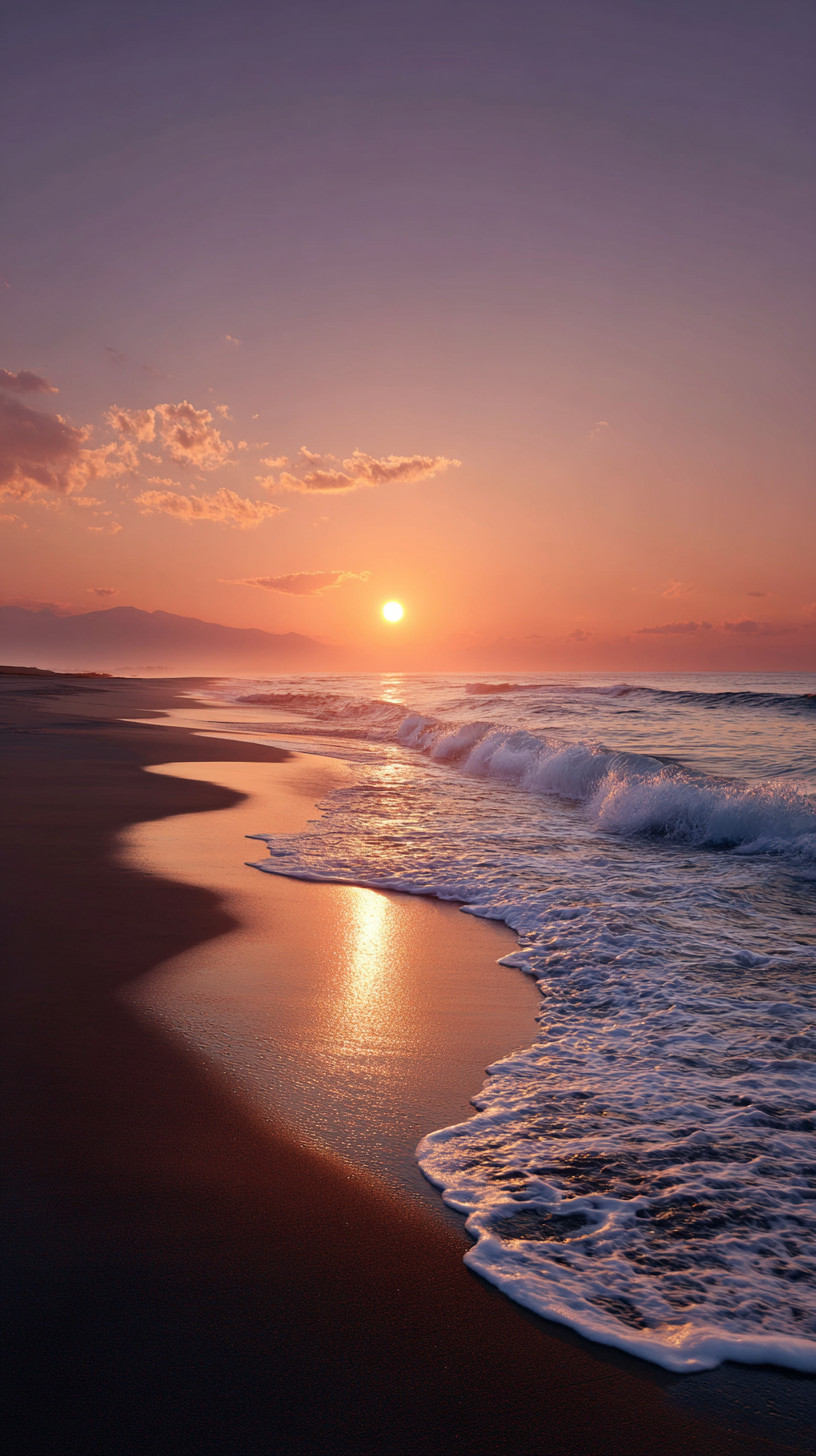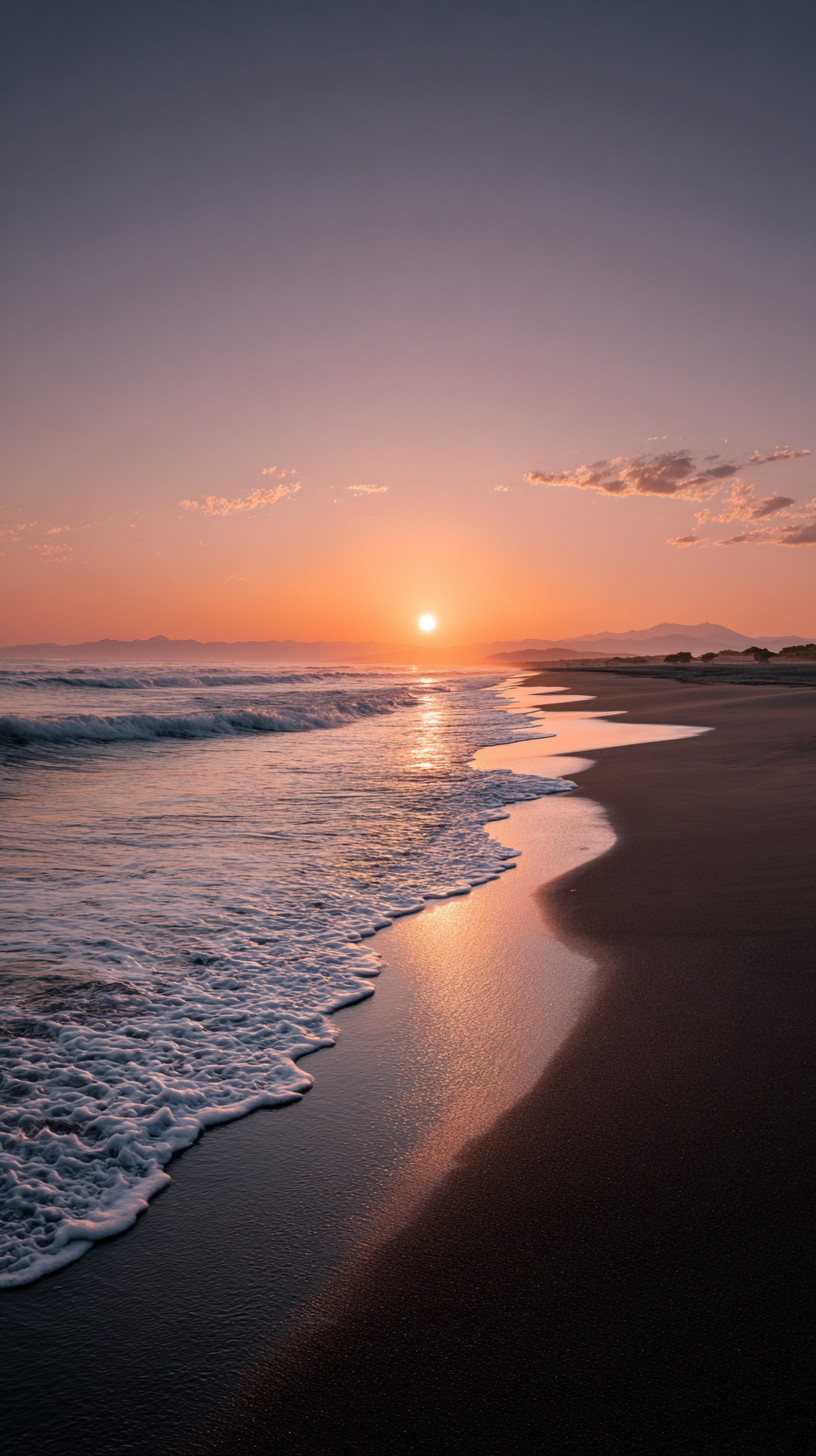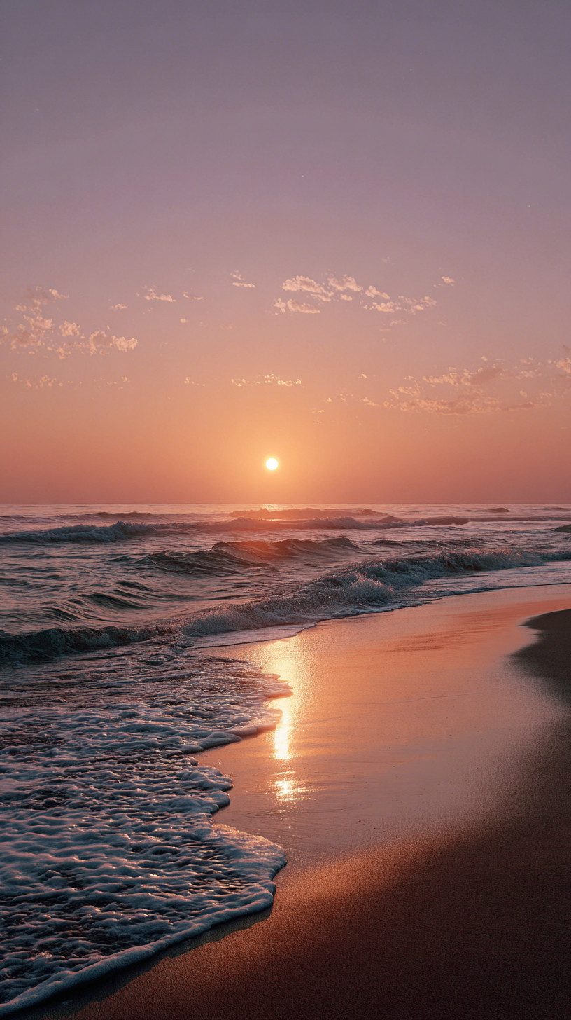 Фотография пустого пляжа на закате. Солнце наполовину скрыто за горизонтом, тёплый оранжевый и мягкий фиолетовый свет окрашивают небо и море.