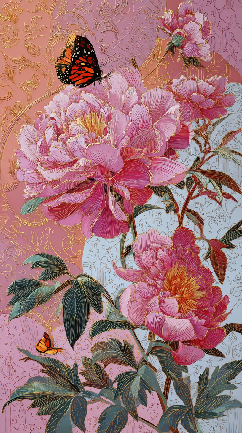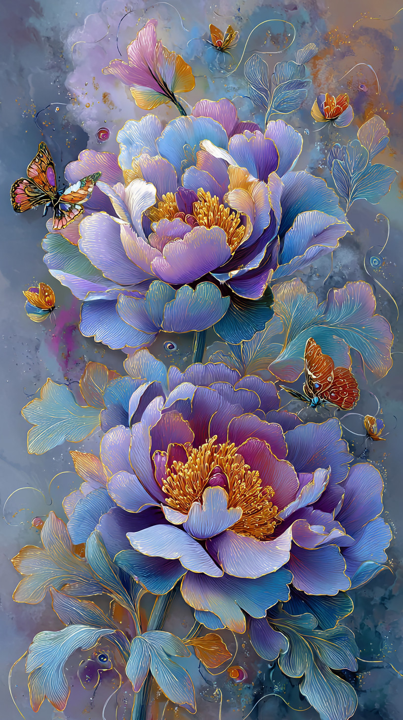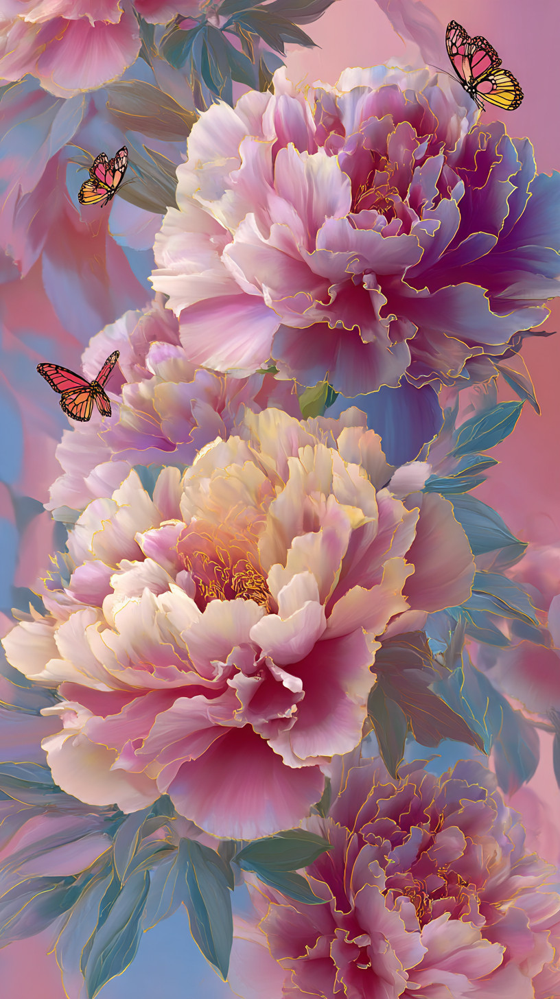 Цветущие пионы с лепестками-радугой, переливающиеся семью цветами. Золотые нити очерчивают края, порхают разноцветные бабочки.